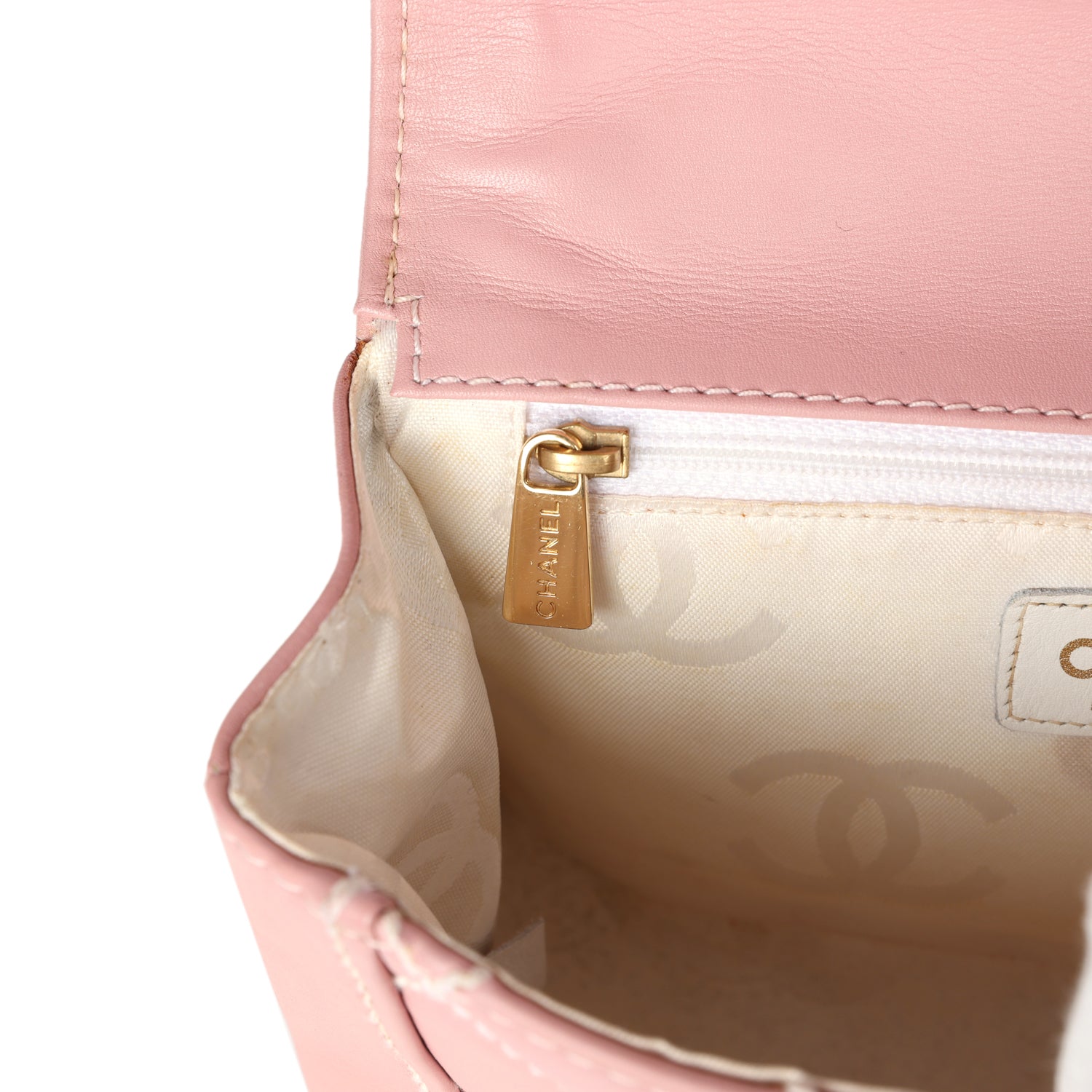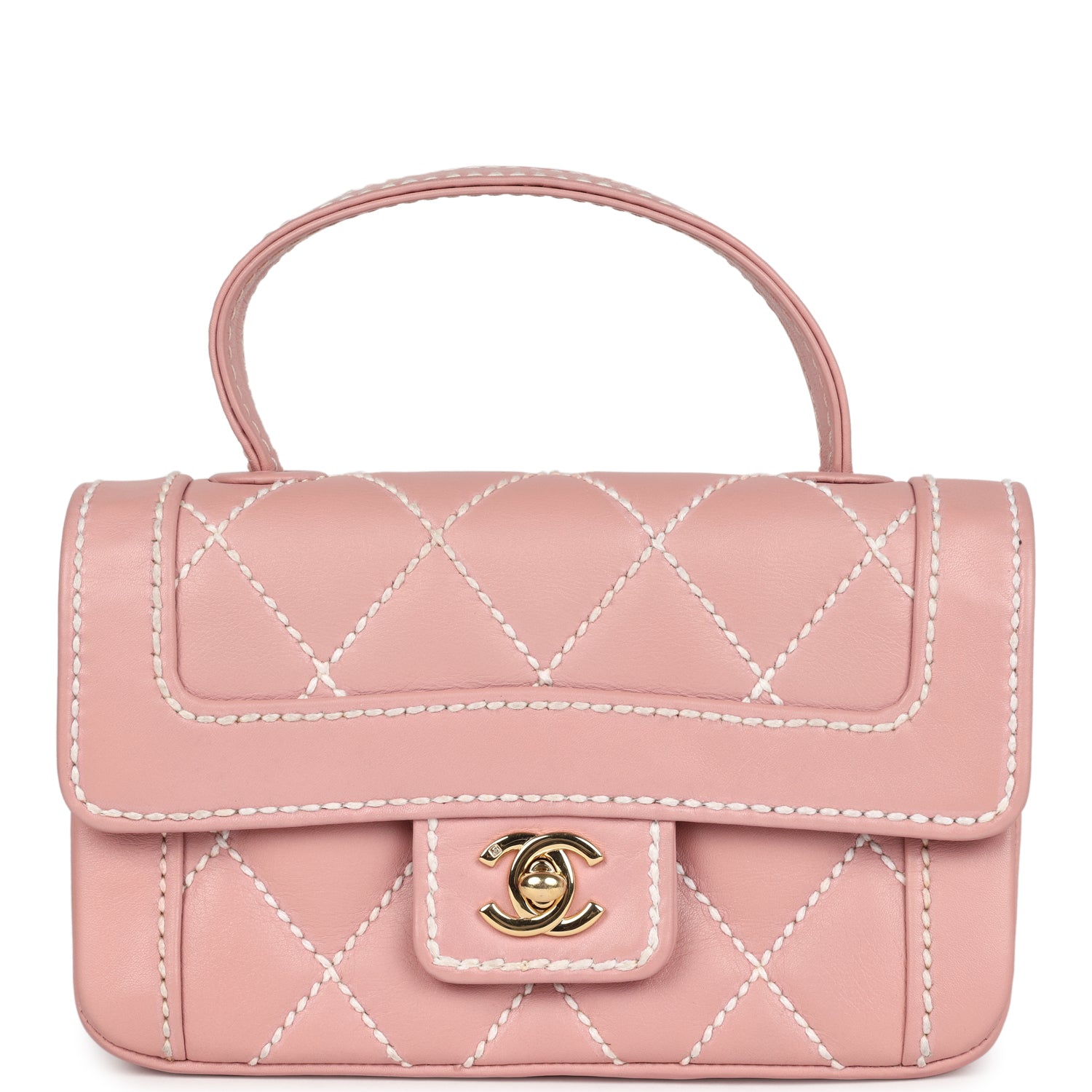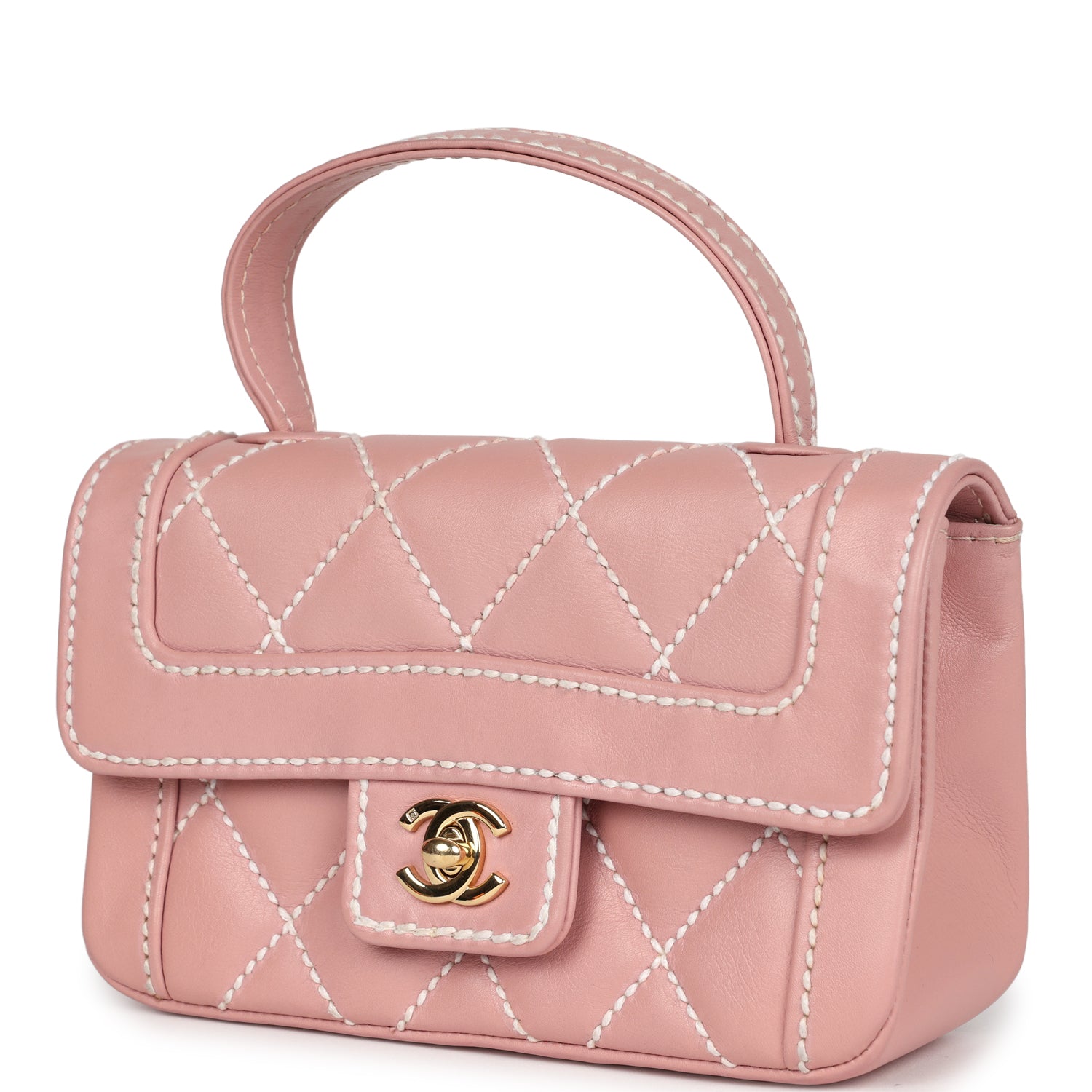 This Vintage Chanel Mini Wild Stitch Surpique Top Handle flap bag is of pink calfskin leather with gold hardware. featuring large contrast white stitching throughout to exterior. front CC turnlock closure. a back exterior pocket and a flat leather top handle.