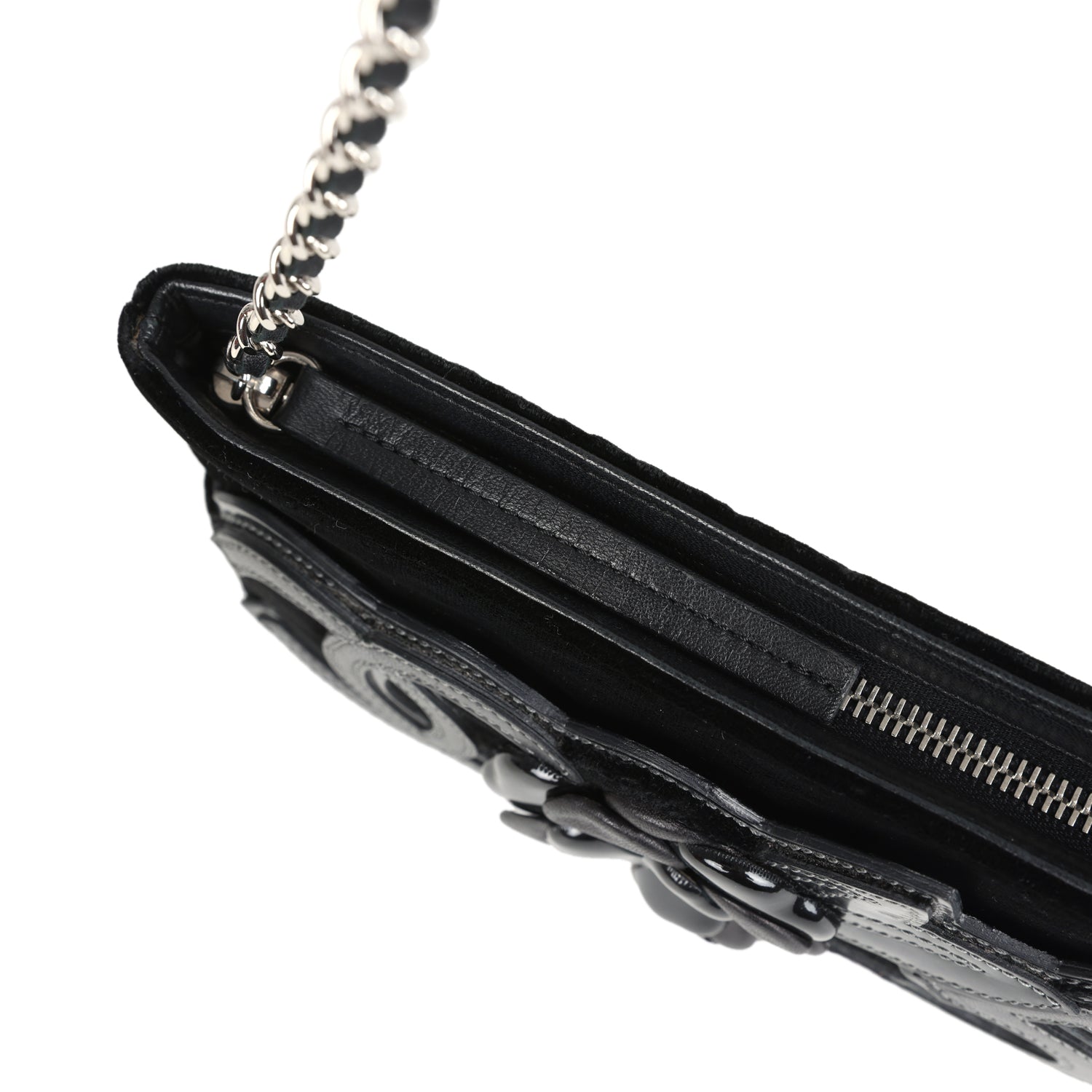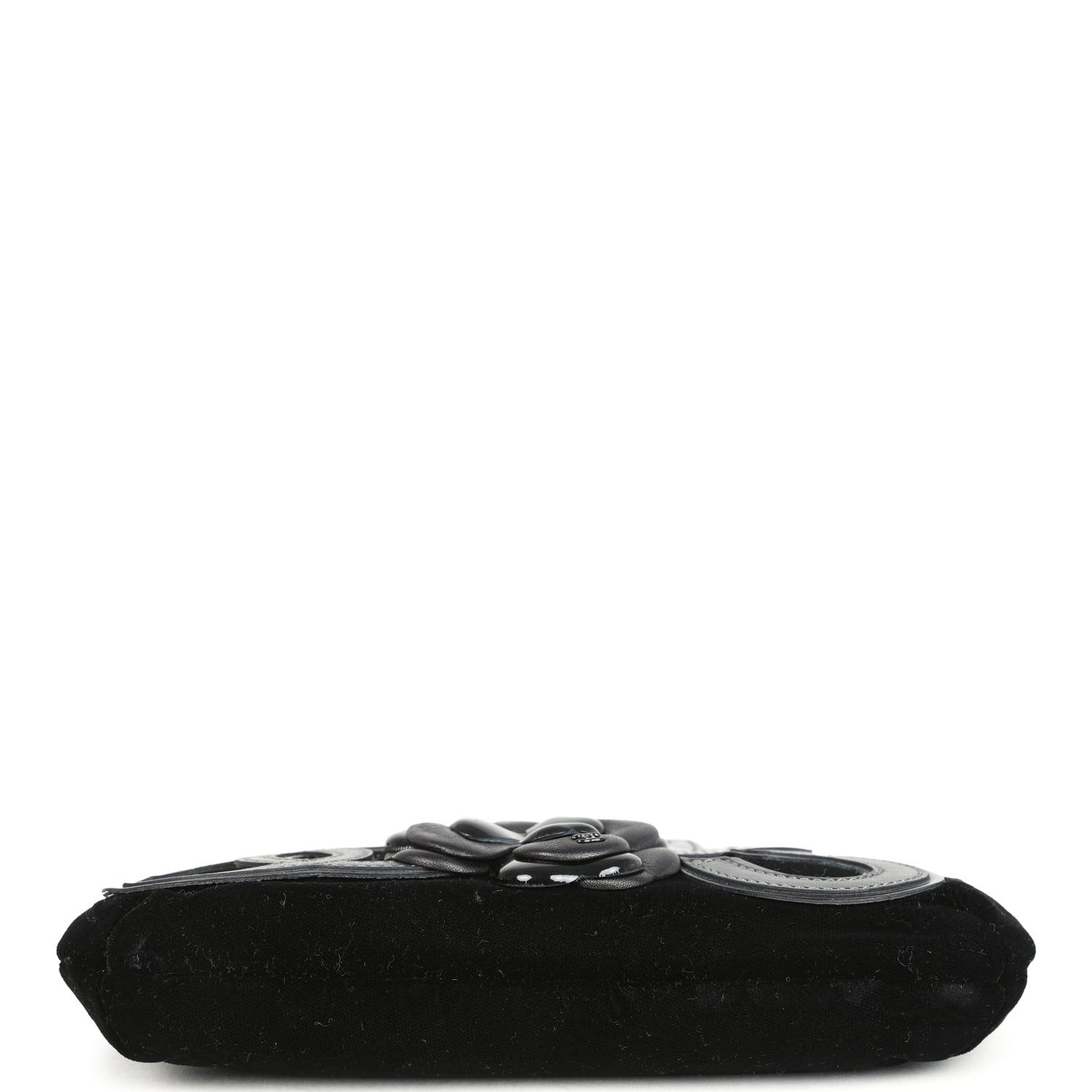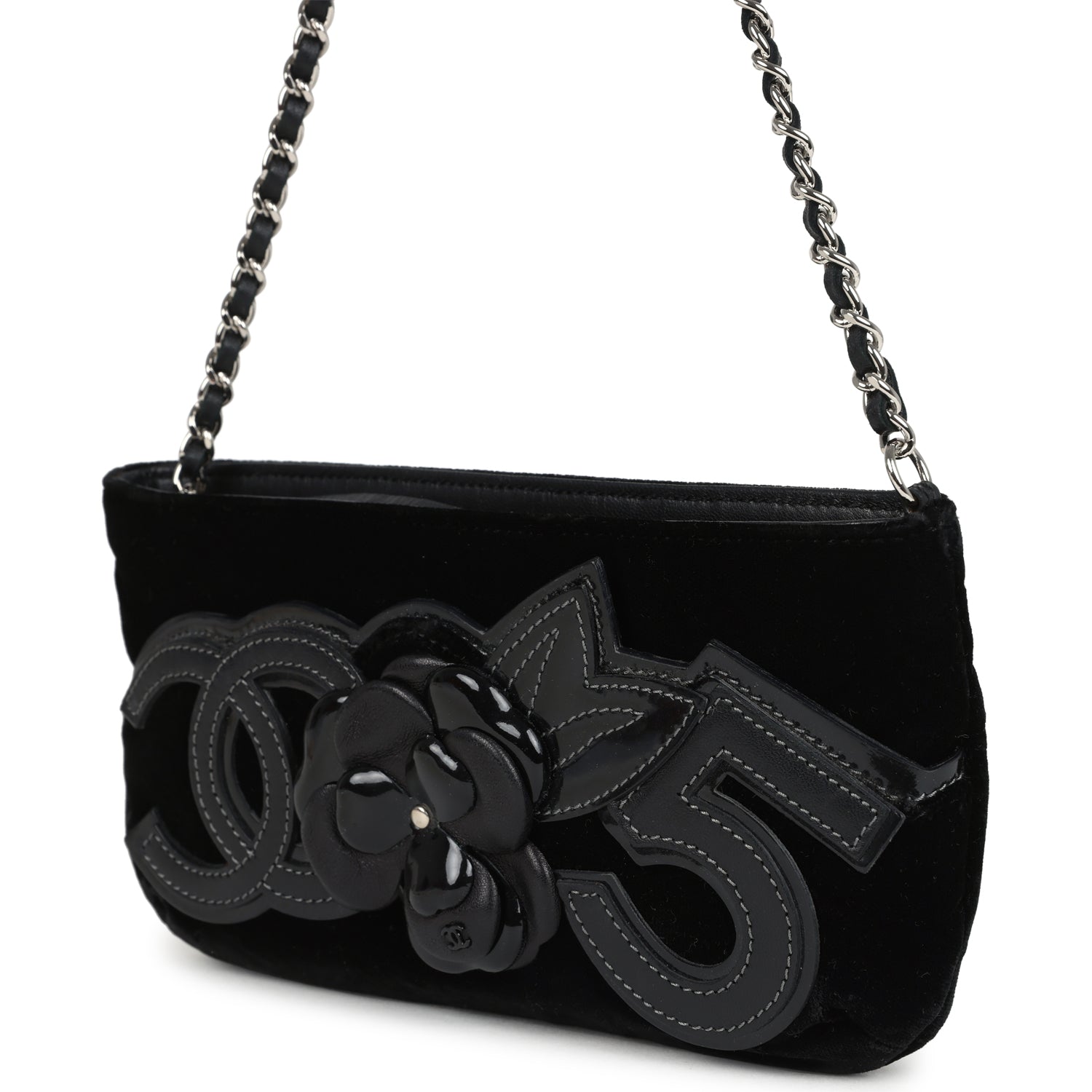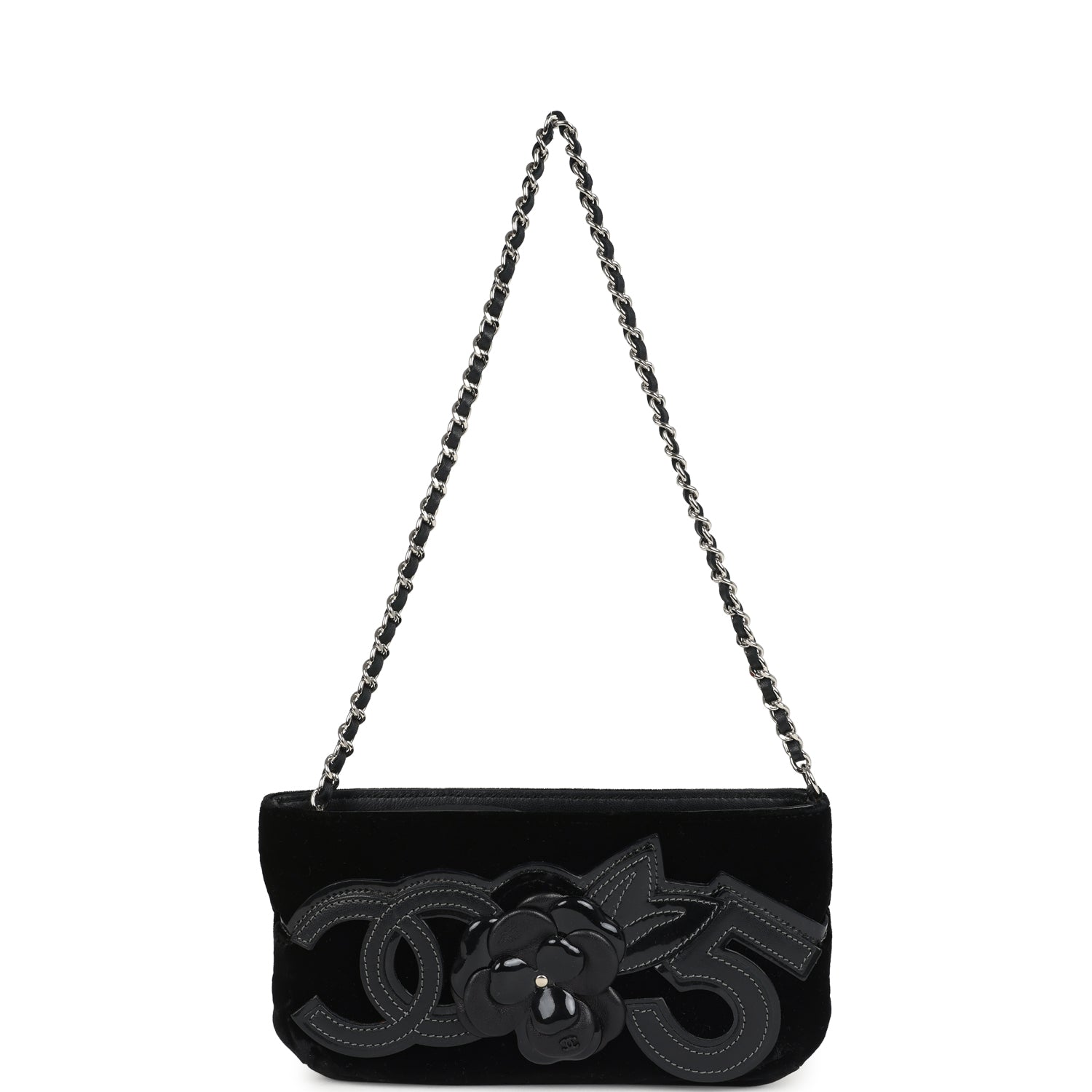 This Vintage Chanel No. 5 Camelia Pochette Bag is in Black Velvet with Silver tone hardware. featuring a open front pocket with an embroidered black patent and leather CC. No.5. and signature Camelia flower. a zipper closure. and a single Interwoven Silver tone and black leather pochette/shoulder strap.