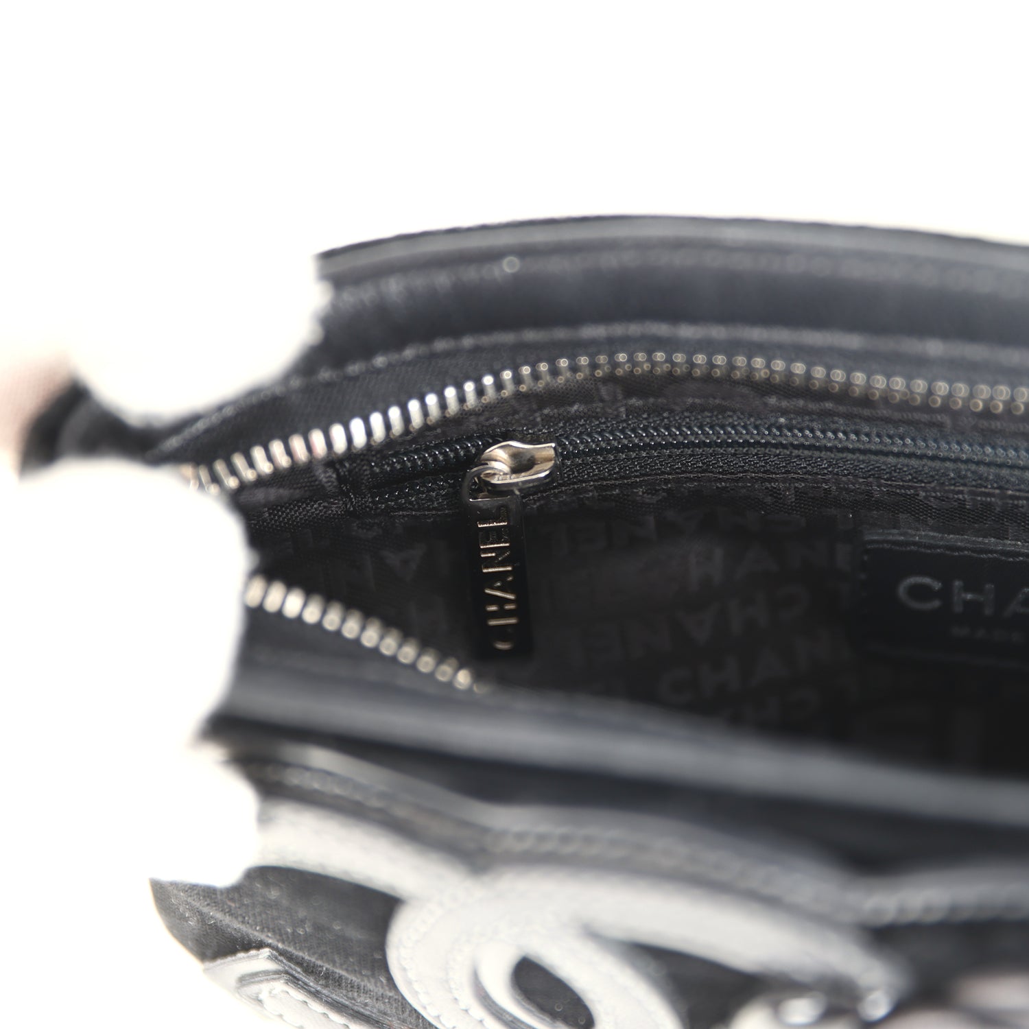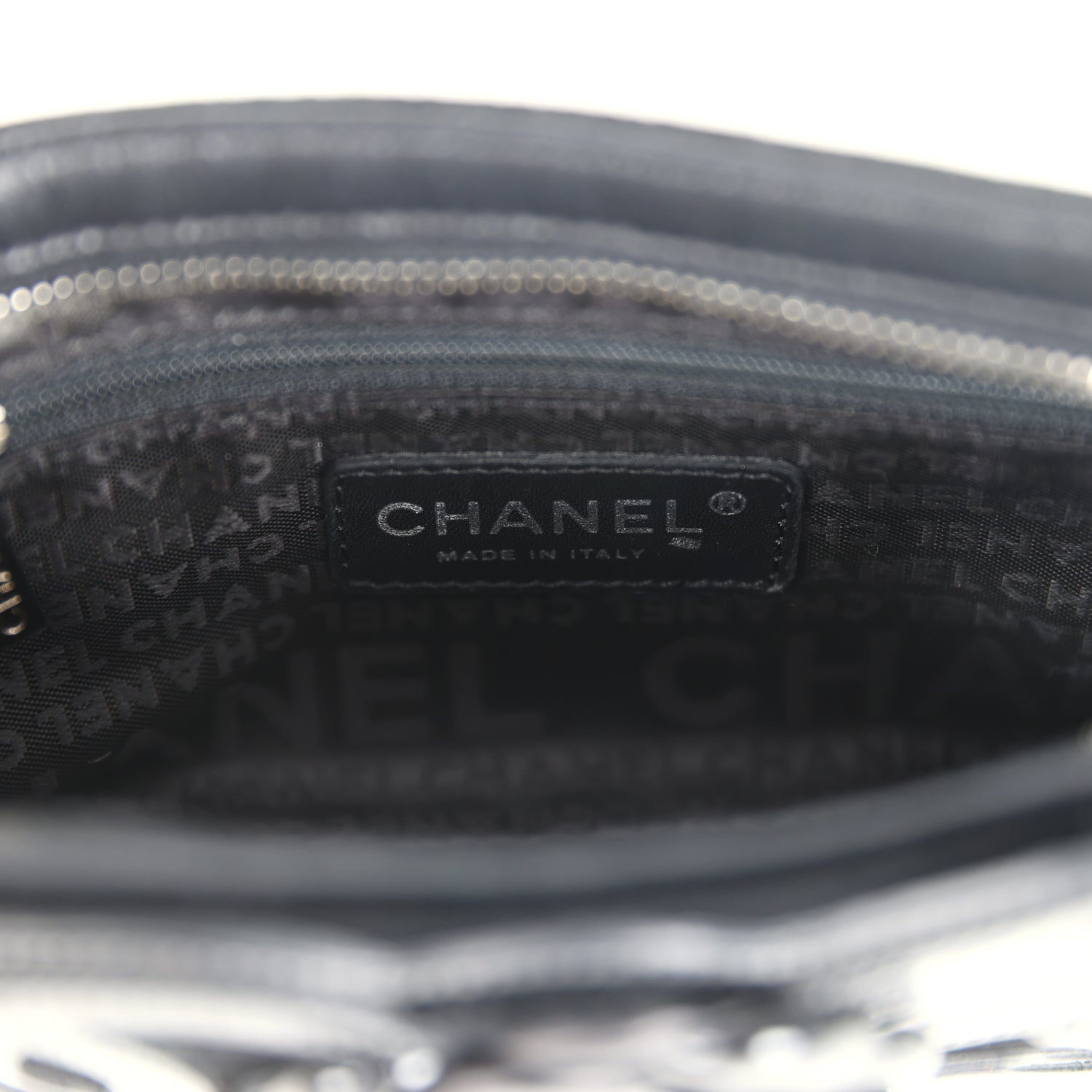 The interior is lined in Black Logo grossgrain fabric and has a zip pocket on the rear wall with logo pull.