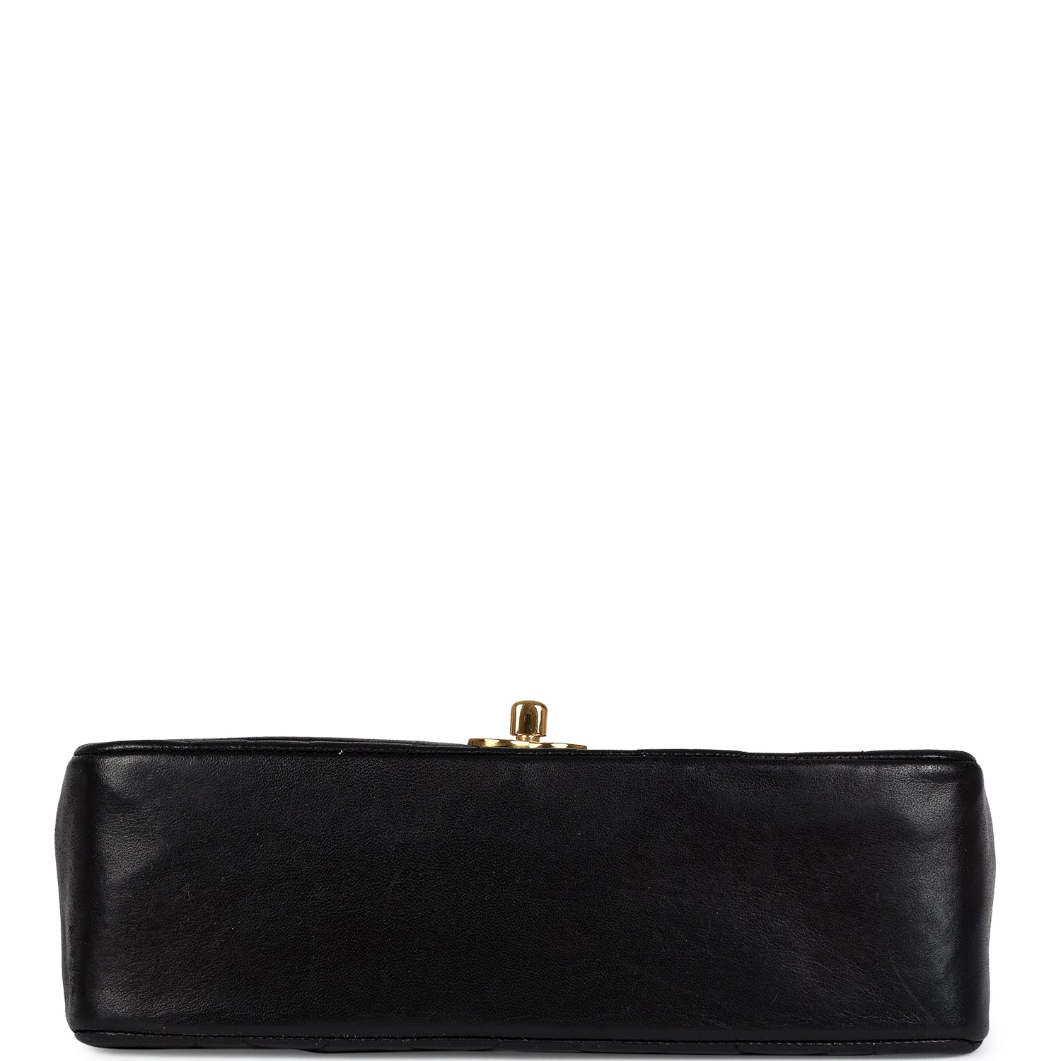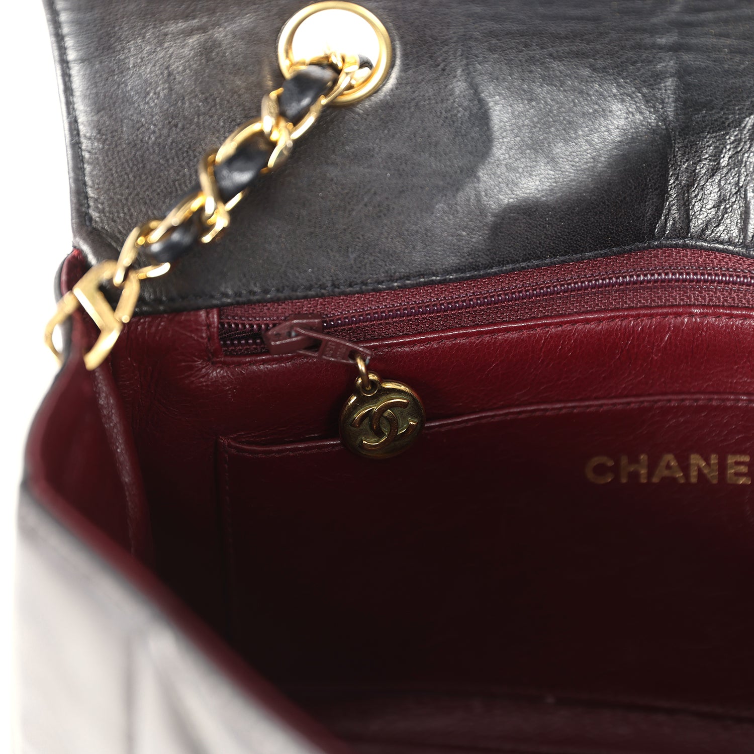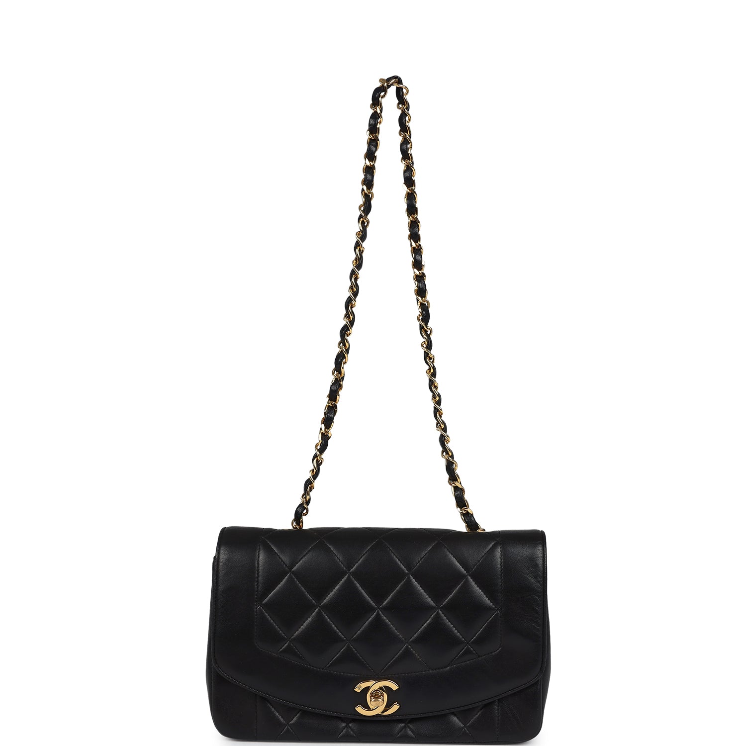 This vintage Small Diana Flap Bag is in black lambskin leather with gold plated hardware. front flap with CC turnlock closure. and interwoven gold plated chain link and black leather shoulder/crossbody strap.