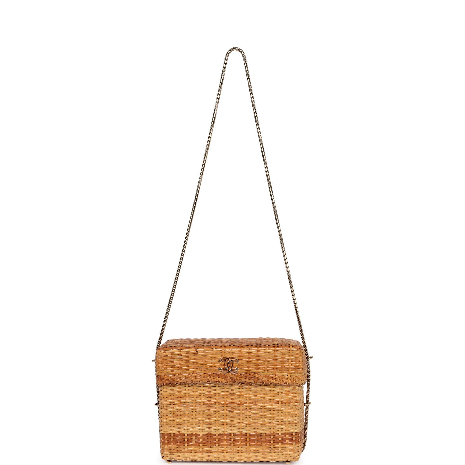 This vintage Chanel picnic basket shoulder bag is in natural woven rattan wicker with gold hardware. featuring a top basket closure. a gold CC logo on front. and and a gold plated chain link shoulder/crossbody strap.