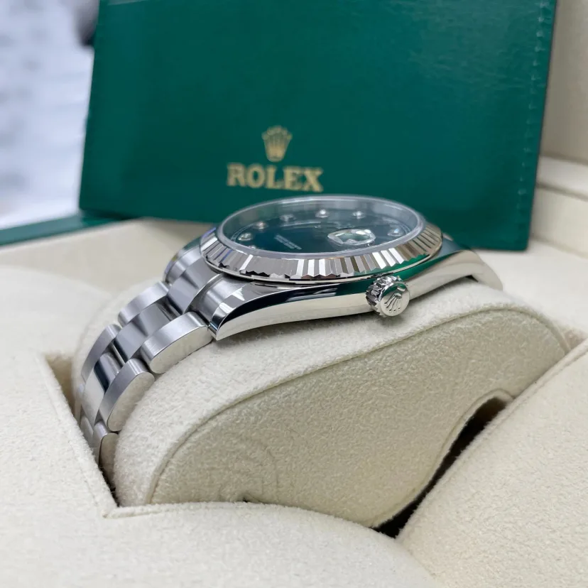This dial features diamonds in 18 ct gold settings. The sunray finish creates delicate light reflections on many dials in the Oyster Perpetual collection. It is obtained using masterful brushing techniques that create grooves running outwards from the centre of the dial. Light is diffused consistently along each engraving. creating a characteristic subtle glow that moves depending on the position of the wrist. Once the sunray finish has been completed. the dial colour is applied using Physical Vapour Deposition or electroplating. A light coat of varnish gives the dial its final look.