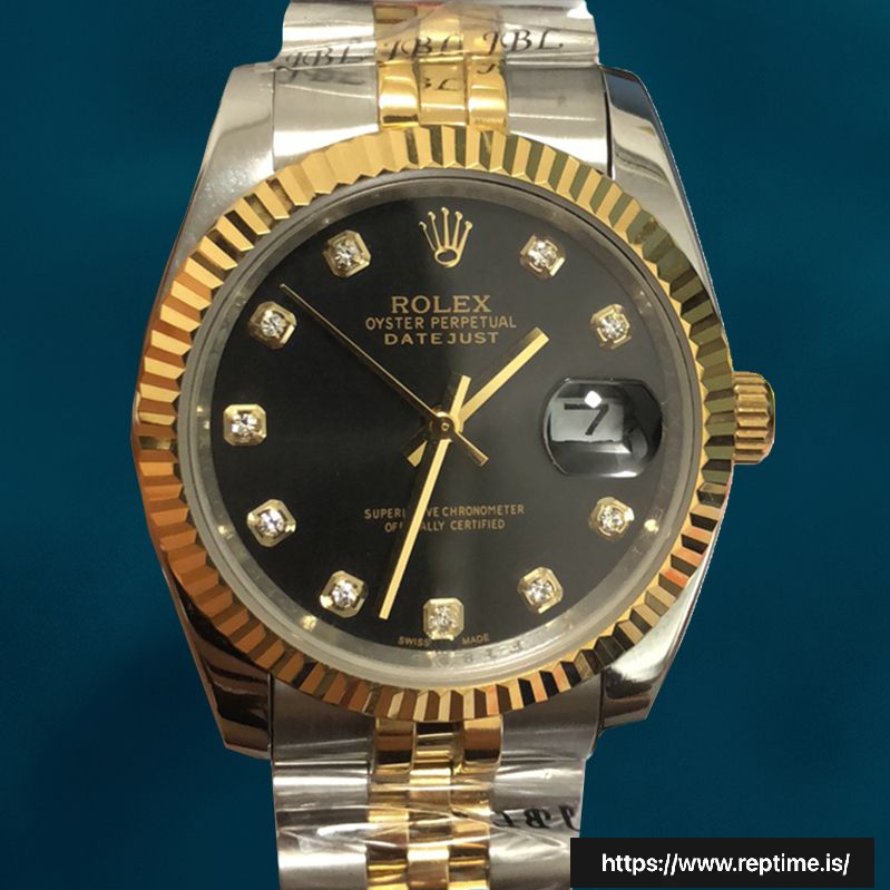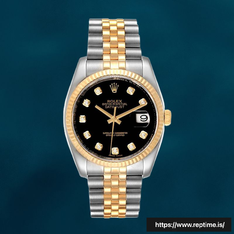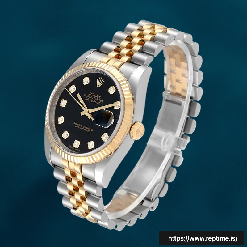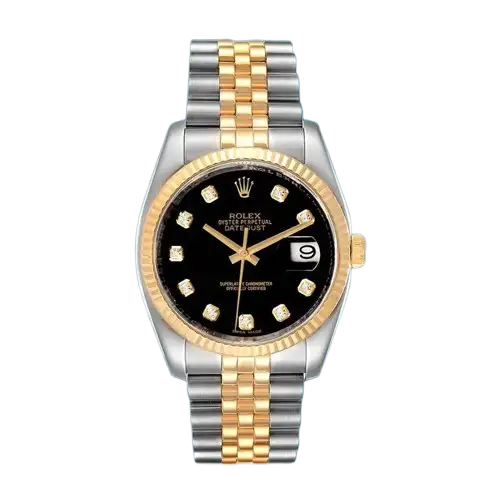 • Dial: Boasts a black dial adorned with sparkling diamond hour markers. The dial design upholds the iconic Datejust look while introducing a luxurious edge. The date window at 3 o'clock adds practical functionality. and the diamond accents contrast beautifully against the black backdrop for a striking appearance.