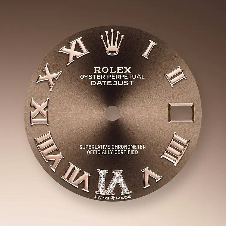 This dial features a large VI set with 11 diamonds. The sunray finish creates delicate light reflections on many dials in the Oyster Perpetual collection. It is obtained using masterful brushing techniques that create grooves running outwards from the centre of the dial. Light is diffused consistently along each engraving. creating a characteristic subtle glow that moves depending on the position of the wrist. Once the sunray finish has been completed. the dial colour is applied using Physical Vapour Deposition or electroplating. A light coat of varnish gives the dial its final look.