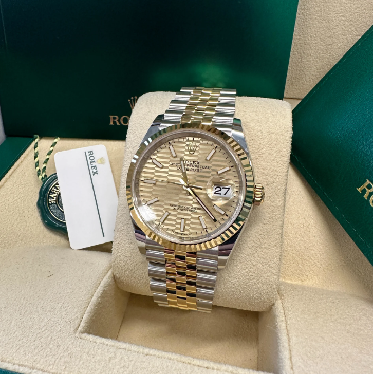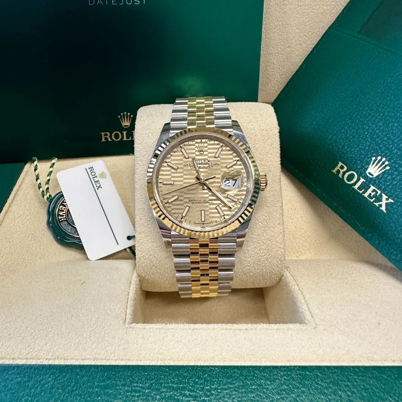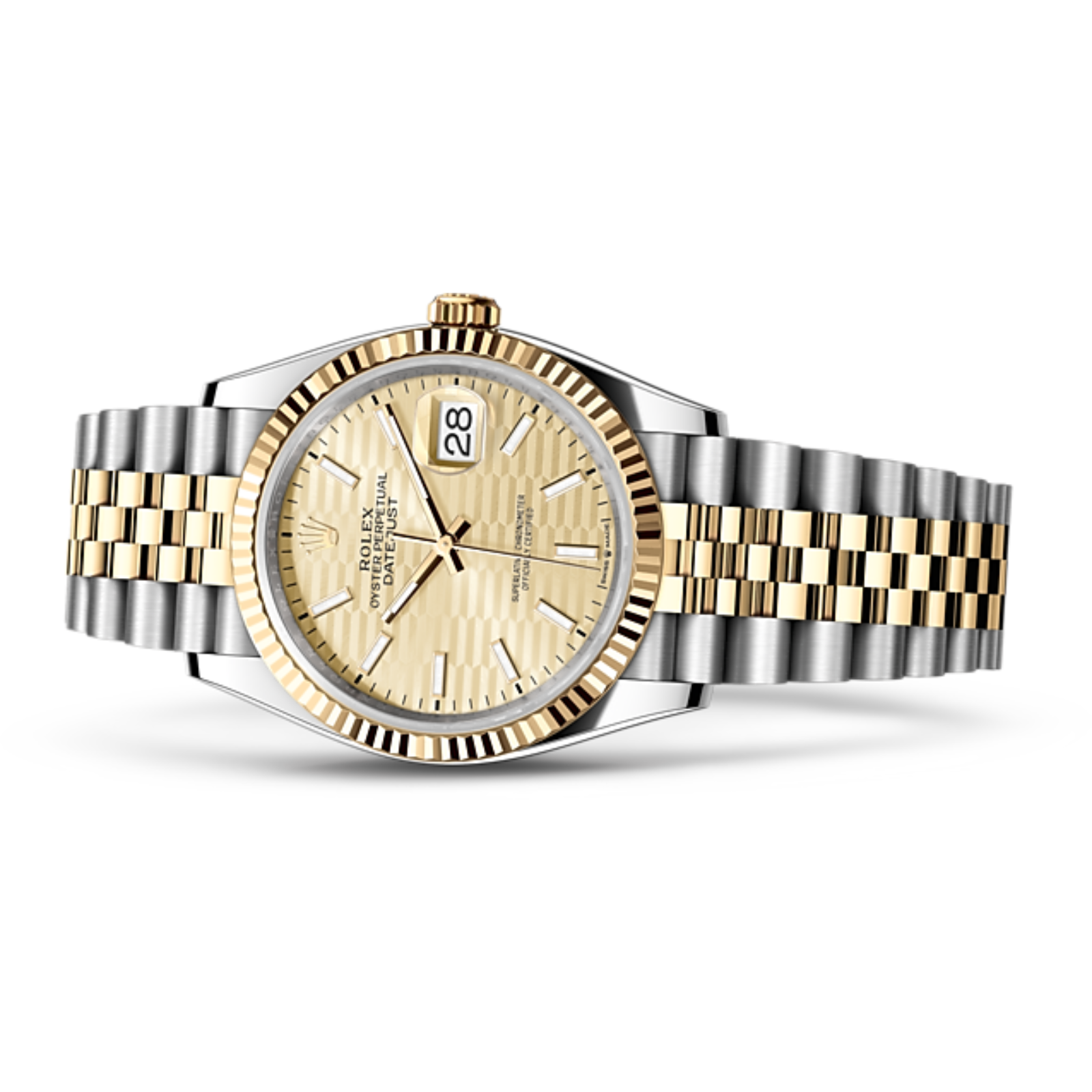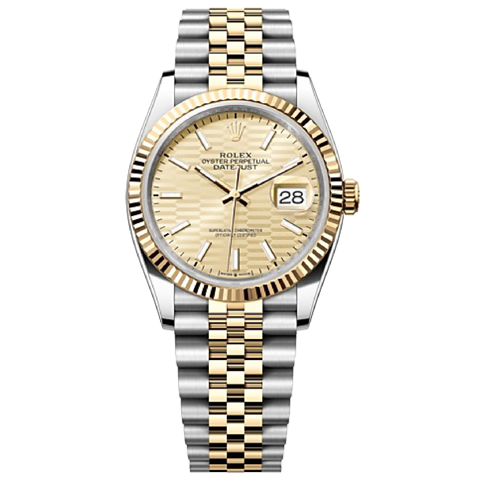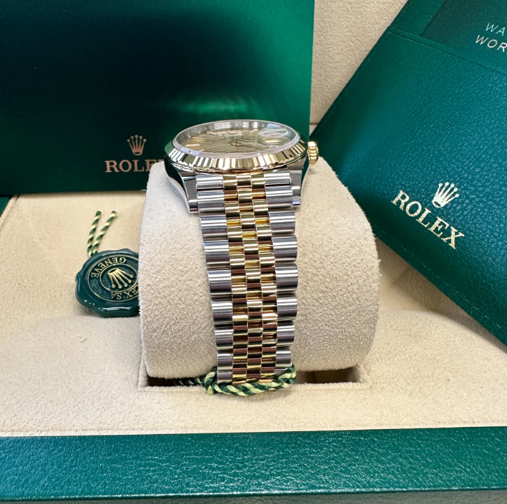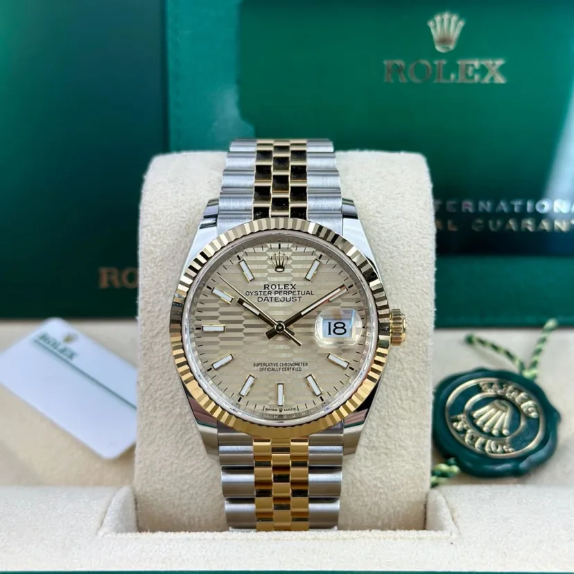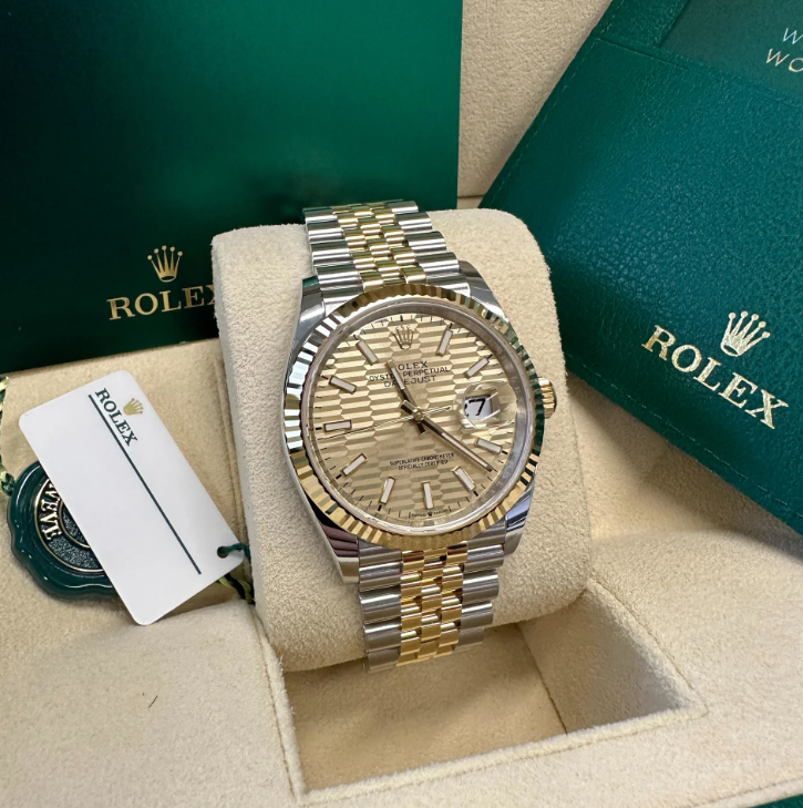 The Rolex fluted bezel is a mark of distinction. Originally. the fluting of the Oyster bezel had a functional purpose: it served to screw the bezel onto the case helping to ensure the waterproofness of the watch. It was therefore identical to the fluting on the case back. which was also screwed onto the case for waterproofness. using specific Rolex tools. Over time. the fluting became an aesthetic element. a genuine Rolex signature feature. Today the fluted bezel is a mark of distinction.�in gold on this Datejust 36.