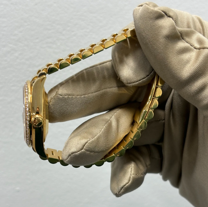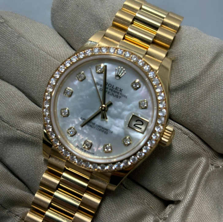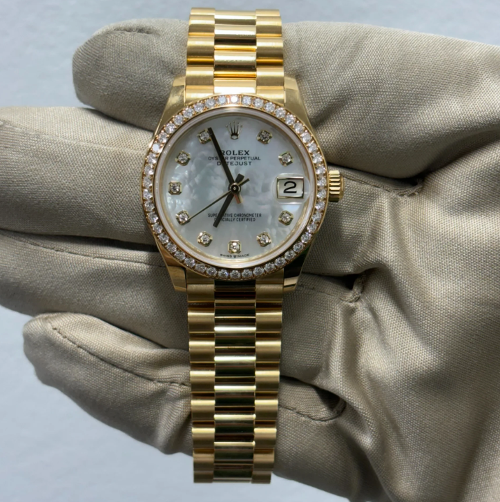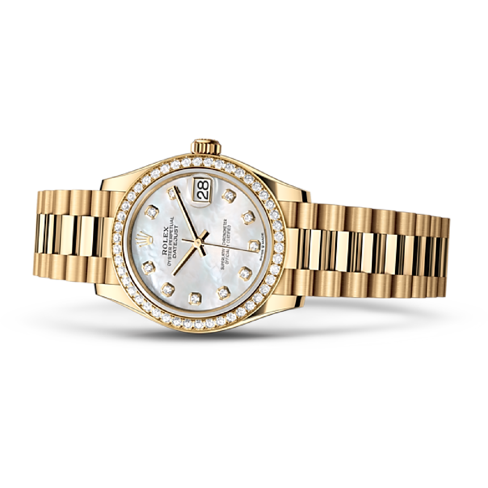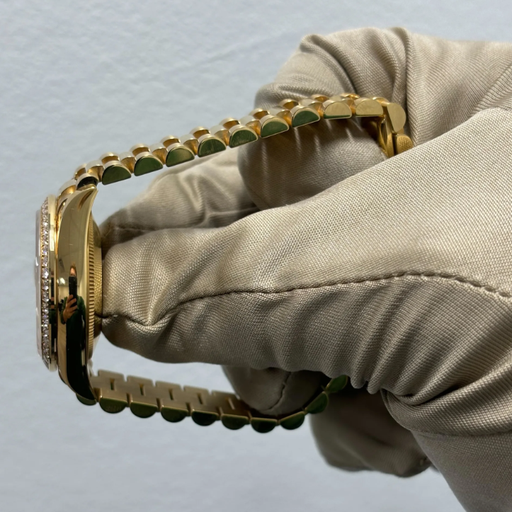 This dial features diamonds in 18 ct gold settings. Mother-of-pearl is by its nature full of mystery and surprises. Depending on its origin. it can be pink. white. black or yellow. It differs in colour. intensity and structure according to the part of the shell from which it is extracted. At Rolex. mother-of-pearl is never artificially coloured. Instead. particular know-how and skill are devoted to simply highlighting its natural beauty and preserving the original hues. As all mother-of-pearl dials are unique pieces. an identical dial will never be found on another wrist.