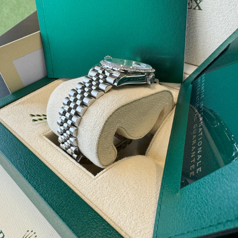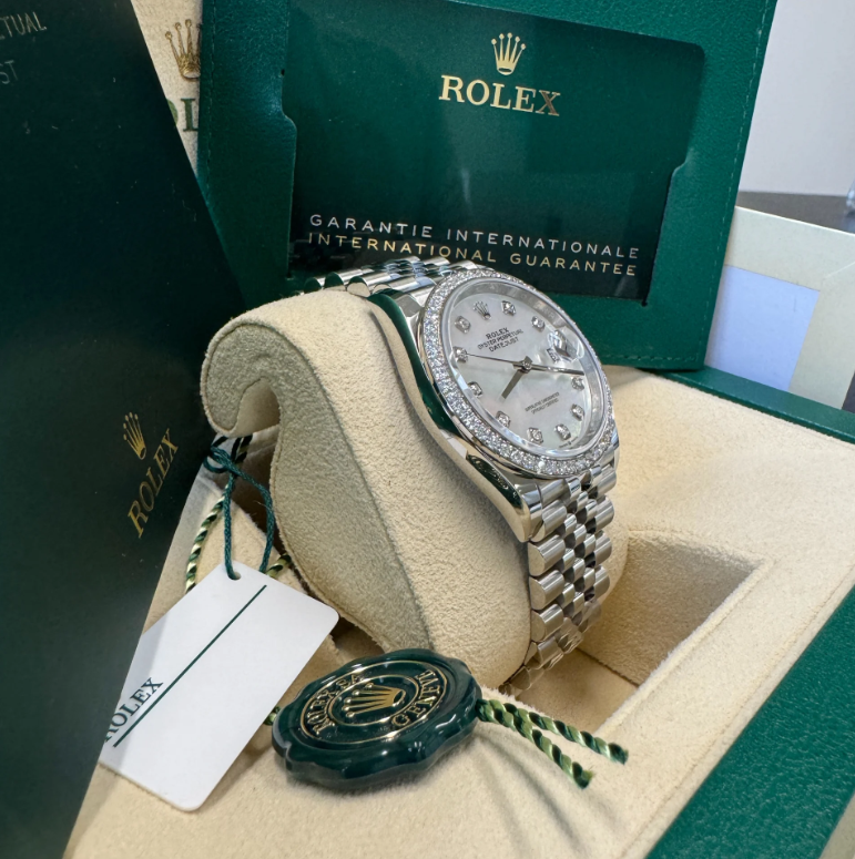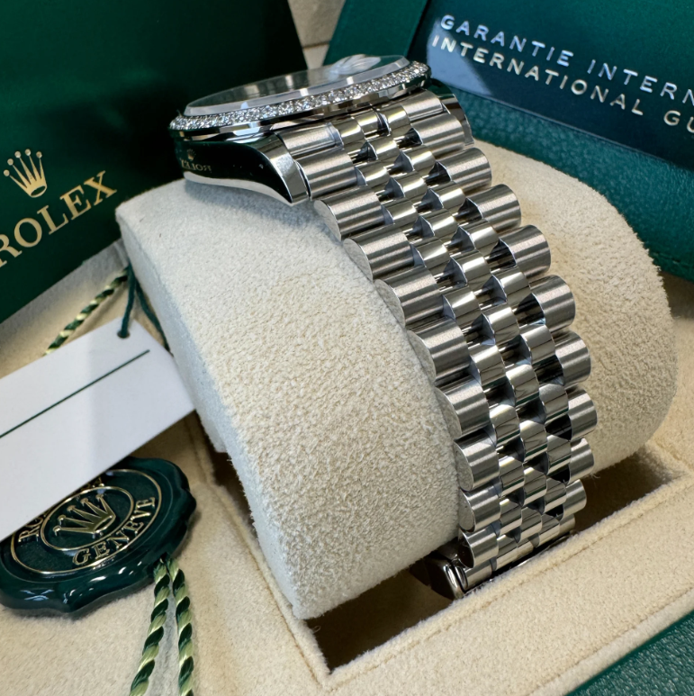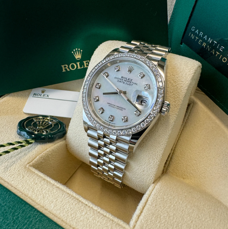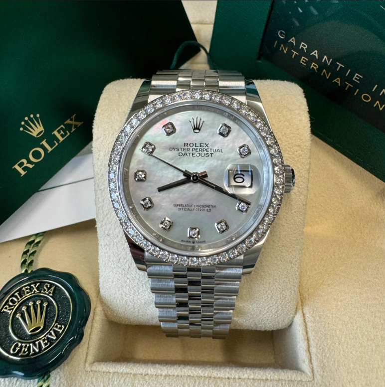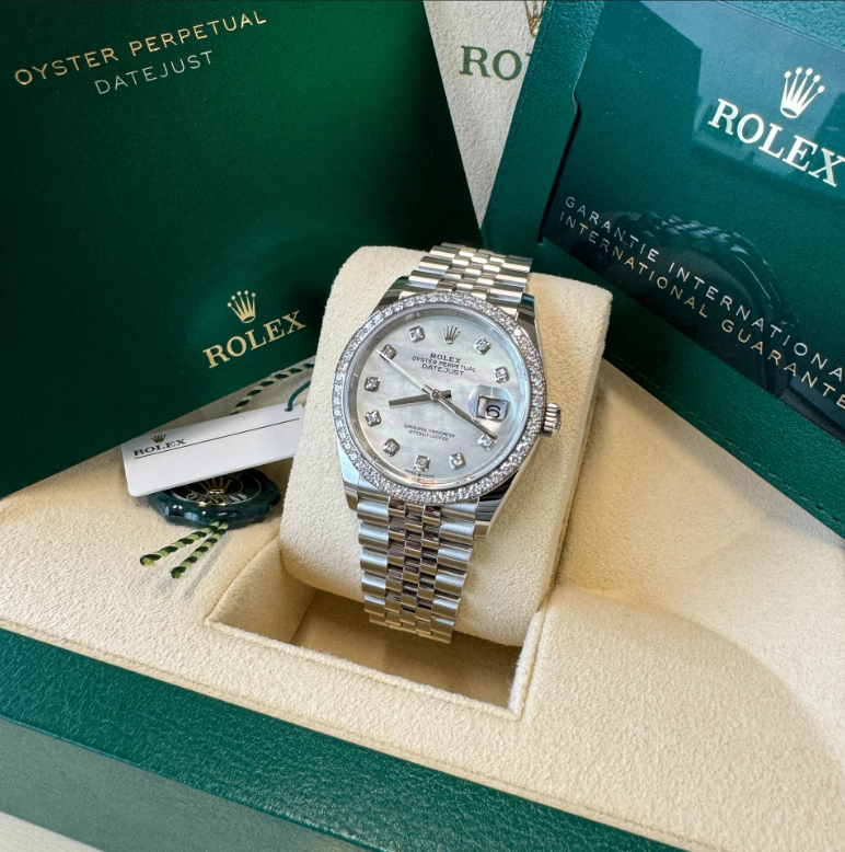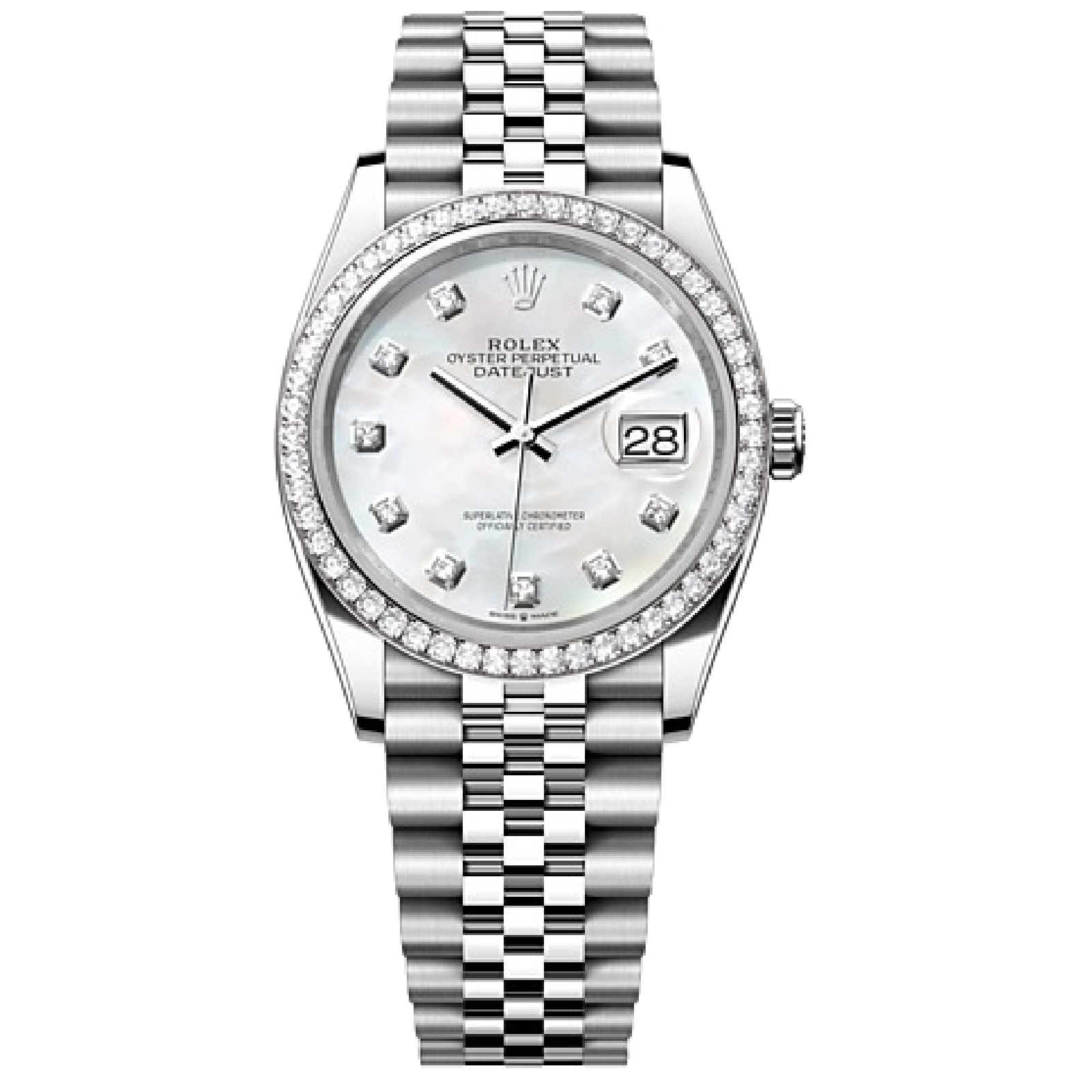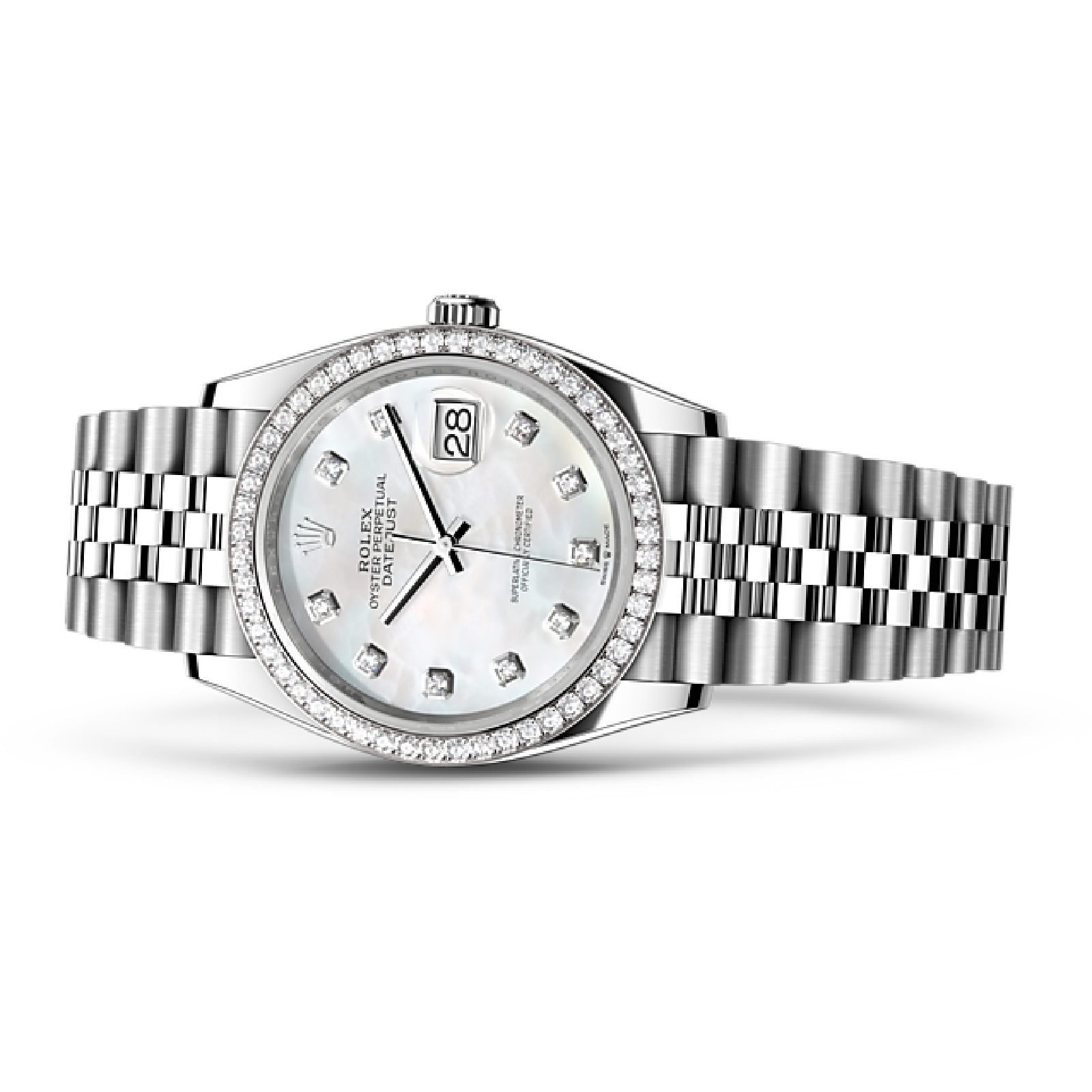 This dial features diamonds in 18 ct gold settings. Mother-of-pearl is by its nature full of mystery and surprises. Depending on its origin. it can be pink. white. black or yellow. It differs in colour. intensity and structure according to the part of the shell from which it is extracted. At Rolex. mother-of-pearl is never artificially coloured. Instead. particular know-how and skill are devoted to simply highlighting its natural beauty and preserving the original hues. As all mother-of-pearl dials are unique pieces. an identical dial will never be found on another wrist.
