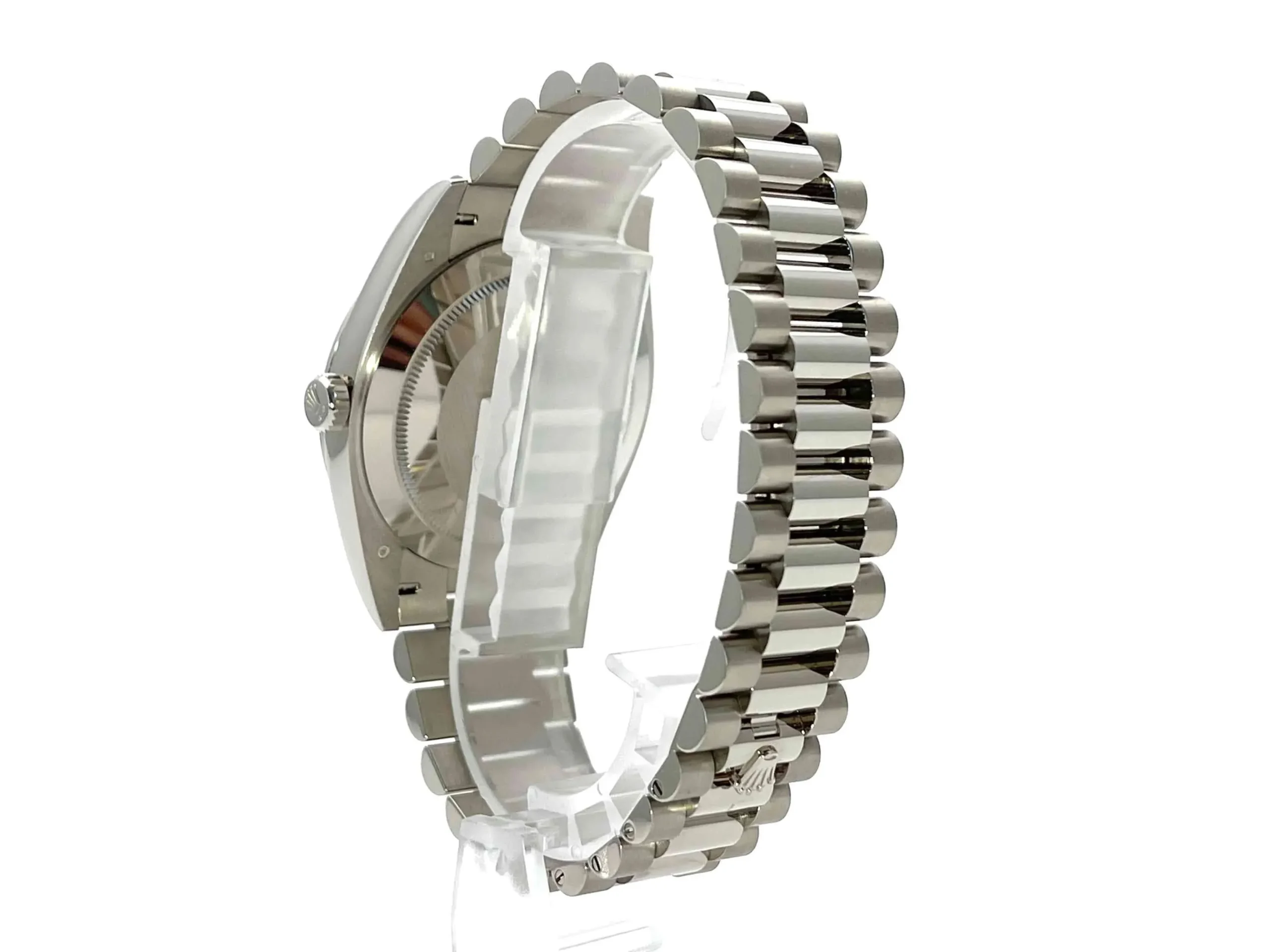 BrandRolexModelDay-DateReference228239GenderMen’s watchMovementKinetic (Automatic)Case Diameter40 mmCase MaterialWhite gold PlatedBand MaterialWhite gold Plated (President)Dial ColorBlackQualitySwiss (ETA)GlassSapphire crystalWater ResistanceWaterproof up to 30 meters.