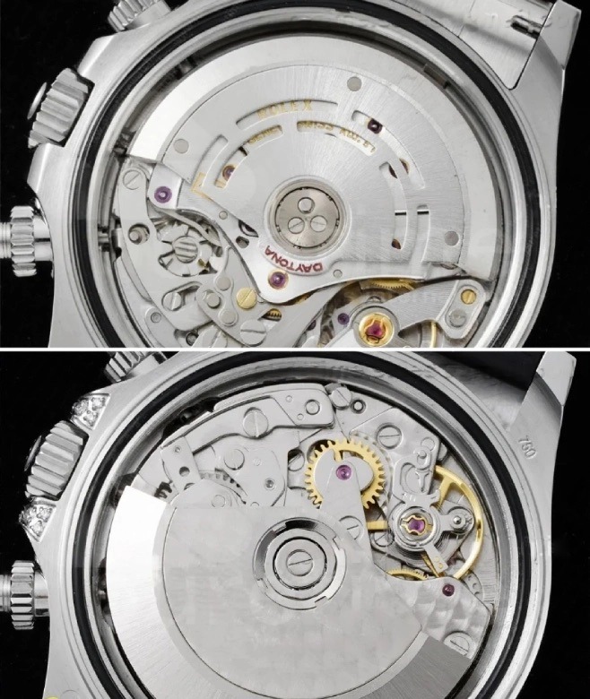 - AAA: It comes with an Asian clone of the ETA 7750 movement. This movement lacks a Rolex-decorated rotor and parts and is slightly thicker than the original. making the watch case 12.6mm thick compared to the 12.2mm thickness of the Superclone and the original.