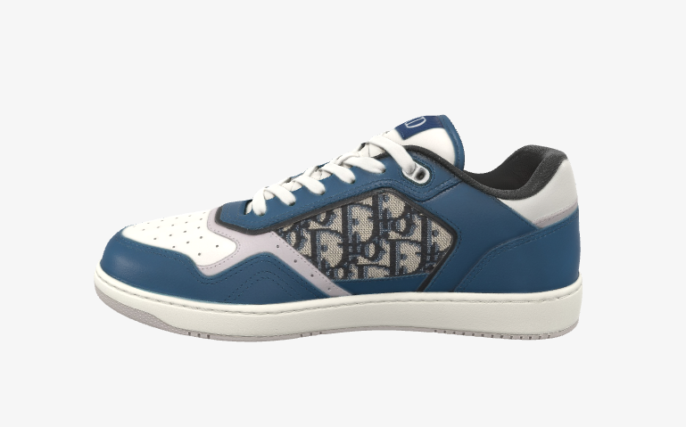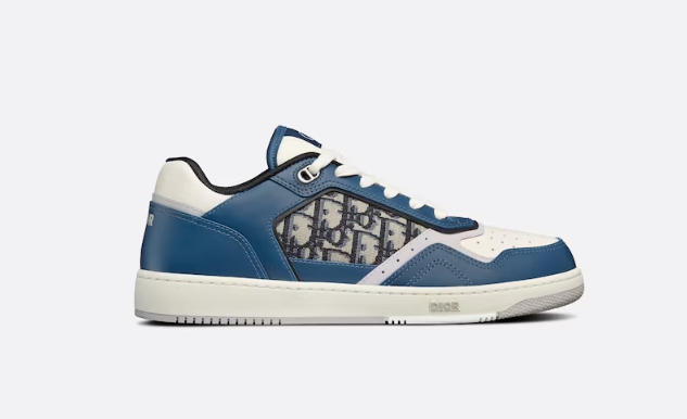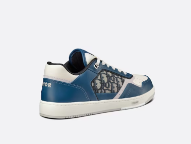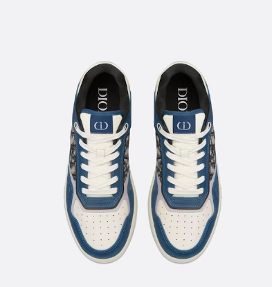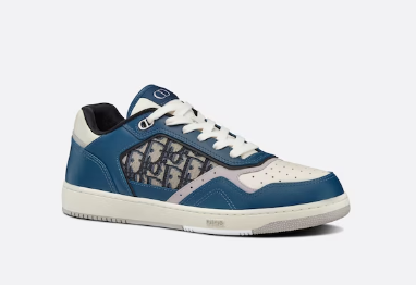 The B27 low-top sneaker is already a House essential. Crafted in blue. cream and Dior gray smooth calfskin. the style is adorned with beige and black Dior Oblique jacquard inserts on the sides. The sneaker is enhanced with 'CD Icon' eyelets as well as numerous hallmark details on the two-tone rubber sole. tongue and back. The low-top sneaker will enhance any favorite outfit.
