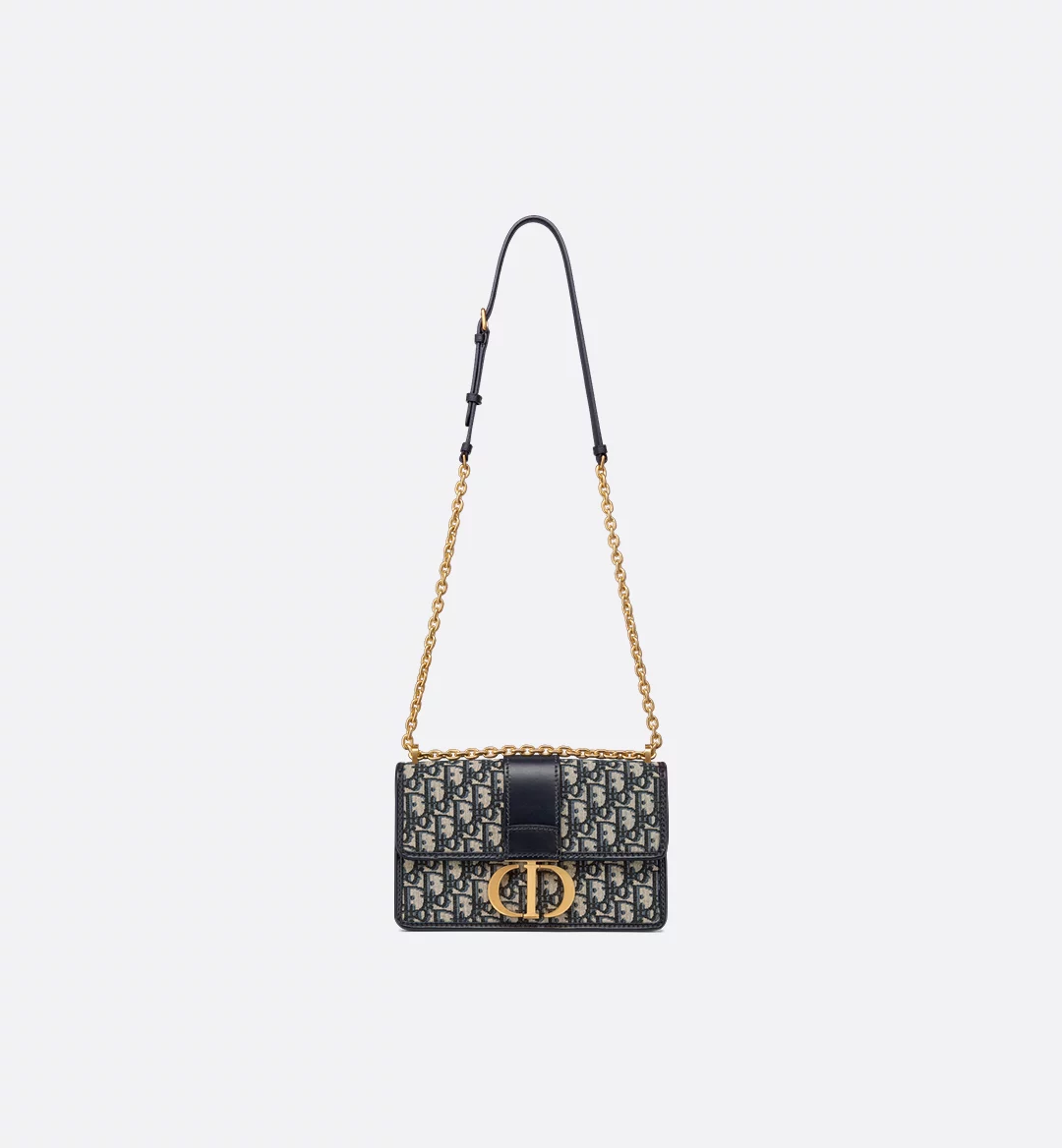 Description: The 30 Montaigne product series is inspired by No.30 Montaigne Avenue. which shows the classic logo. This chain bag is made of blue jacquard fabric and other materials. which highlights Dior's classic Oblique printing and elegant and modern design. The flip cover is decorated with a metal CD buckle with retro gold finish. inspired by the seal of Christian Dior perfume bottle. Other details such as the 30 Montaigne embossed logo on the back highlight the neat design. With chain shoulder strap. it can be carried by hand. shoulder or slung.