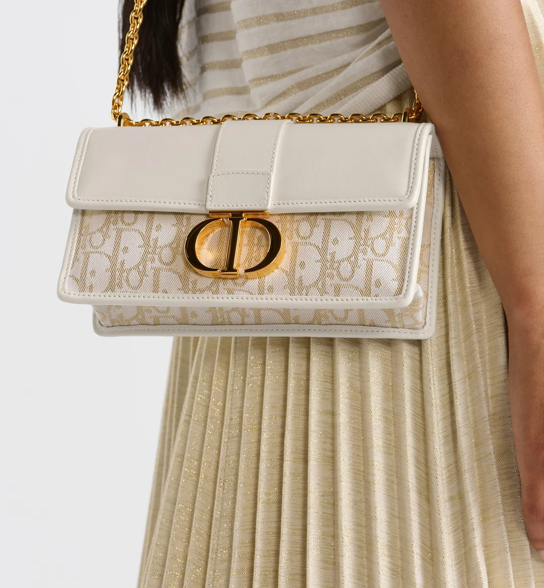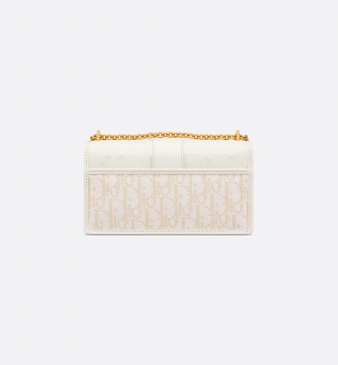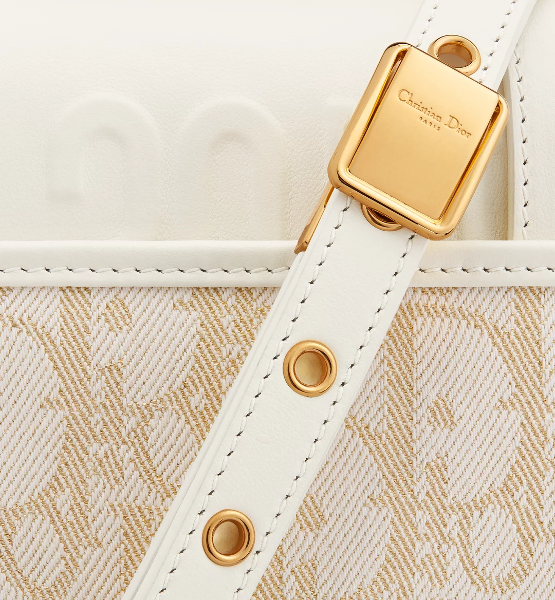 Oblique printing in creamy white smooth cow leather and denim fabric with gold metallic luster line decoration.