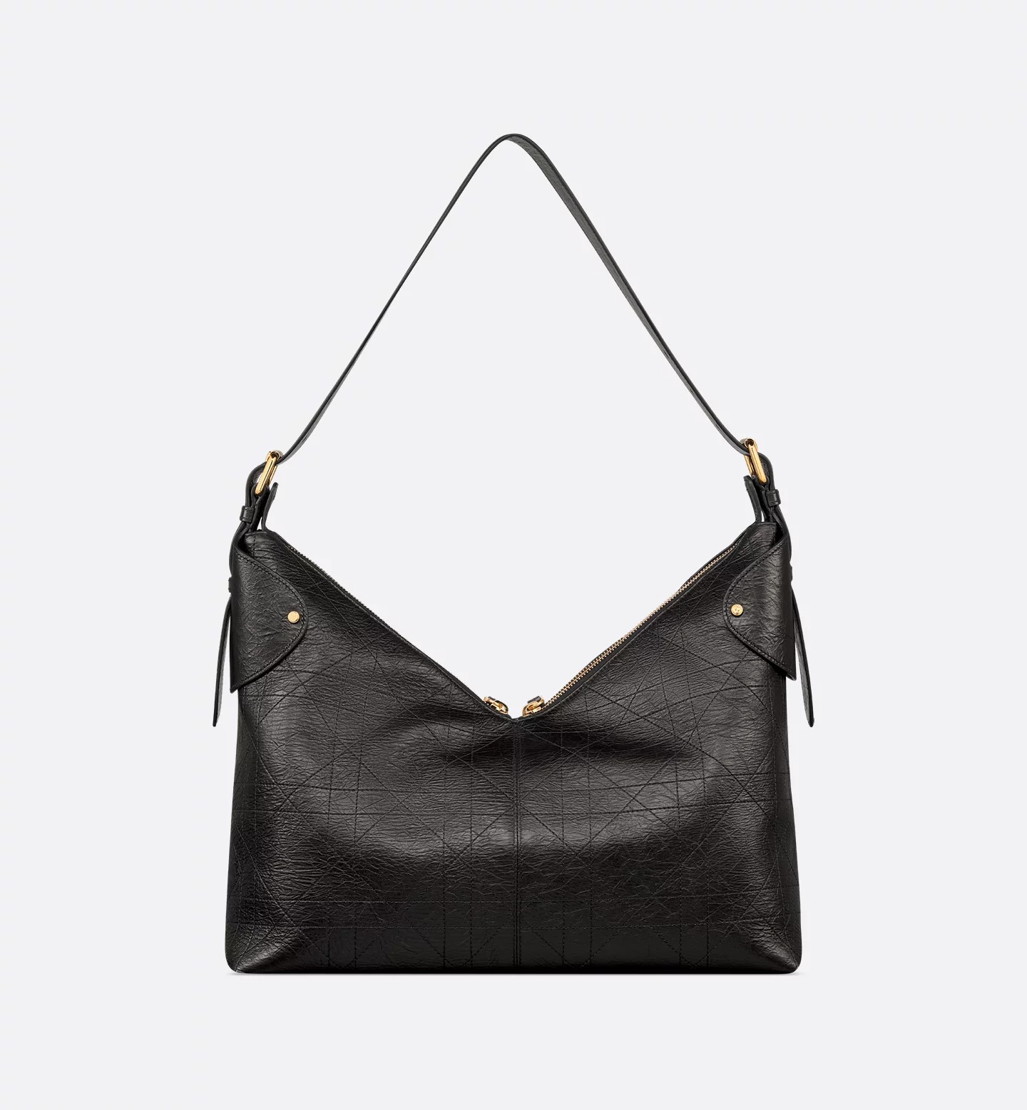 The Dior Voyage bag. a new addition to the Cruise 2026 Ready-to-Wear collection. blends soft lines with elegant details in a harmonious. slender silhouette. Crafted from black crinkled calfskin leather. it features a flat. oversized cannage topstitching. a fresh take on the iconic Dior motif. The soft silhouette is enhanced with an antique gold-finish metal D.I.O.R. charm and expertly crafted leather accents. adding structure and volume. The main compartment features a secure and practical two-way zipper closure. The large size features a top handle with an adjustable buckle. allowing it to be carried on the shoulder. making it the perfect everyday companion.