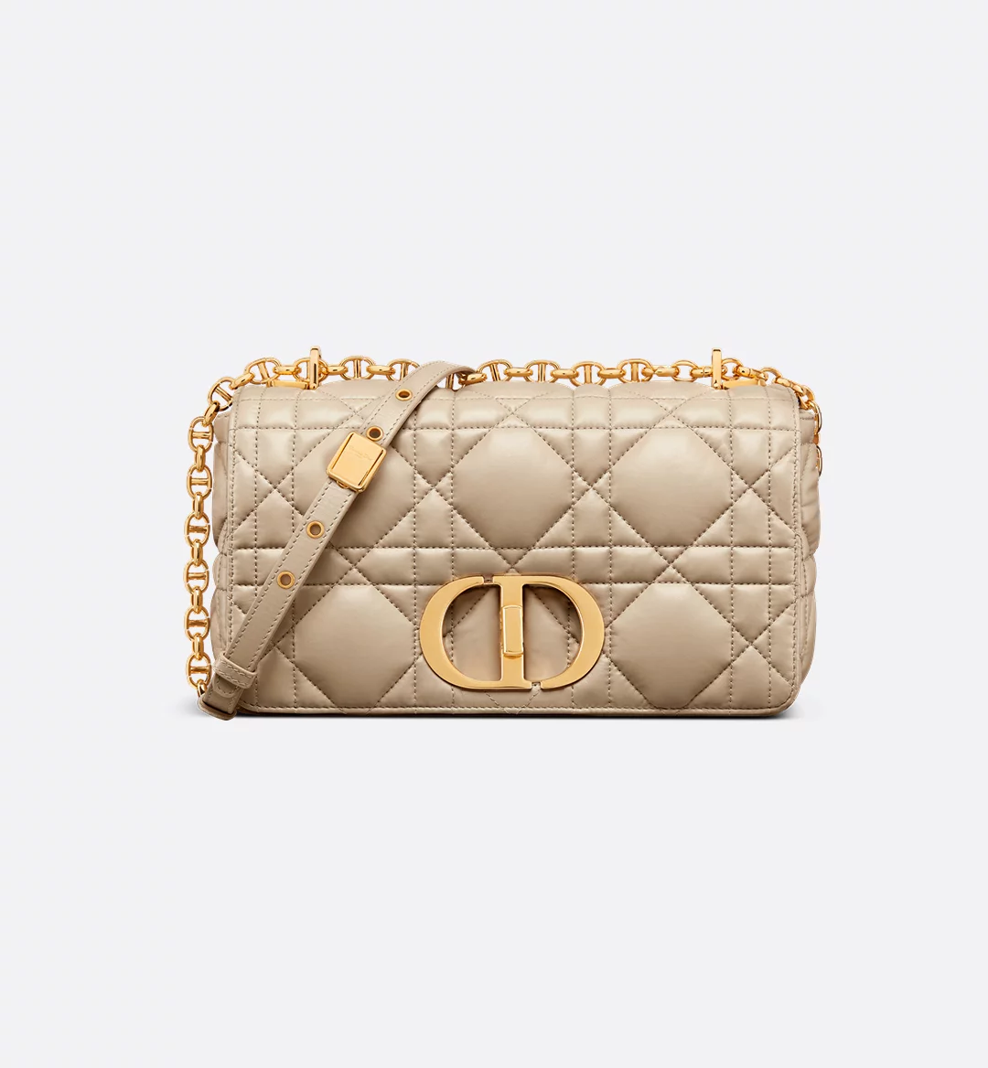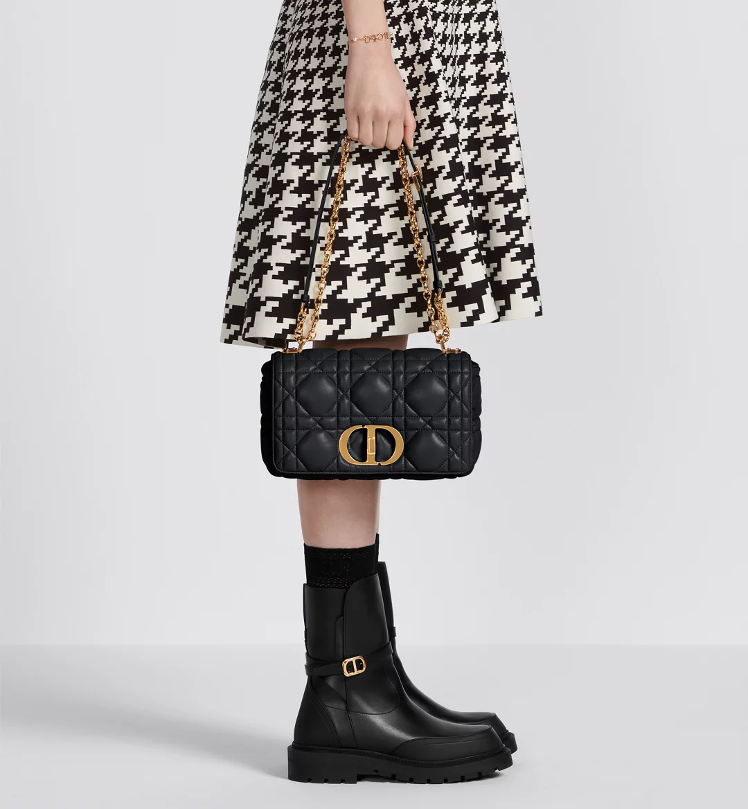 Description: This Dior Caro handbag combines elegance and modern style. Made of sand-brown cow leather. with the original quilting effect of super-large rattan plaid noodle line. unique. The flip cover is decorated with a metal knob CD buckle with retro gold finish. inspired by the seal of Christian Dior perfume bottle. Medium style. with detachable CD logo link shoulder strap. can be carried by hand. shoulder or slung. or can be replaced by embroidered wide shoulder strap to embellish daily styling or make a bright finishing touch for evening wear.