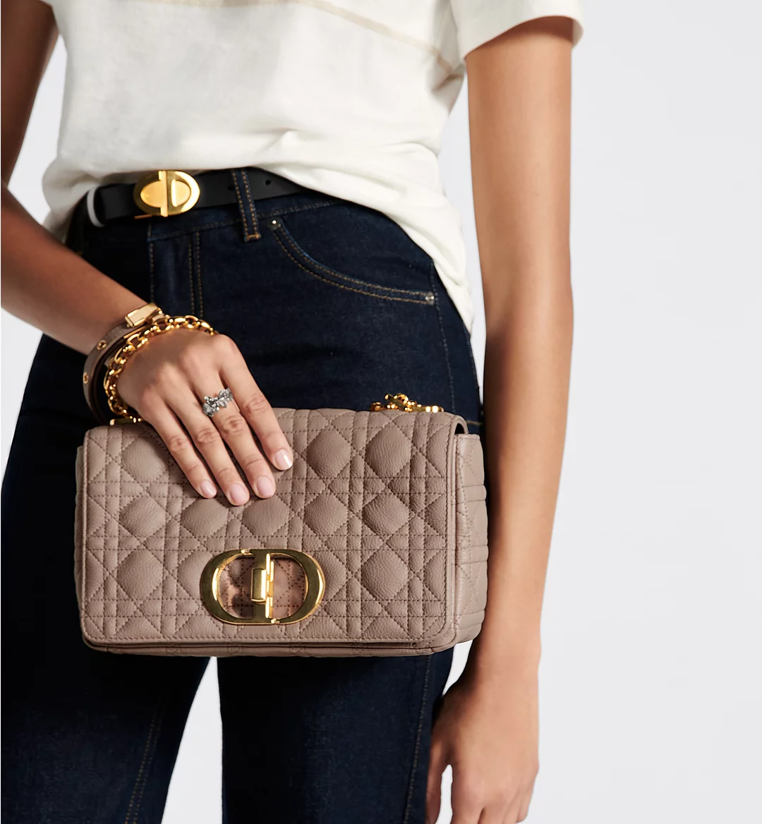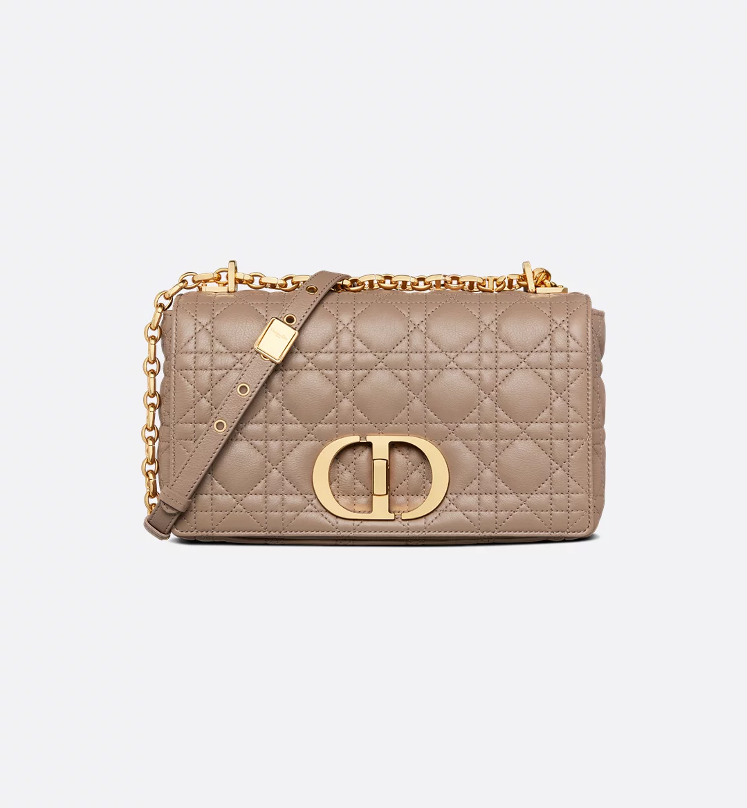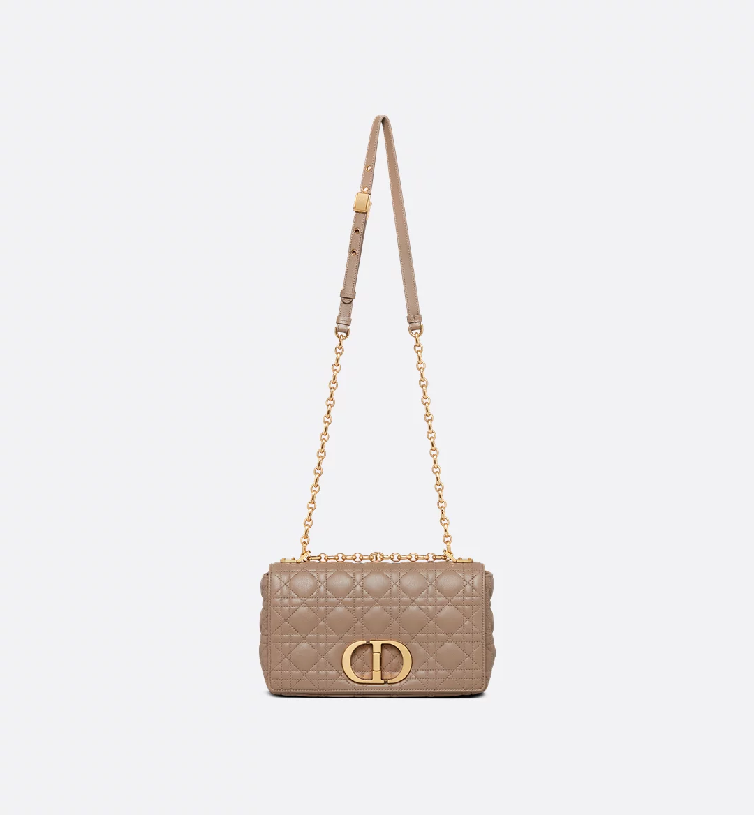 Description: This Dior Caro handbag combines elegance and modern style. Made of black soft cow leather and other materials. it is decorated with rattan check thread. The flip cover is decorated with a metal knob CD buckle with retro gold finish. inspired by the seal of Christian Dior perfume bottle. Medium style. with detachable CD logo link shoulder strap. can be carried by hand. shoulder or slung sideways. and can also be replaced by Dior embroidered wide shoulder strap to embellish daily styling or make a bright finishing touch for evening wear.