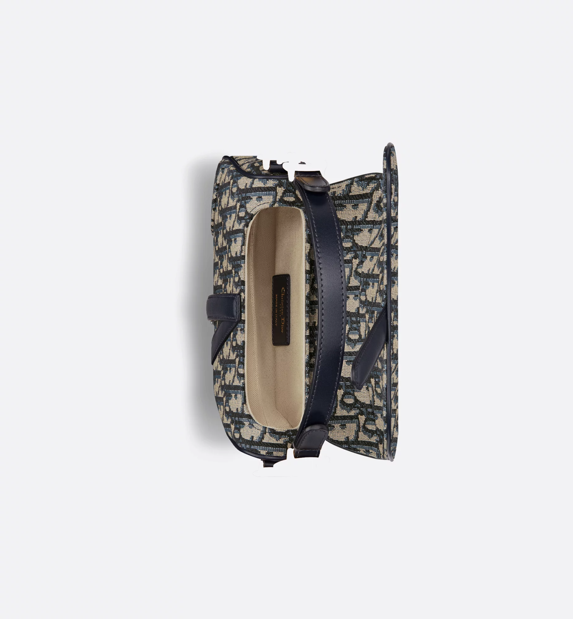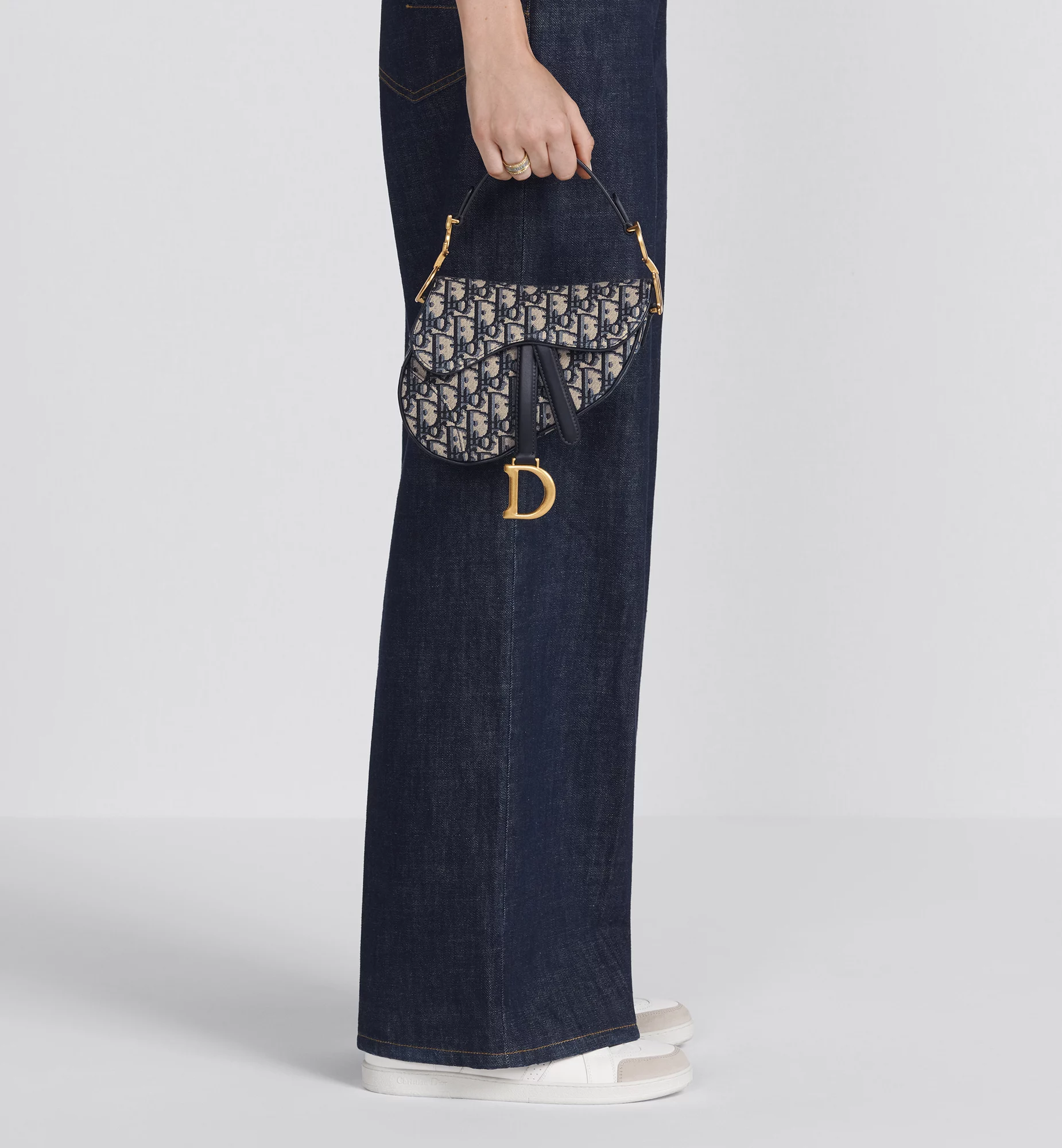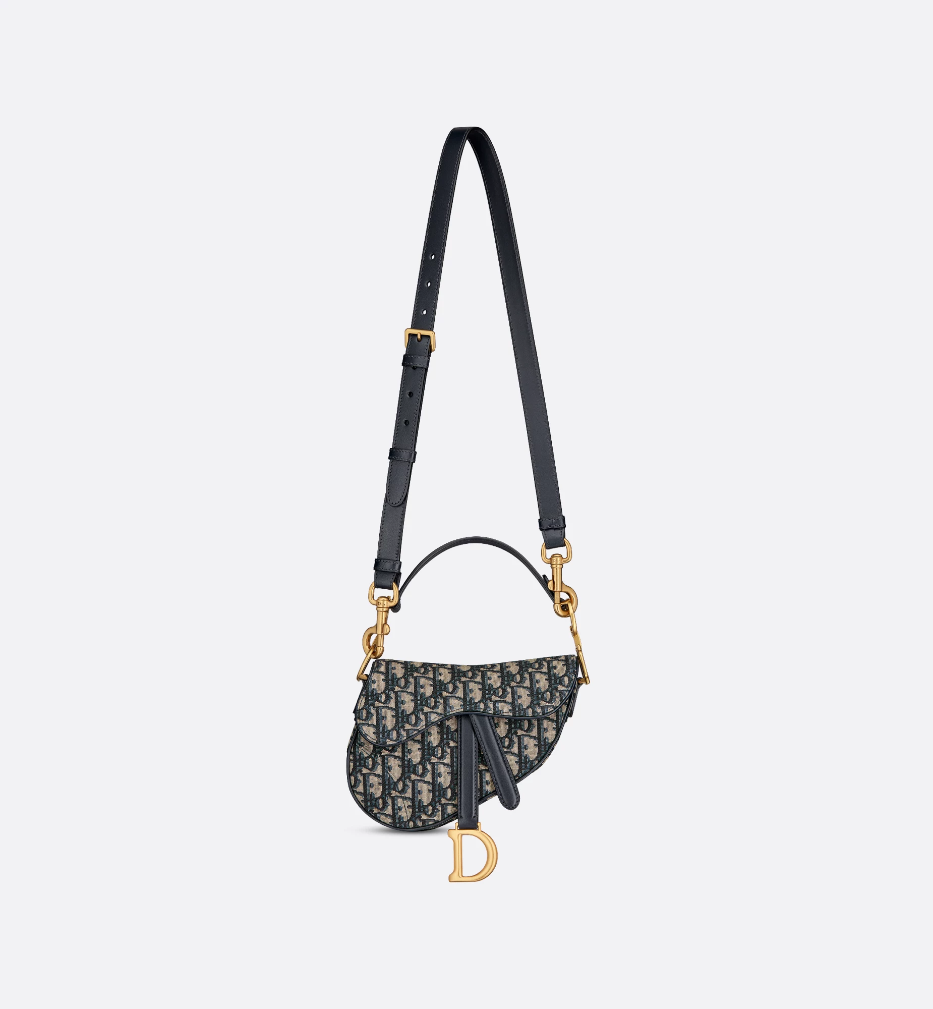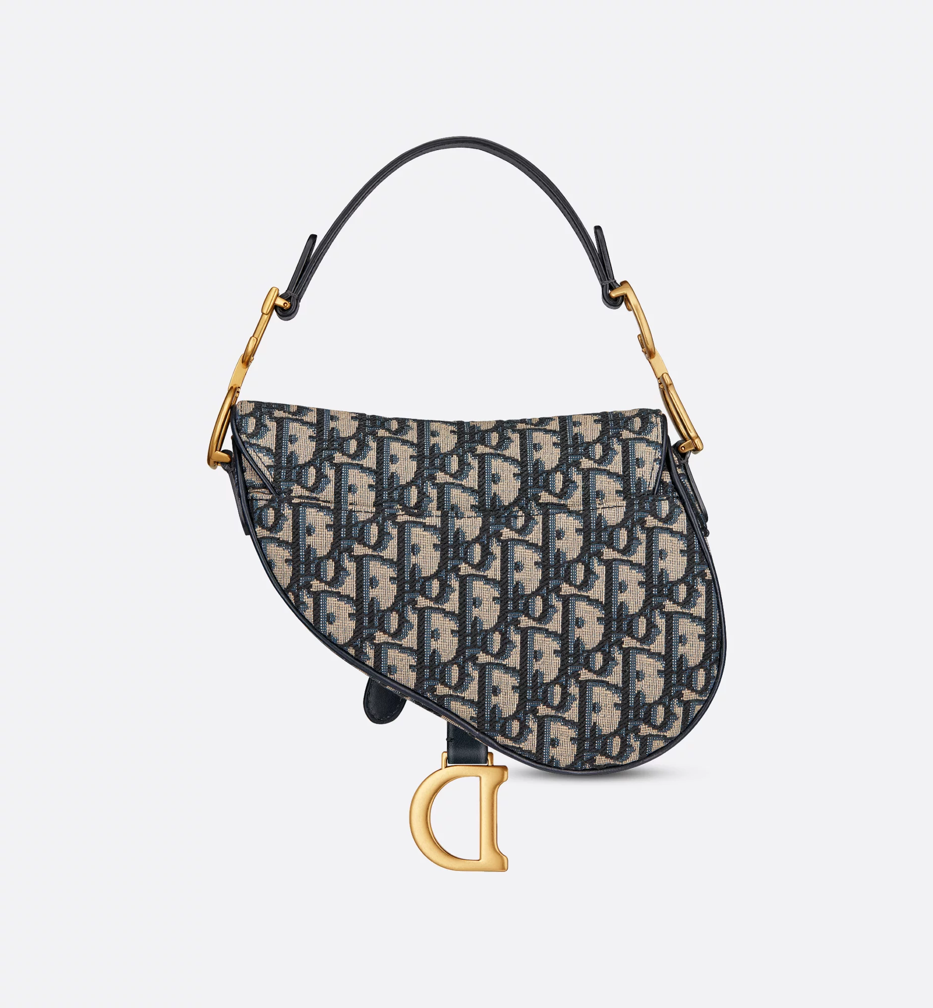 Description: This classic saddle bag highlights the ingenious design of Maria Grazia Chiuri. Carefully made of blue Oblique printed fabric. the saddle flip is matched with lace and magnetic drawstring decorated with stirrup D-shaped pendant. which highlights the classic design. and the handles are decorated with retro gold decorative metal CD logo on both sides. Mini style. with adjustable and detachable thin shoulder straps. can be carried by hand. shoulder or slung.