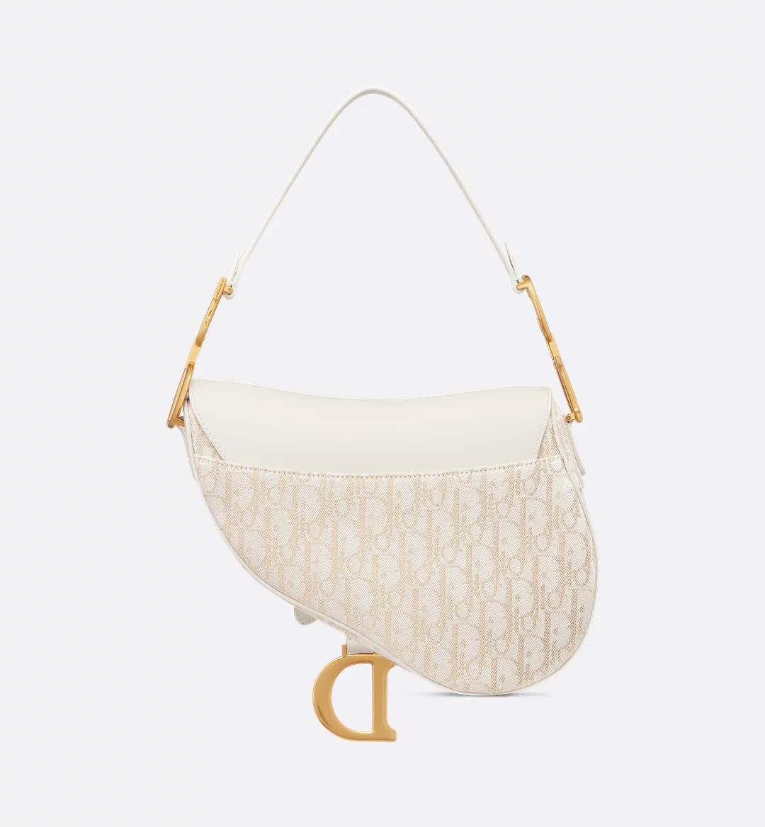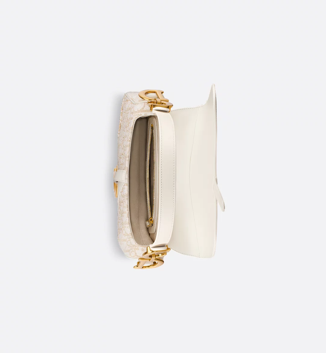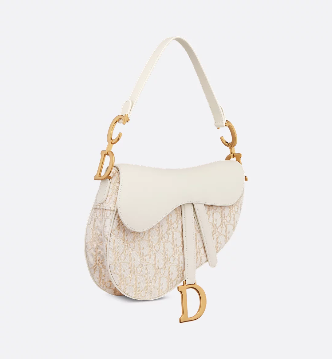 Oblique printing in creamy white smooth cow leather and denim fabric with gold metallic luster line decoration.