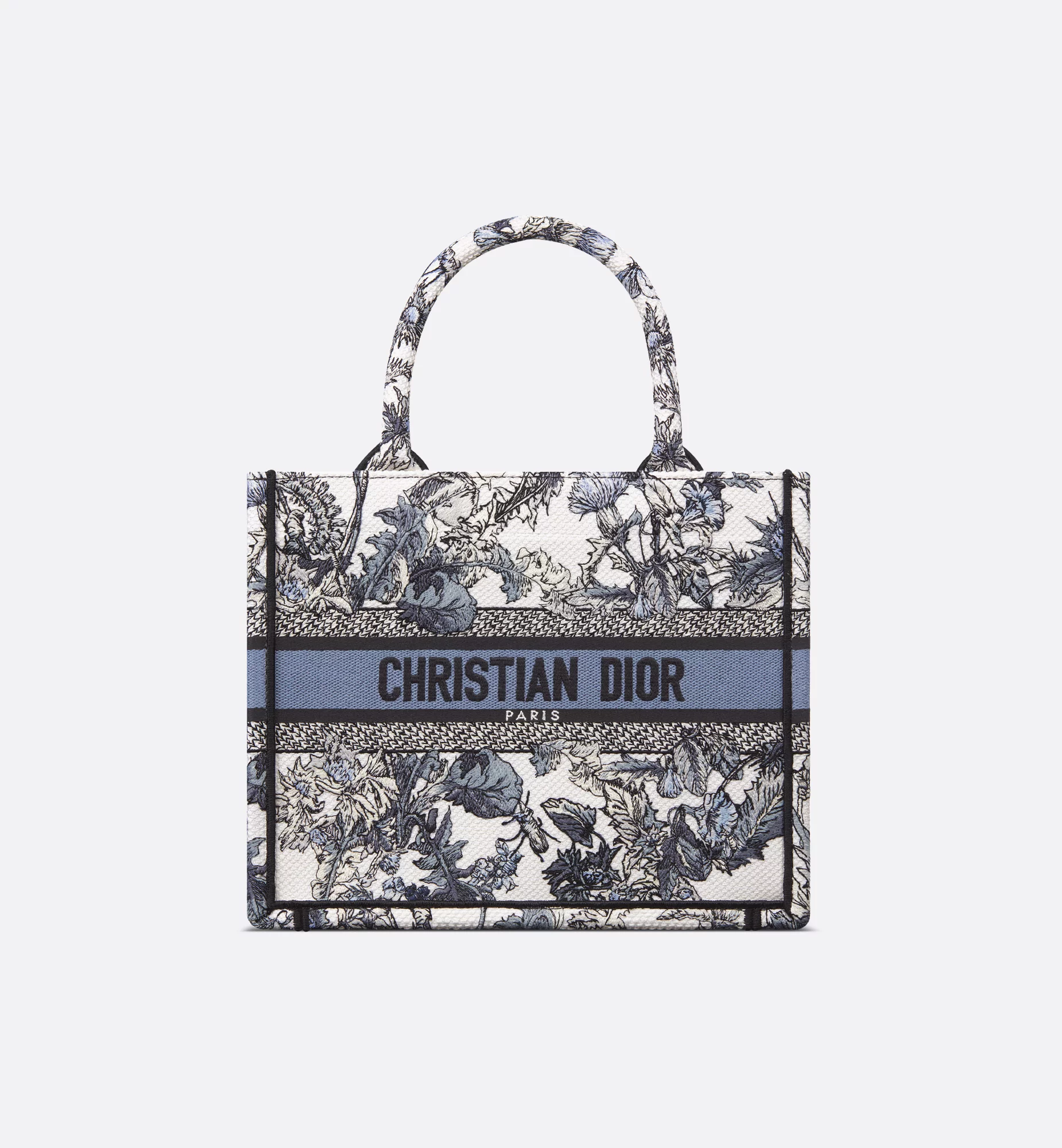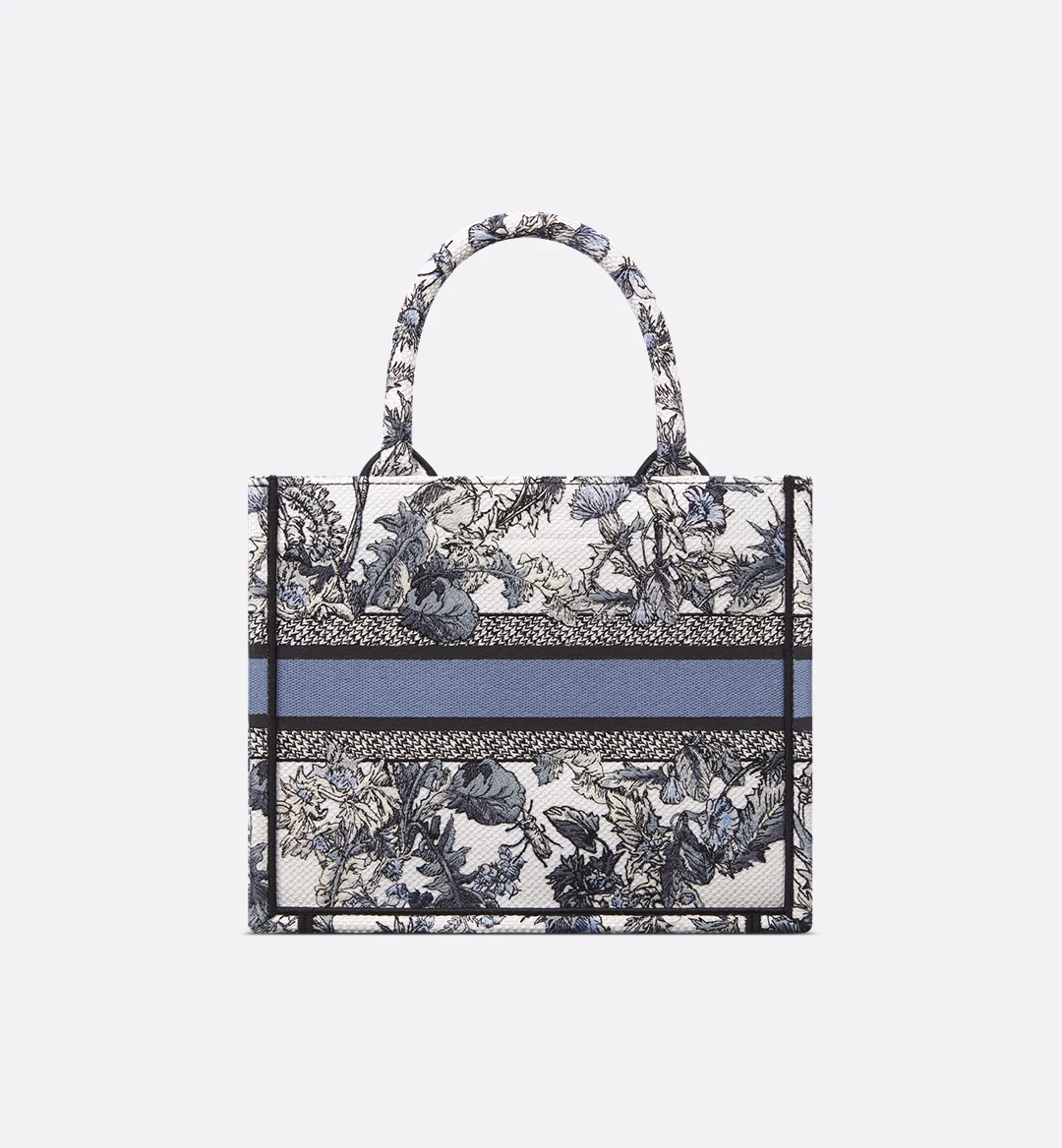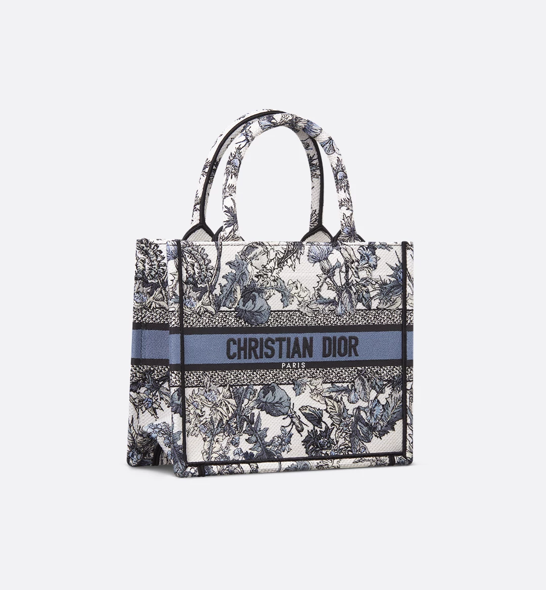 Description: This Book Tote handbag is designed by Maria Grazia Chiuri. creative director of Dior women's wear. and it is the main product that embodies Dior's aesthetics. Elaborately made of white embroidered fabric. the whole body is decorated with the blue pattern of Dior Chardons designed by Pietro Ruffo. which shows the Scottish national flower symbolizing protection. resilience and freedom and can accommodate all kinds of daily necessities. Small style. front decorated with contrasting Christian Dior Paris logo. highlighting Dior's exquisite craftsmanship. portable. It can be matched with other Dior Chardons items this season to create a matching shape.