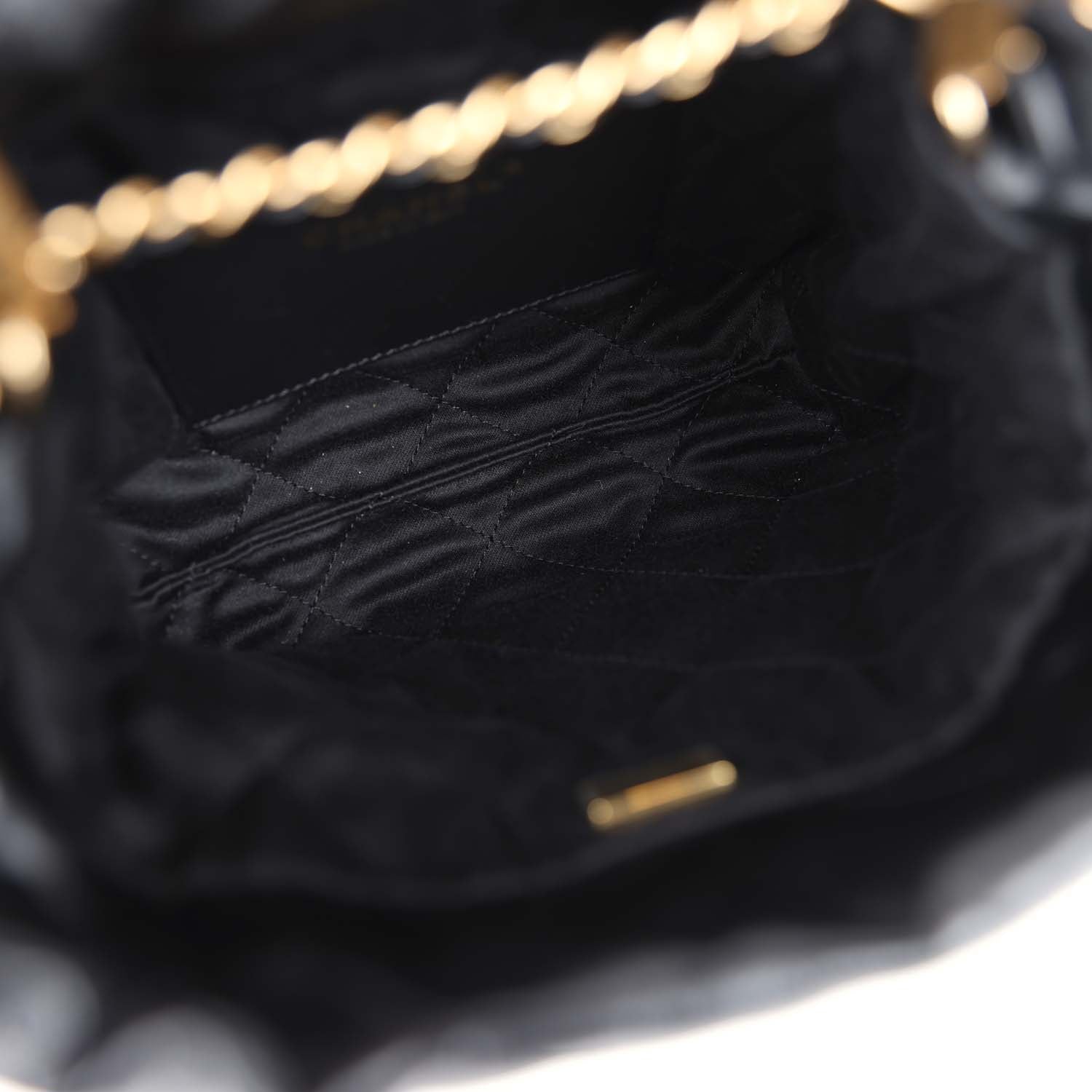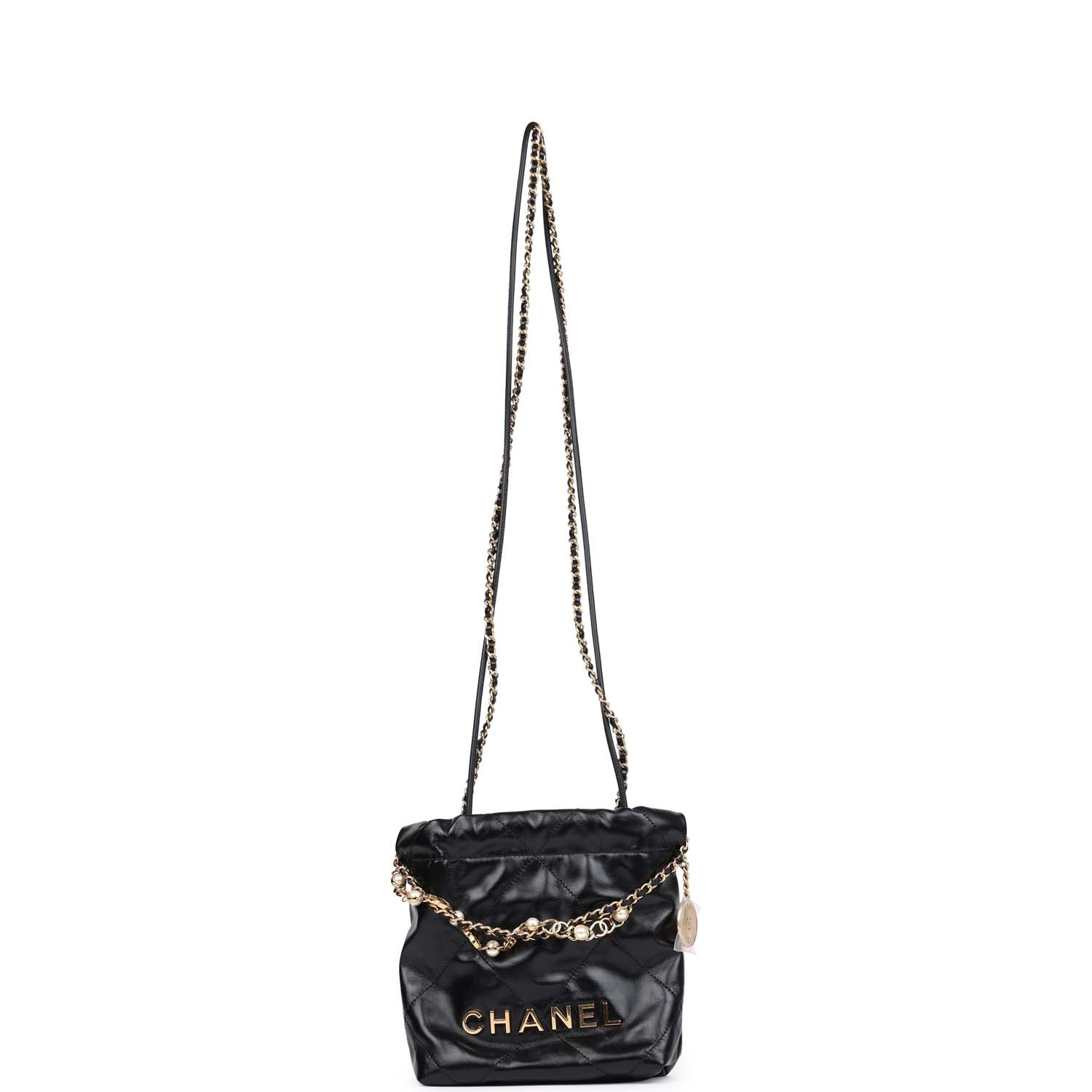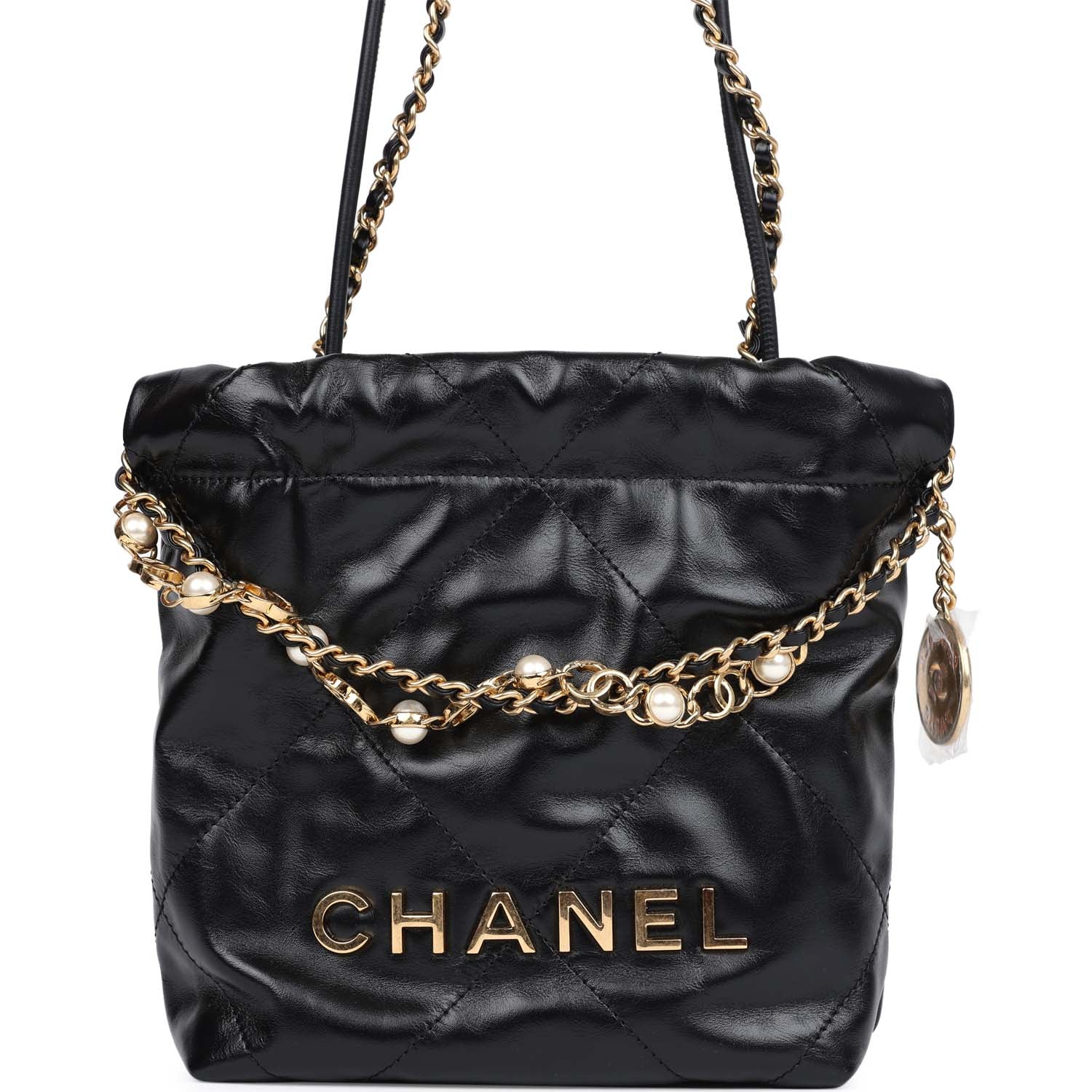 This Mini 22 Hobo Bag is in black calfskin leather with gold tone hardware. has the signature diamond quilt. a gold tone metal "Chanel" logo on front of bag. Chanel Paris metal hang tag. interwoven chain link with gold metal and black leather shoulder straps. one long leather cord and one faux pearl and gold chainlink top handle and one leather and gold chainlink top handle.