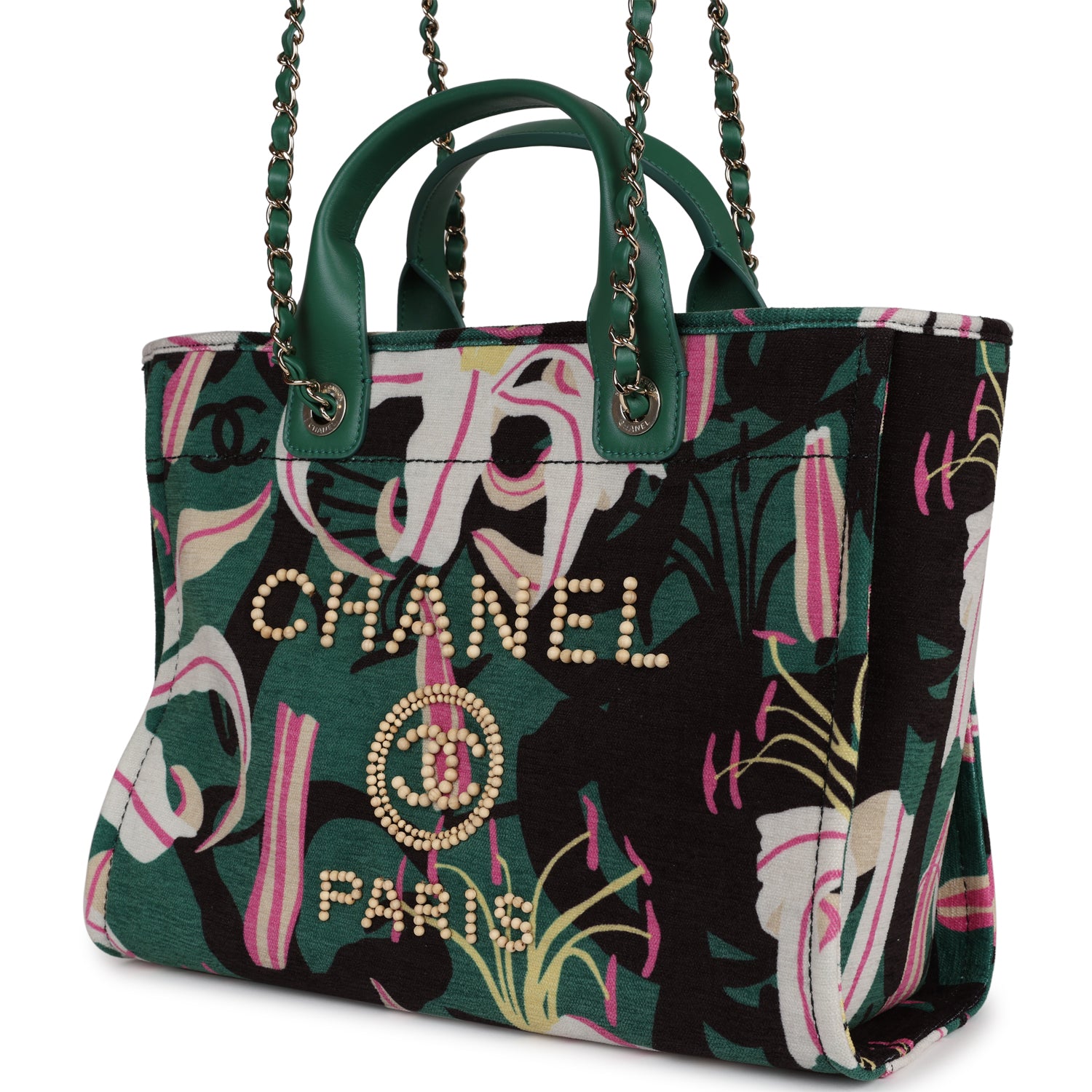 This small Deauville bag is in Green and Pink velvet with light gold tone hardware; featuring a tropical floral print. a large CC signature and Chanel logo on the front. removable pouch and interwoven light gold tone chain link and green leather shoulder straps.