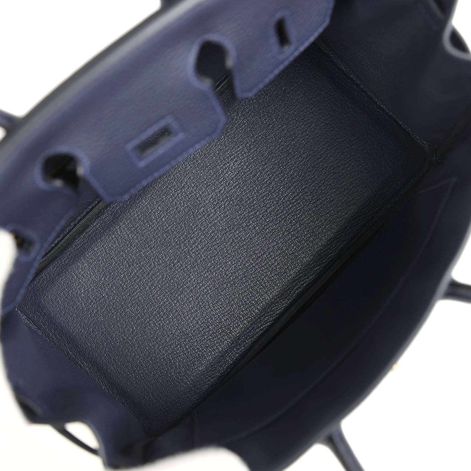 The interior is lined with Blue Nuit chevre. has one zip pocket with an Hermes engraved zipper pull and an open pocket on the opposite side.