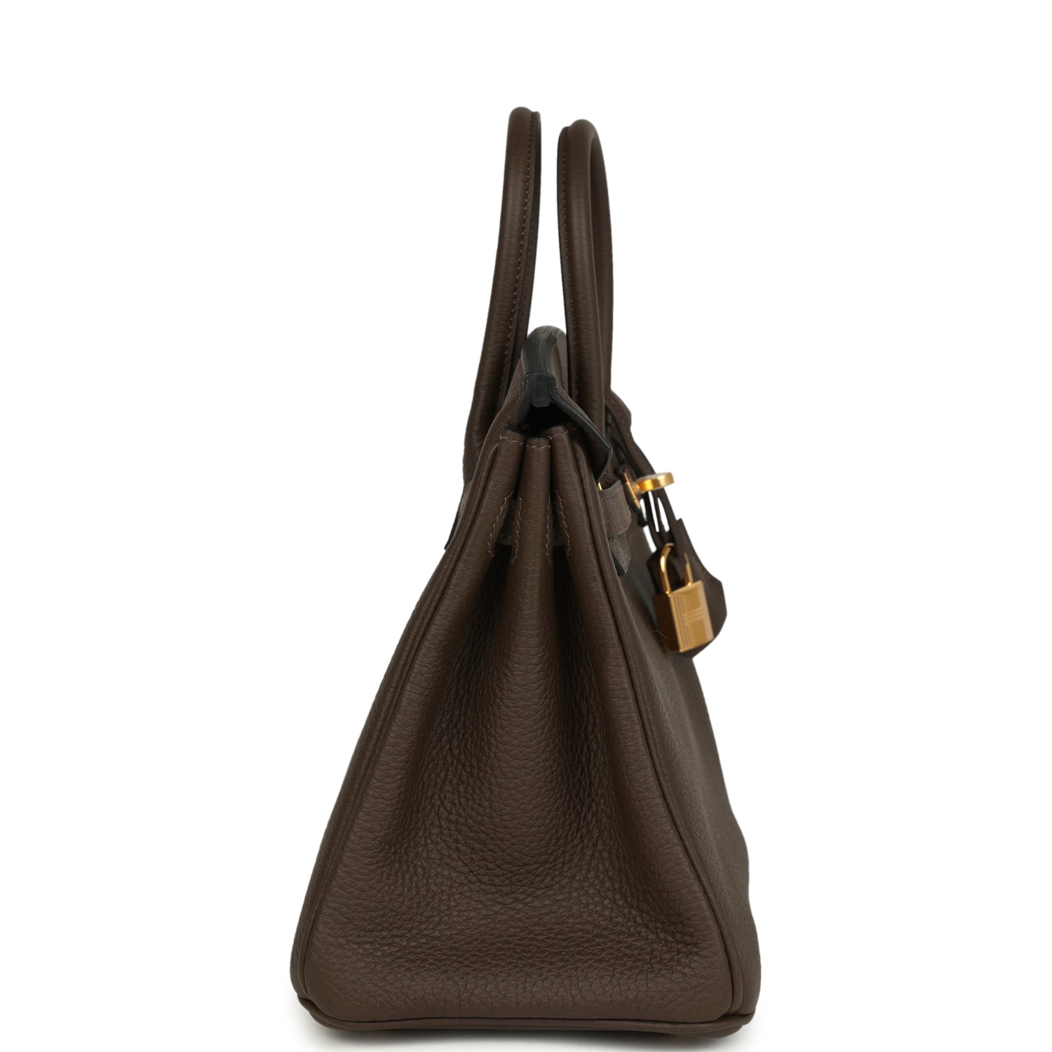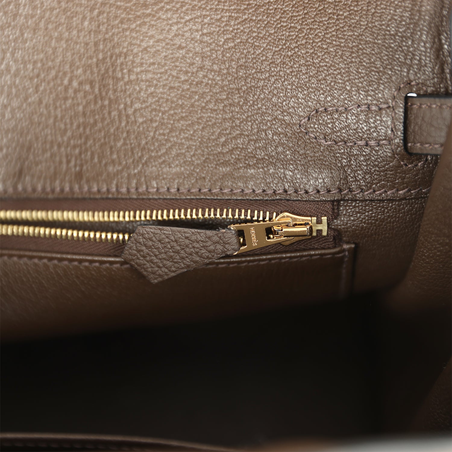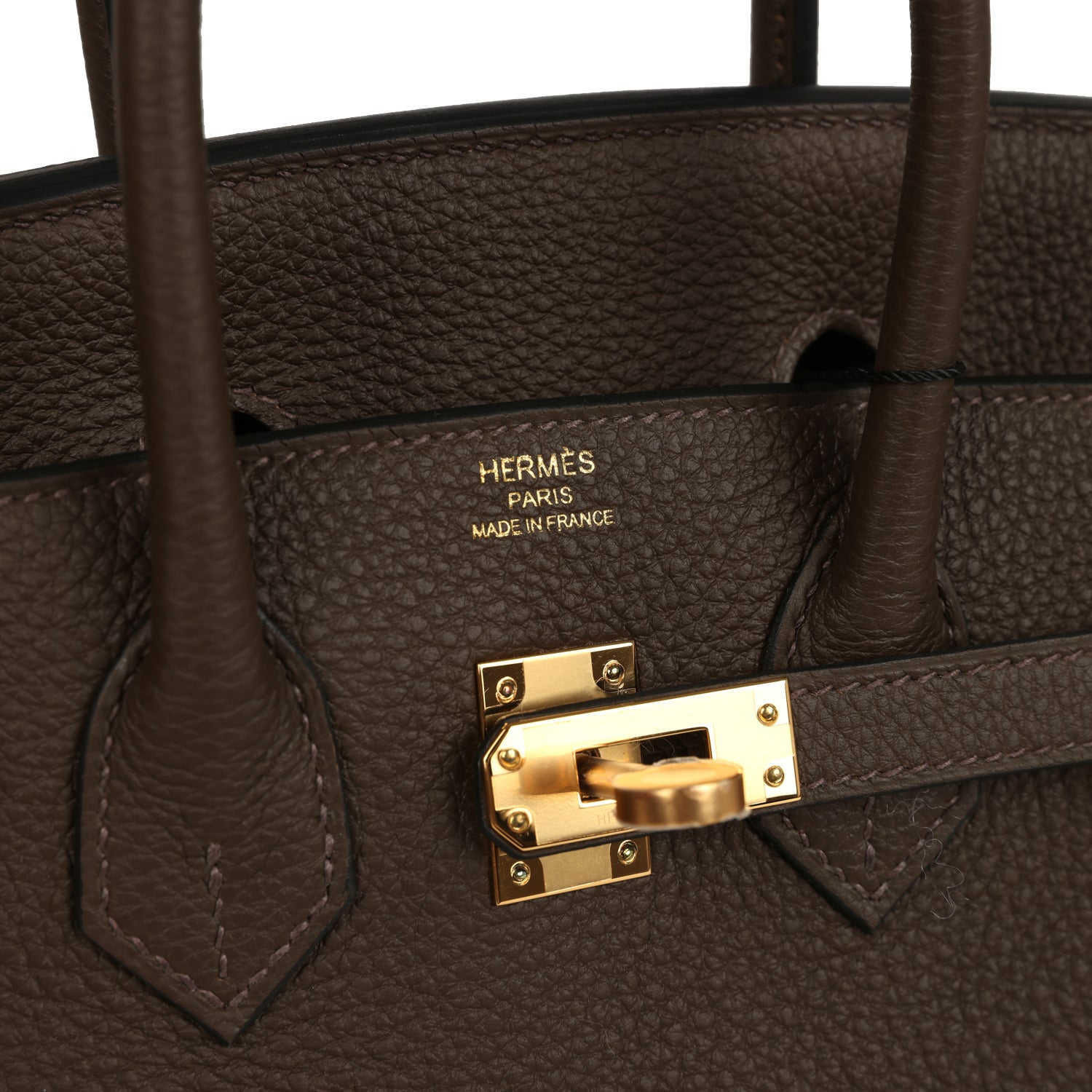 This Birkin is in Ebene togo leather with gold hardware. has tonal stitching. front flap. two straps with center toggle closure. clochette with lock and two keys. and double rolled handles.