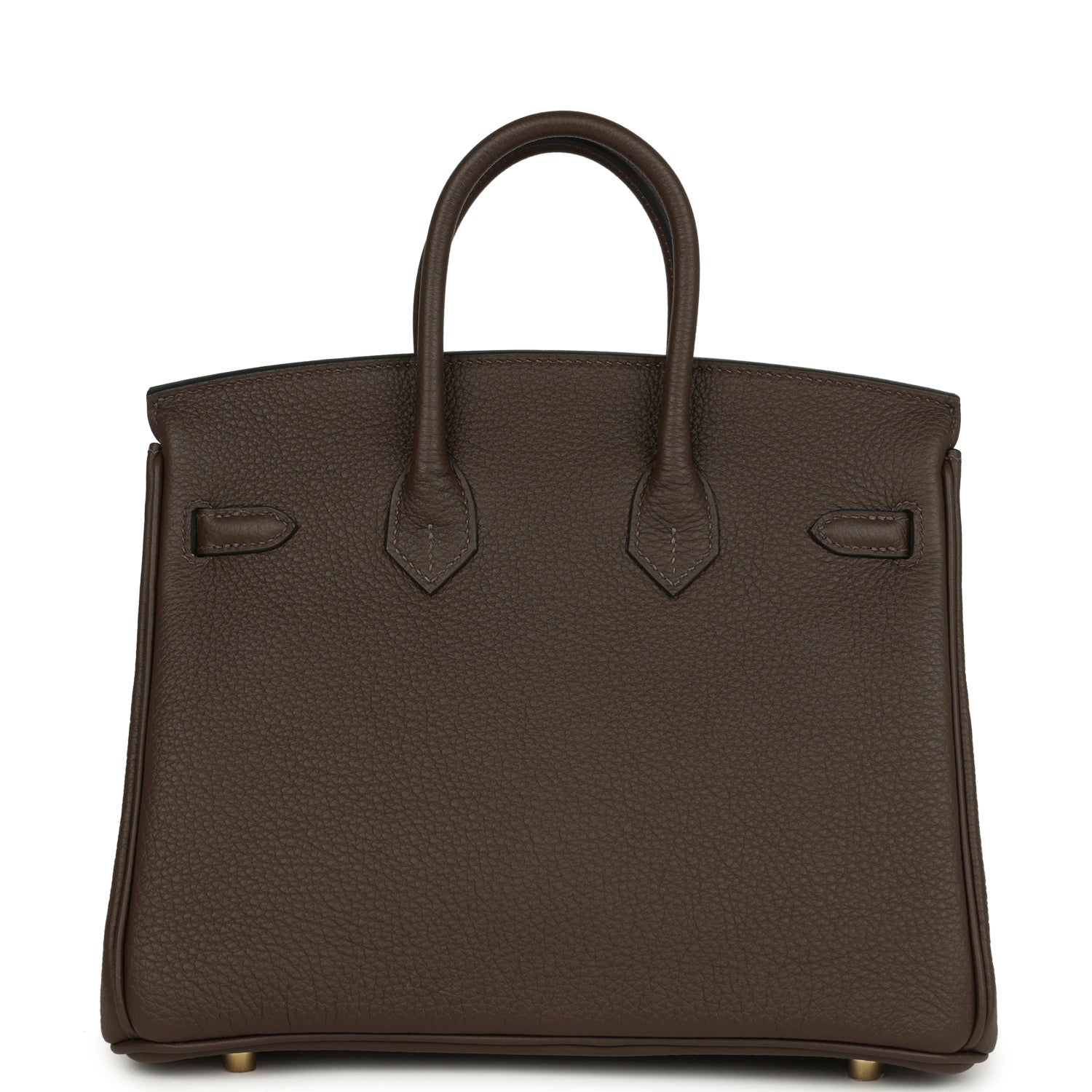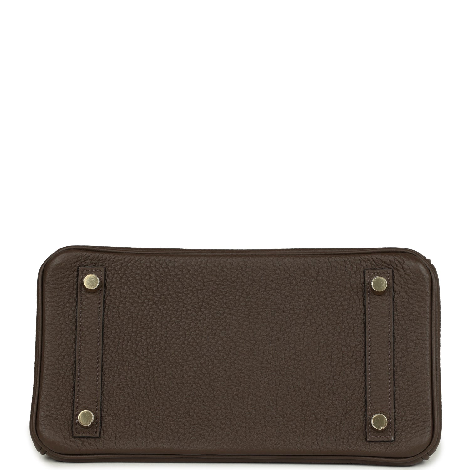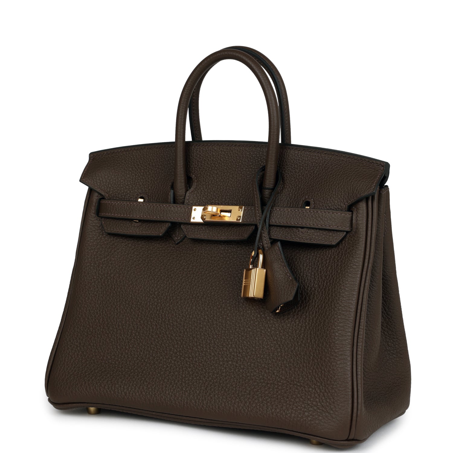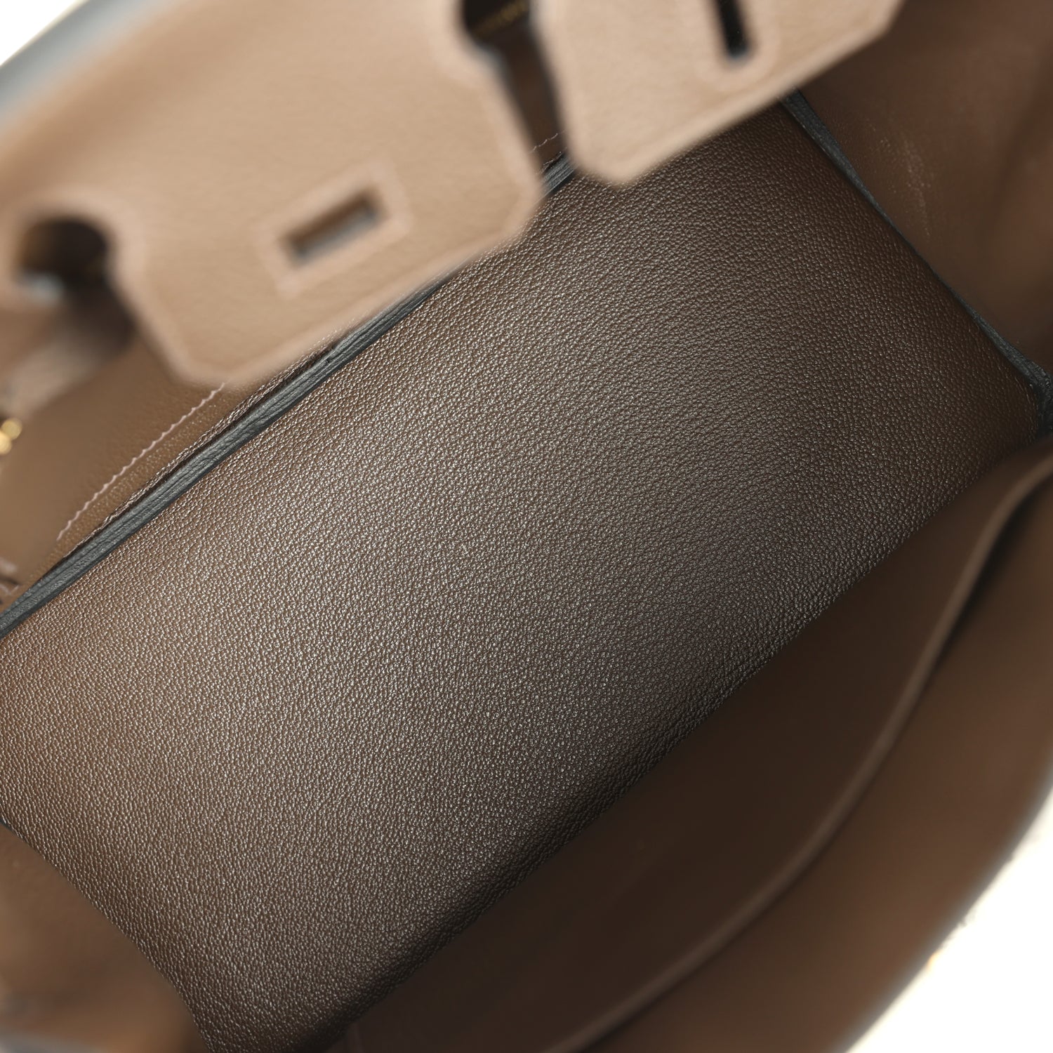 This Birkin is in Ebene togo leather with gold hardware. has tonal stitching. front flap. two straps with center toggle closure. clochette with lock and two keys. and double rolled handles.