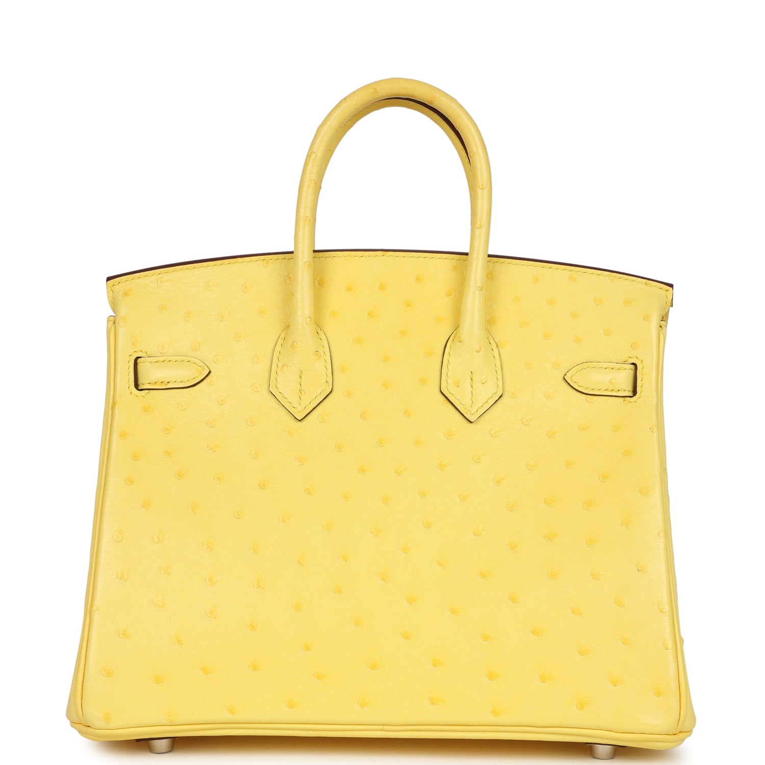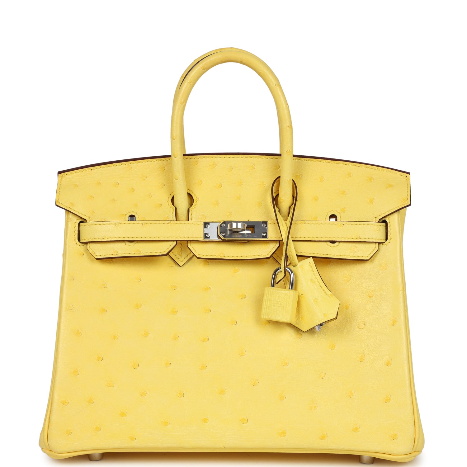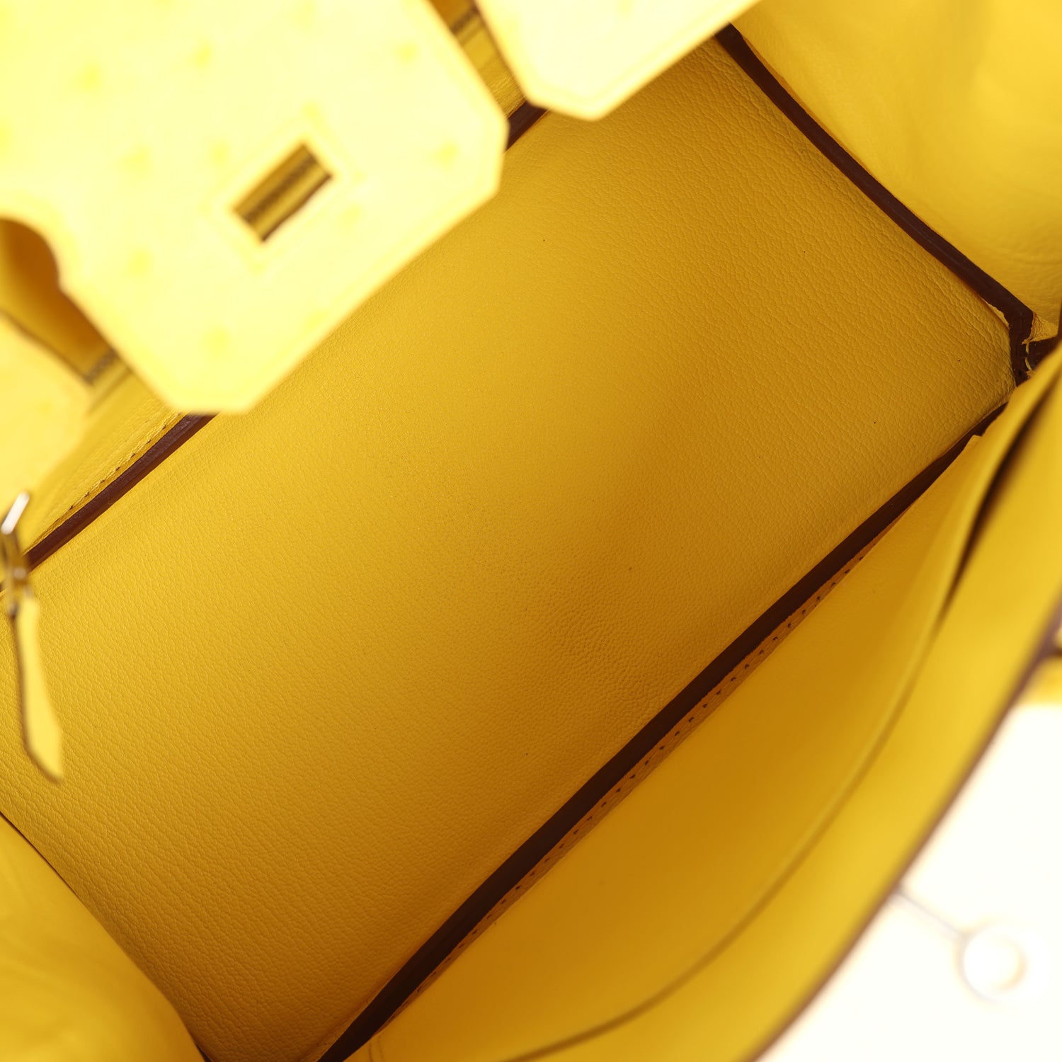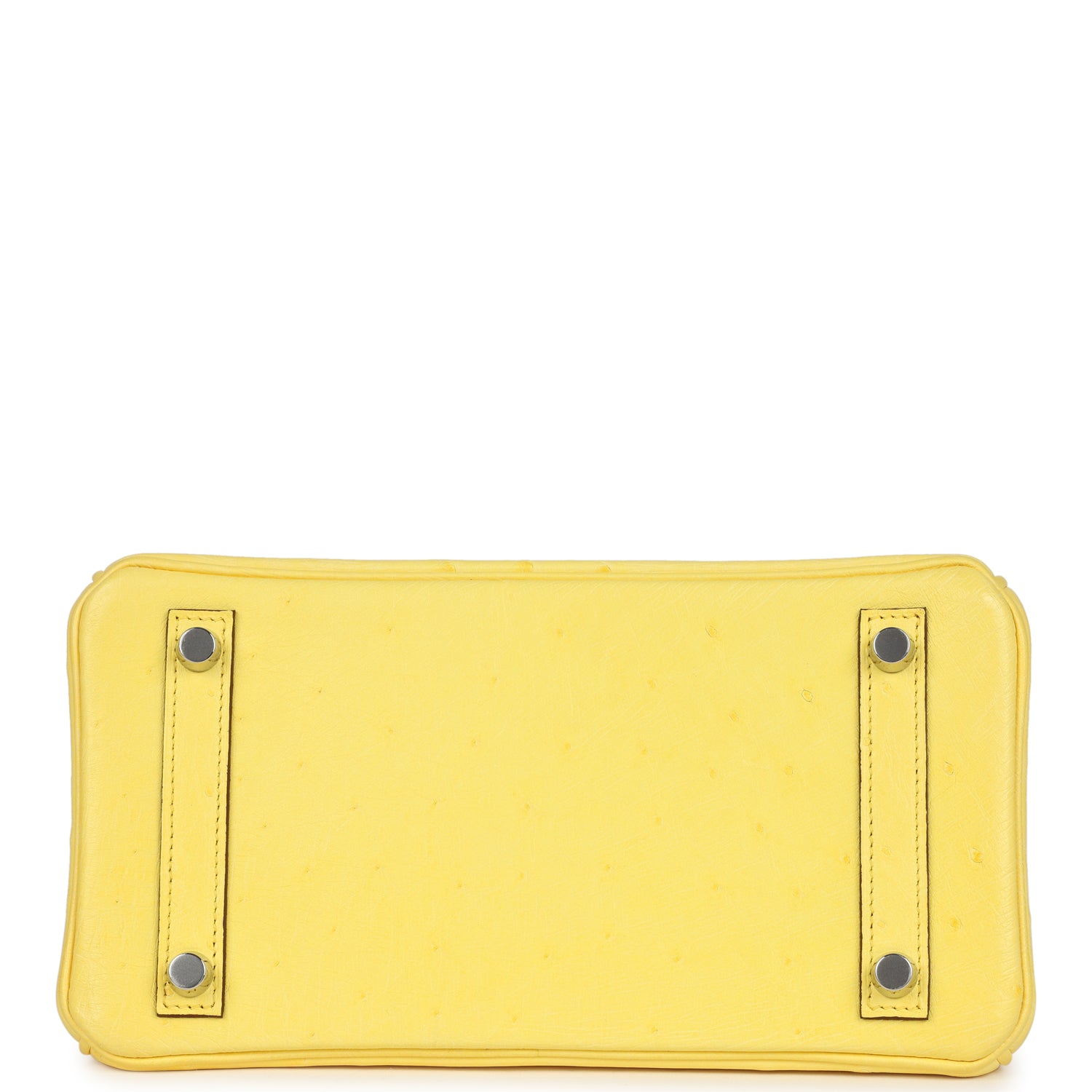 This Birkin is in Jaune Citron Ostrich leather with palladium hardware. tonal stitching. front flap with two straps. front toggle closure. clochette with lock and two keys. and two rolled handles.