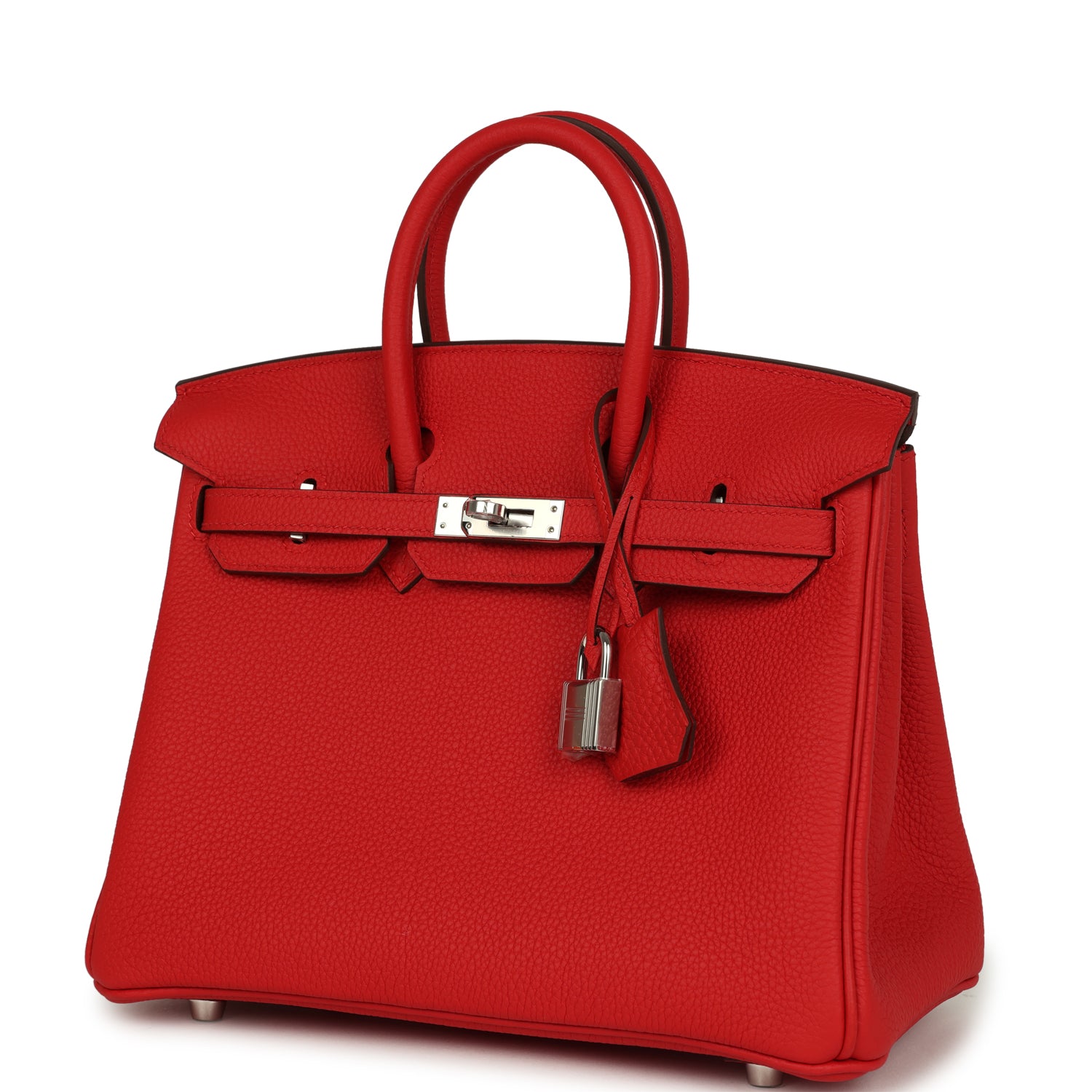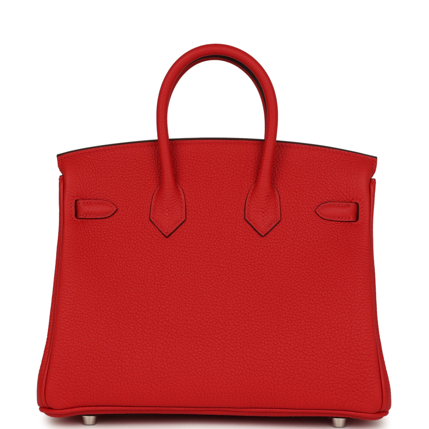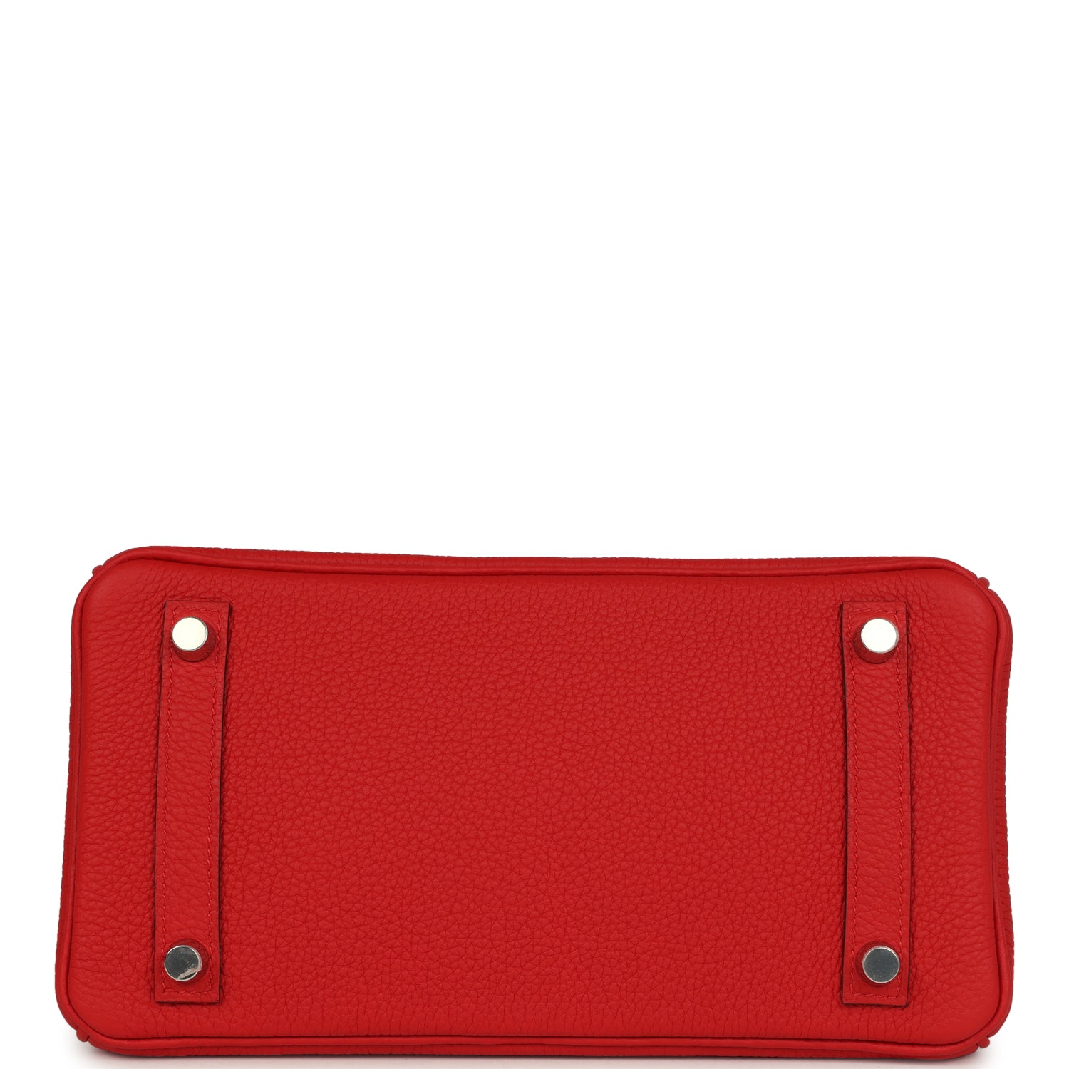 This Birkin is in Rouge Radieux togo leather with palladium hardware and has tonal stitching. front flap. two straps with center toggle closure. clochette with lock and two keys. and double rolled handles.