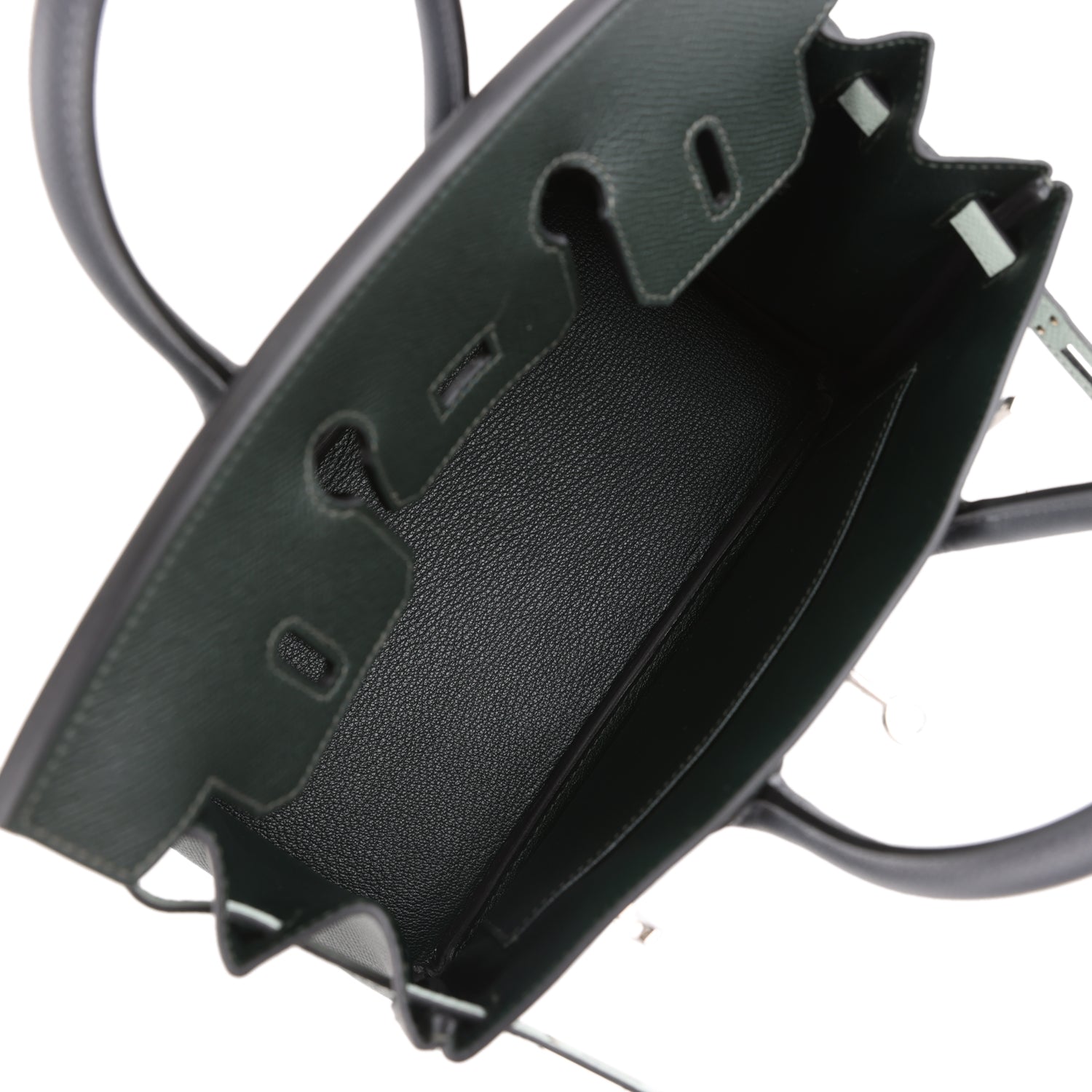 This Tricolor Birkin is in Vert Fonce. Ardoise. and Vert Peppermint epsom leather with palladium hardware. has tonal stitching. front flap. two straps with center toggle closure. clochette with lock and two keys. and double rolled handles.