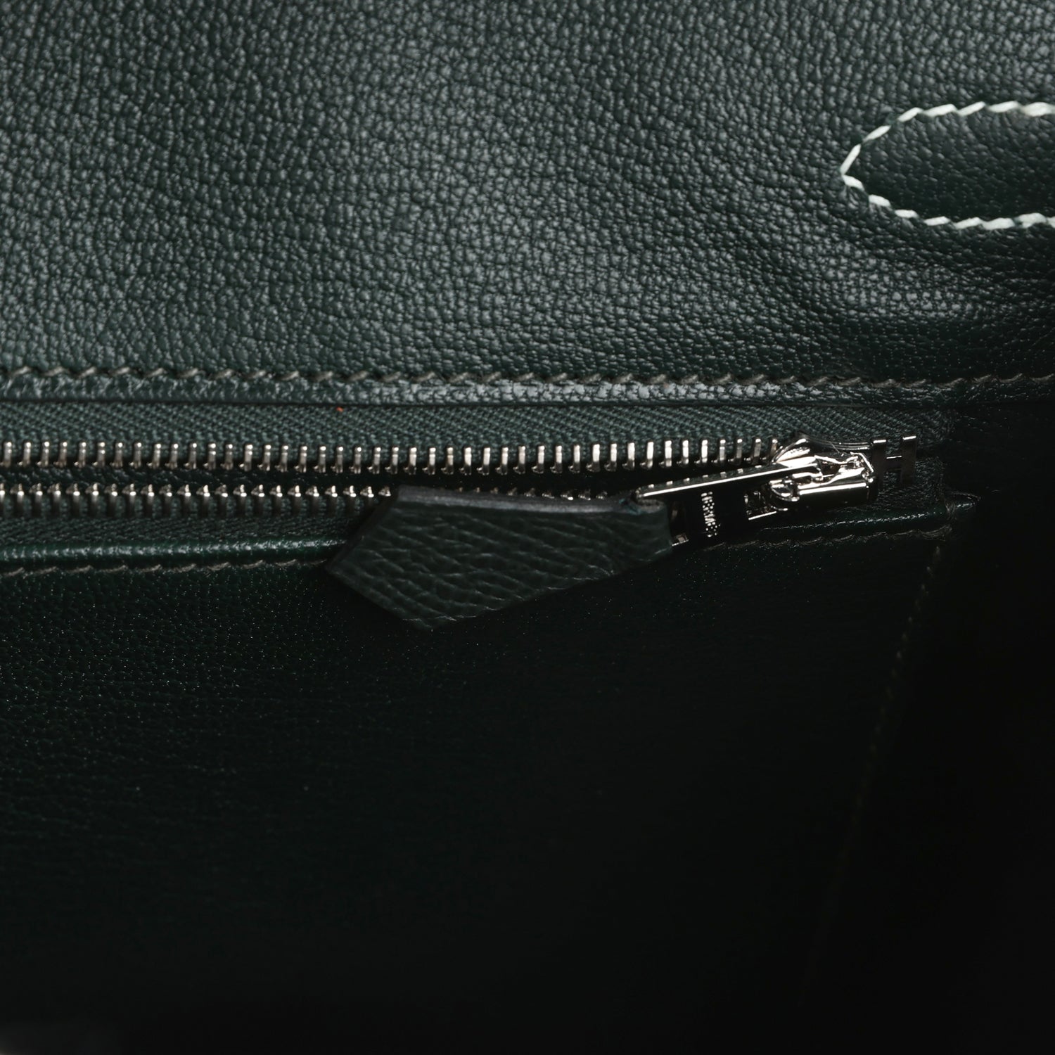 The interior is lined with Vert Fonce chevre leather and has one zip pocket with an Hermes engraved zipper pull and an open pocket on the opposite side.