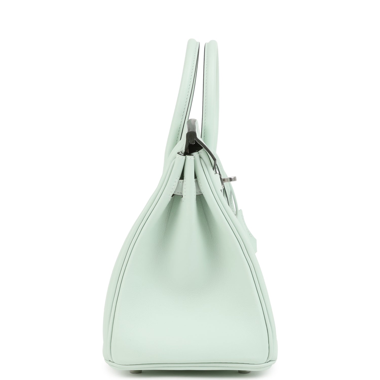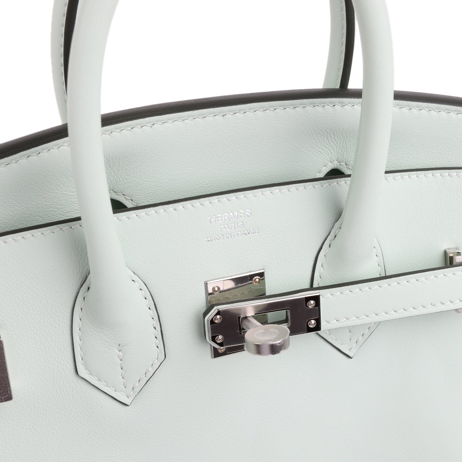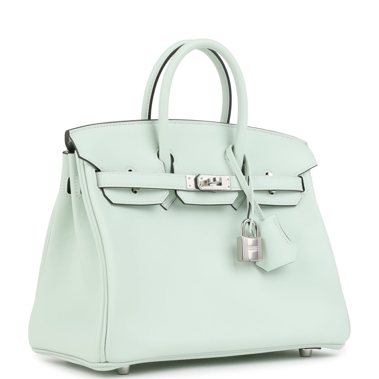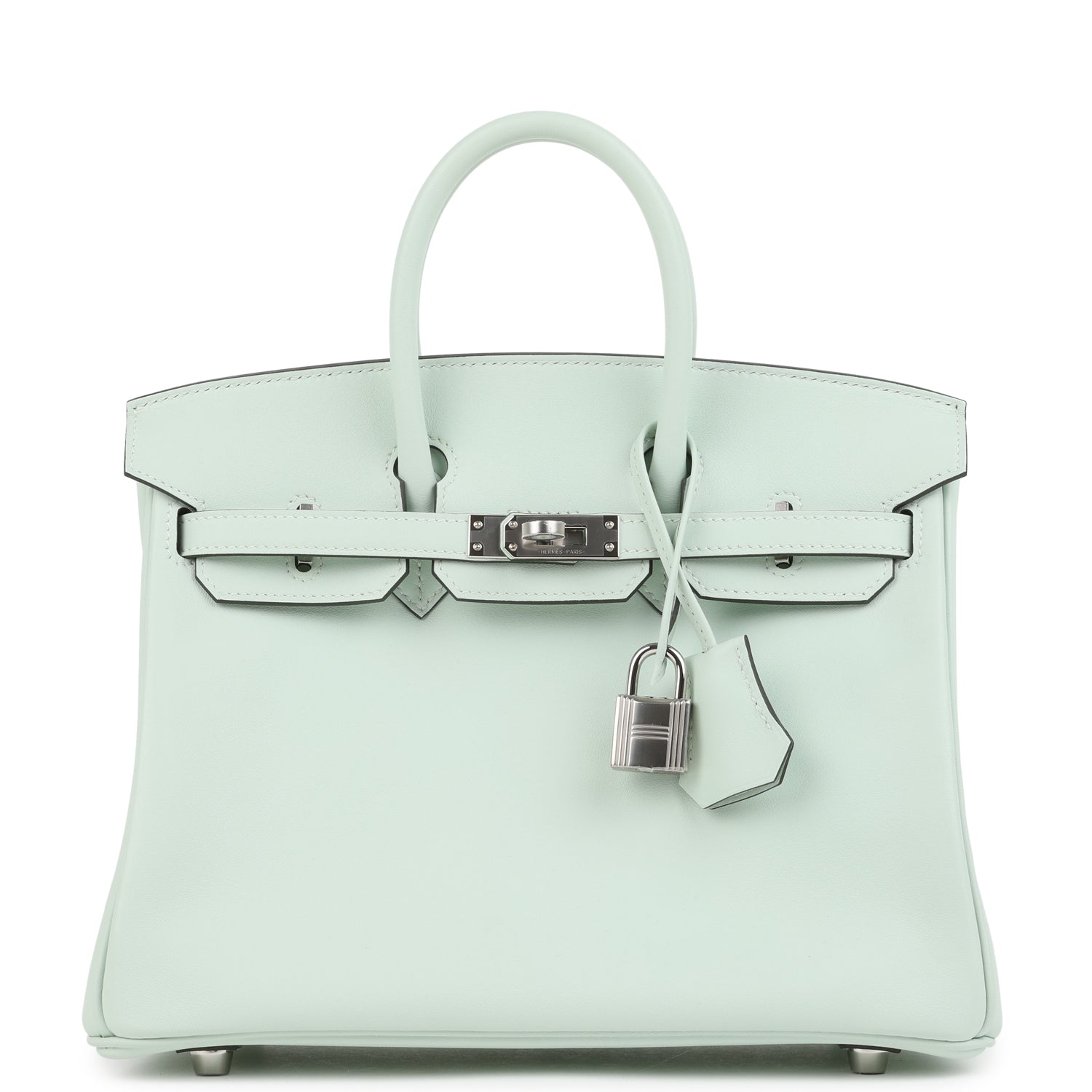 This Birkin is in Vert Peppermint Swift leather with palladium hardware and has tonal stitching. two straps with front toggle closure. clochette with lock and two keys and double rolled handles.