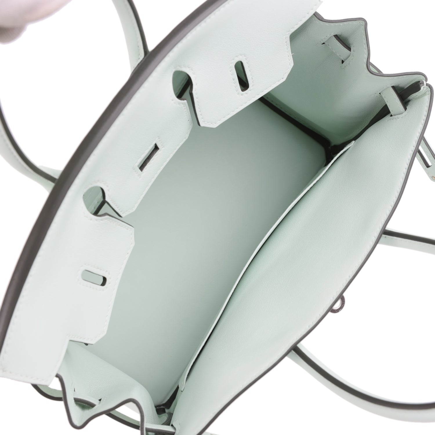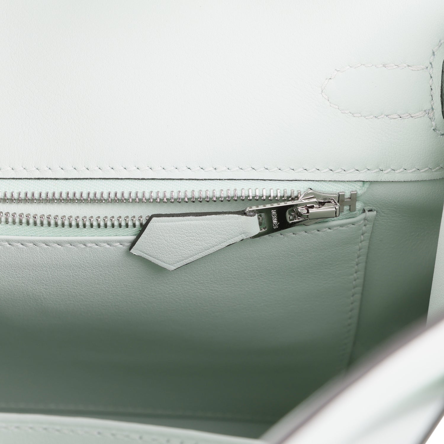 The interior is lined with Vert Peppermint swift leather and has one zip pocket with an Hermes engraved zipper pull and an open pocket on the opposite side.