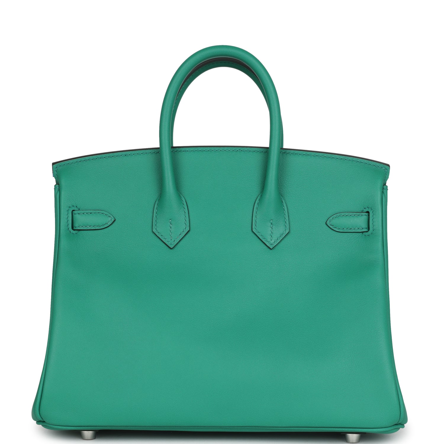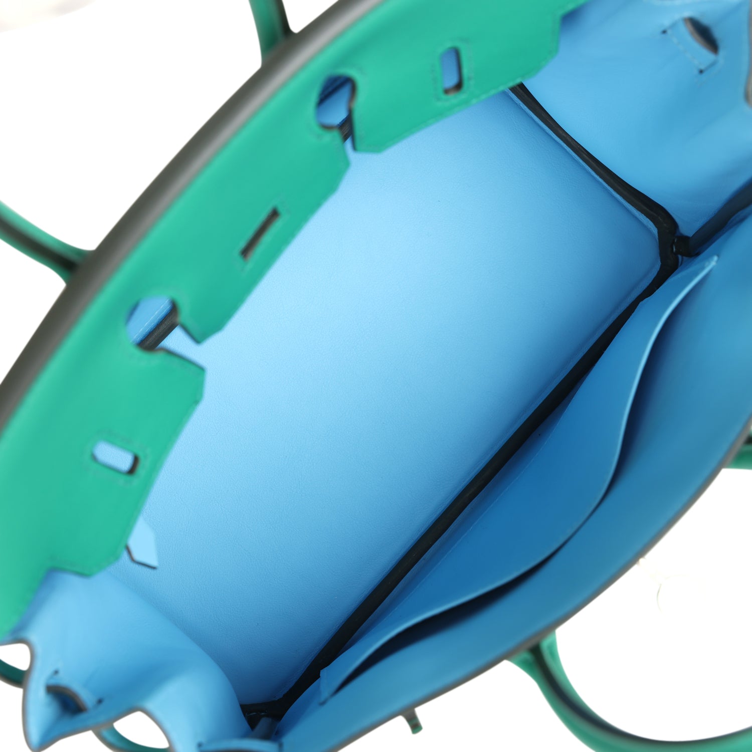This Birkin is in Vert Vertigo and Bleu Celeste swift leather with palladium hardware and has tonal stitching. front flap. two straps with center toggle closure. clochette with lock and two keys. and double rolled handles.
