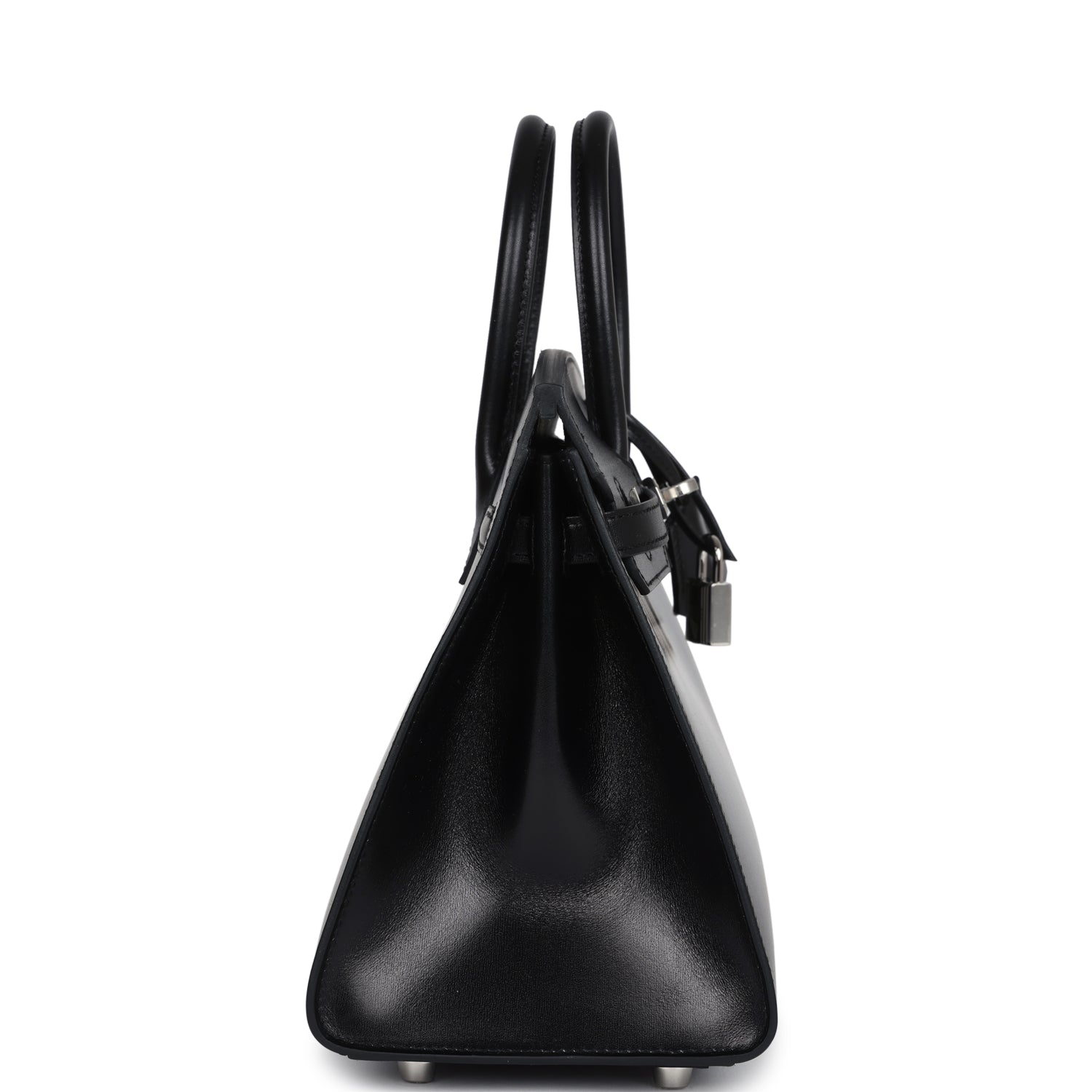 This Birkin is in Black box calf leather with palladium hardware and has tonal stitching. front flap. two straps with center toggle closure. clochette with lock and two keys. and double rolled handles.