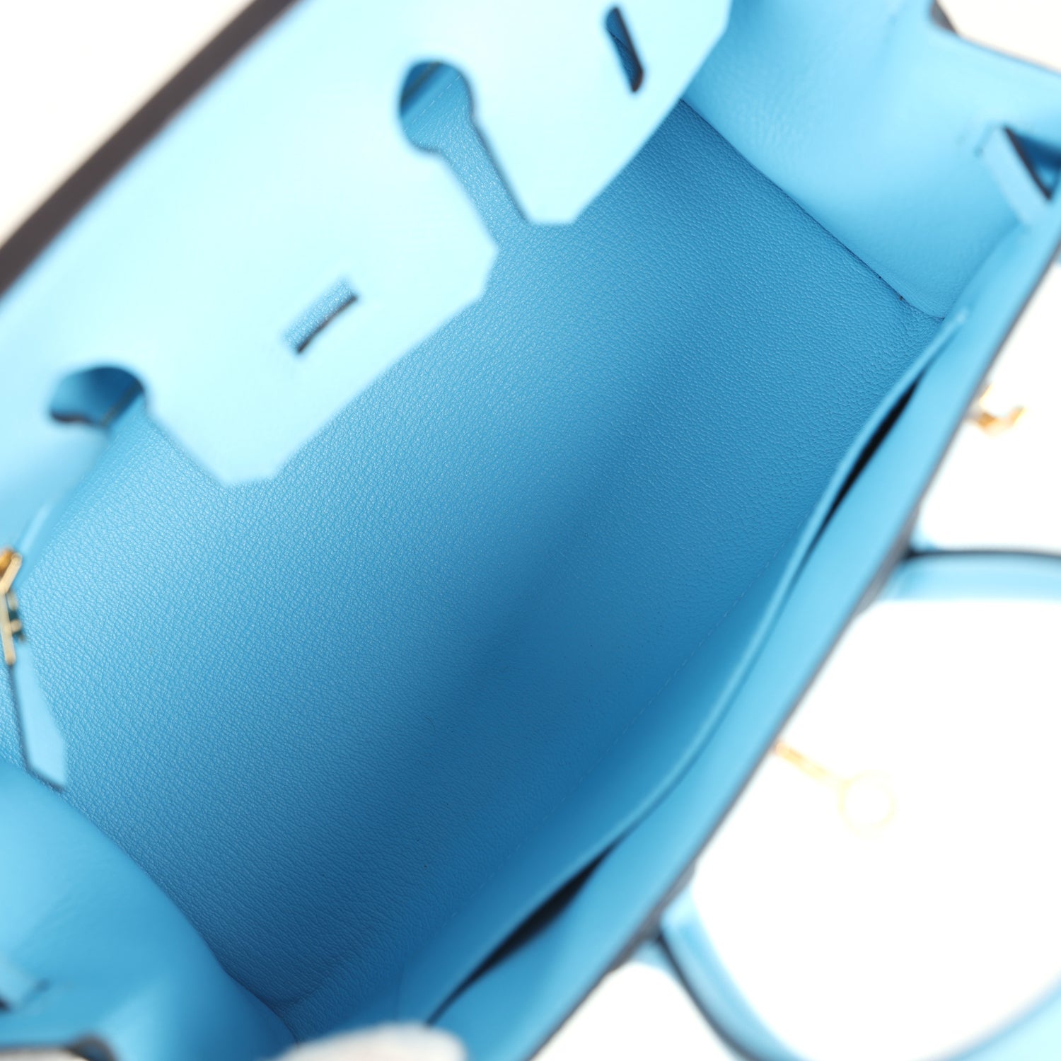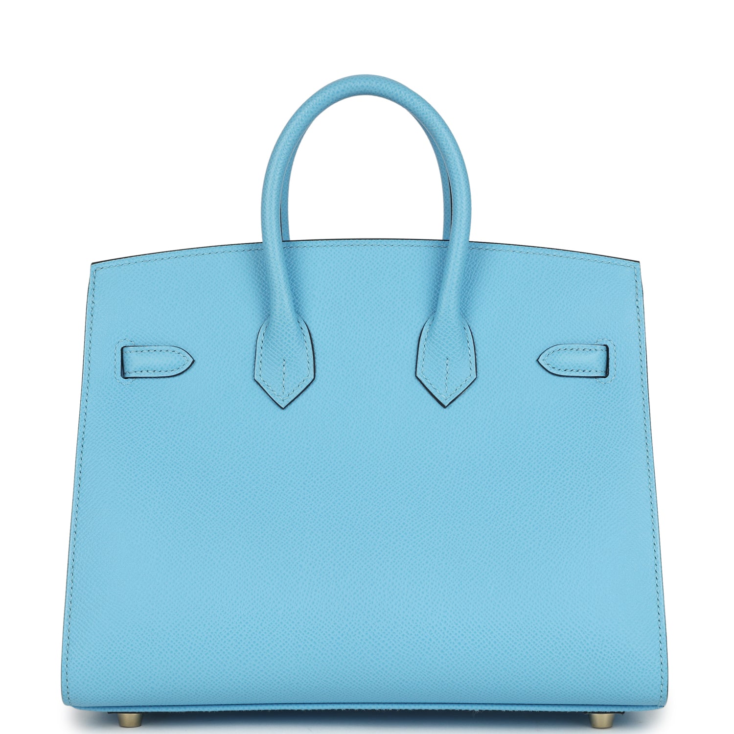 This Birkin. in the Sellier style. is in Celeste epsom leather with gold hardware. has tonal stitching. front flap. two straps with center toggle closure. clochette with lock and two keys. and double rolled handles.