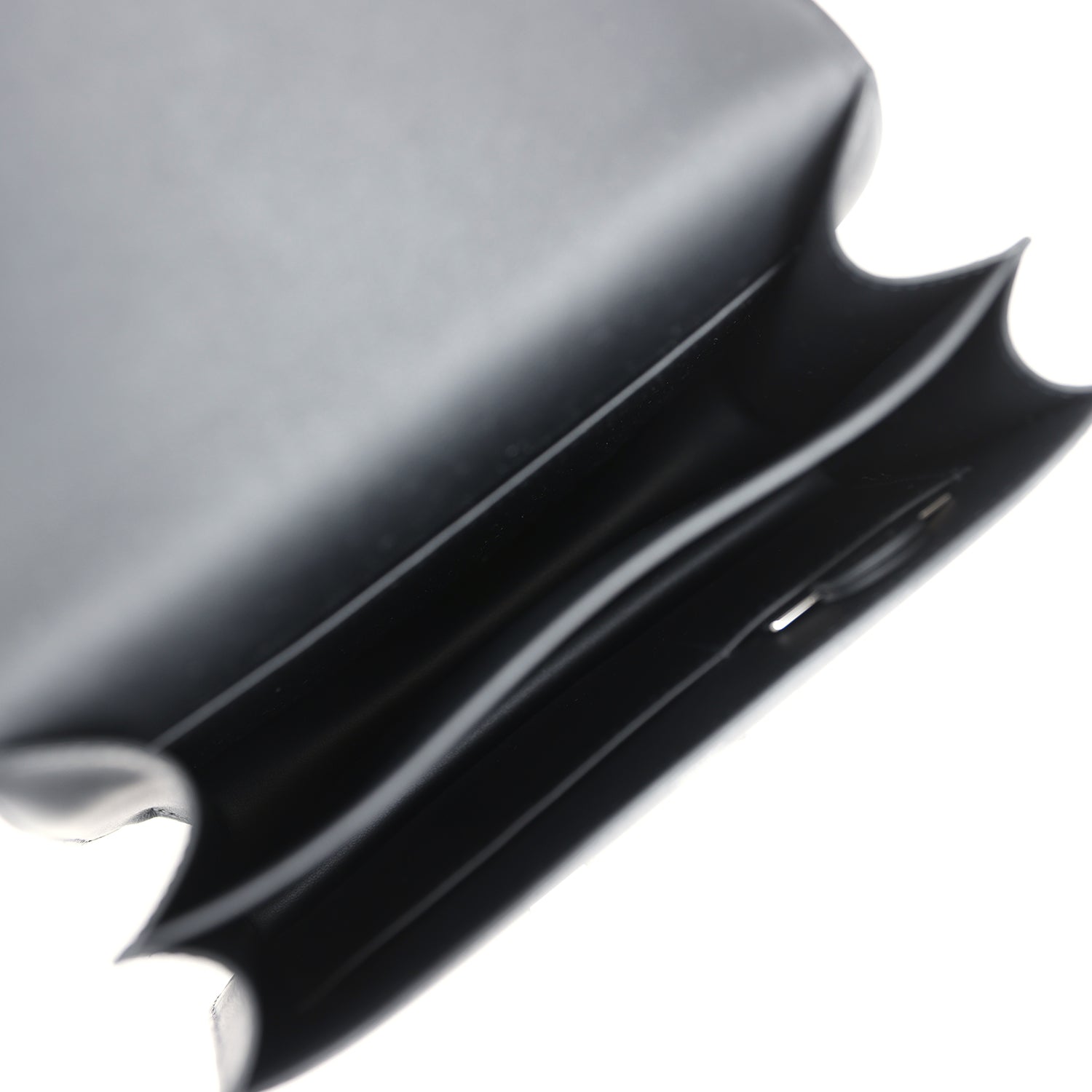 The interior is lined with Black lambskin and has two open pocket on the front wall. a removable mirror. a center divide. and a slit pocket on the back wall.