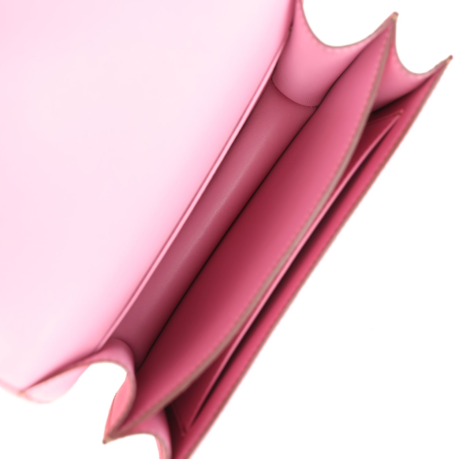 The interior is lined with Bubblegum 5P lambskin and has an open pocket on the front wall. a center divide. and a slit pocket on the back wall.