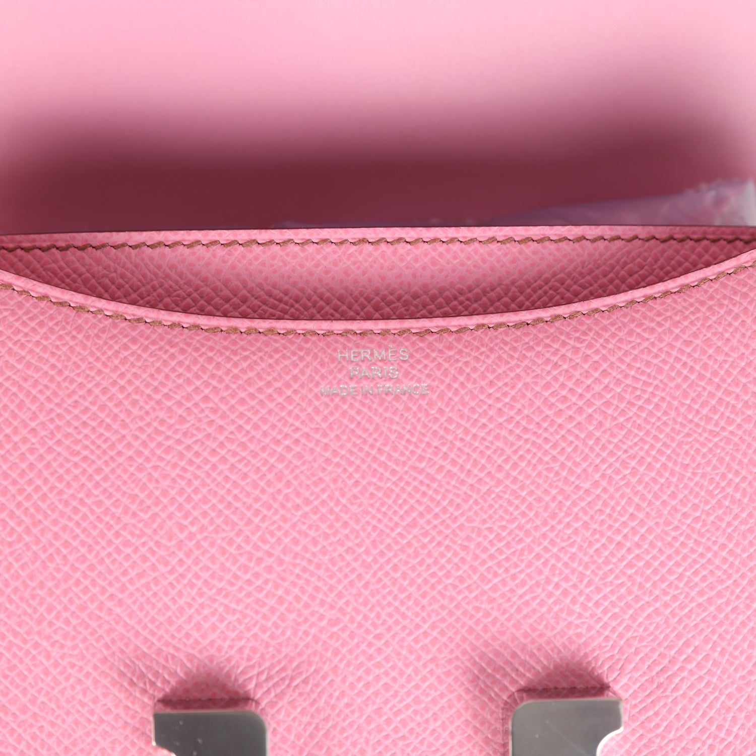 This Constance is in Bubblegum "5P" Pink epsom leather with palladium hardware and has contrast stitching. a metal "H" snap lock closure and an adjustable shoulder strap.