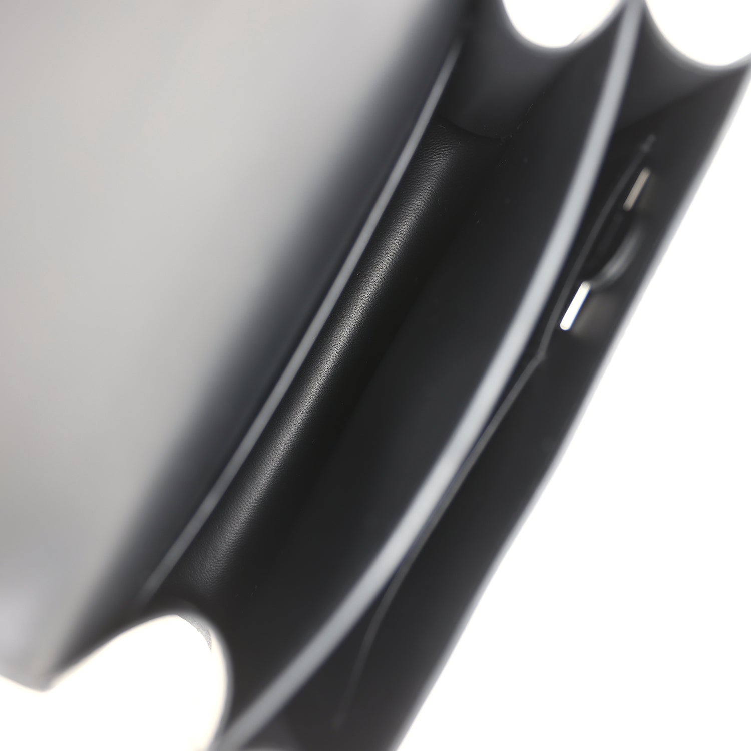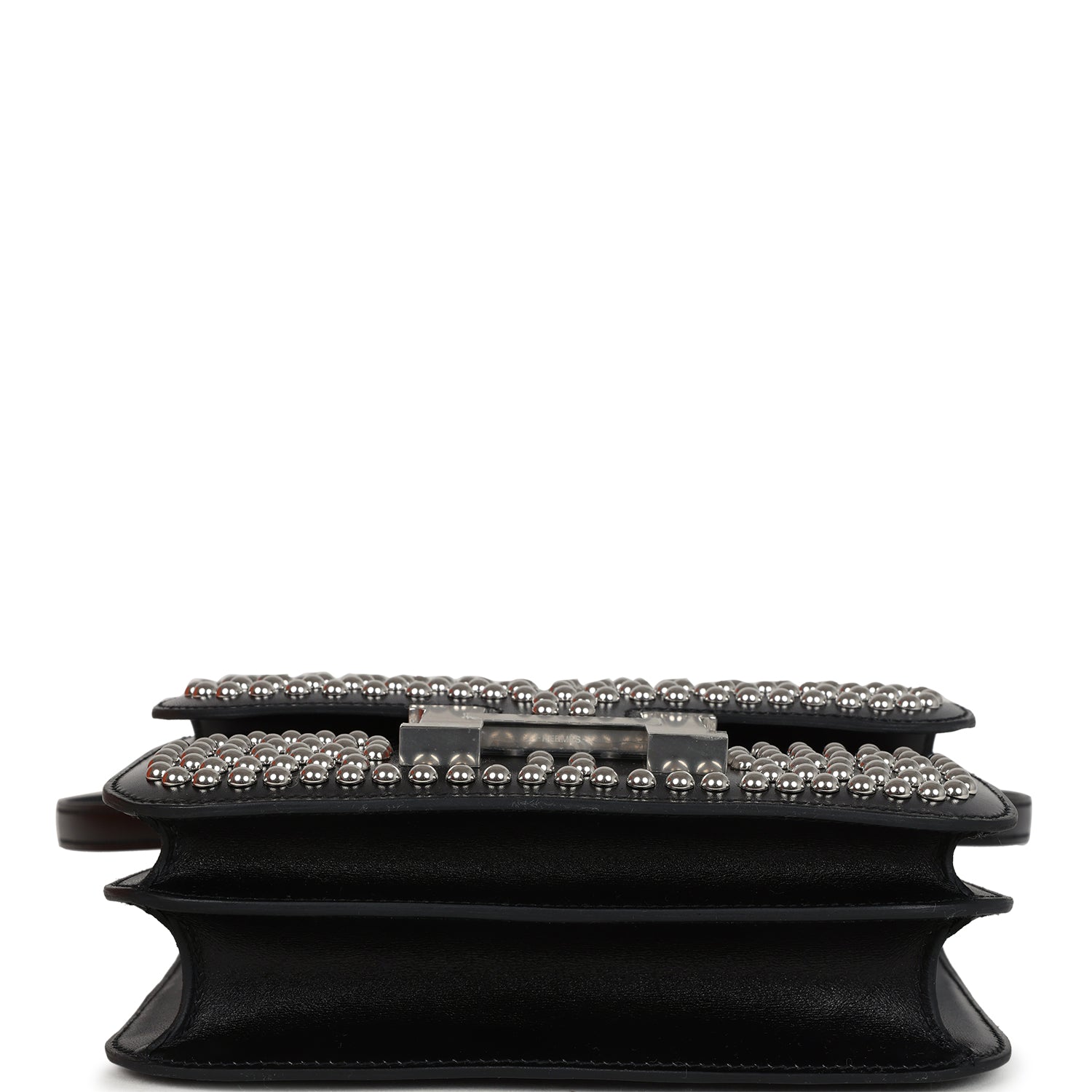 This Limited Edition Constance Clouté bag is in Black box calf leather with palladium hardware and palladium rounds studs on the front with tonal stitching. a metal "H" snap lock closure and adjustable shoulder strap.