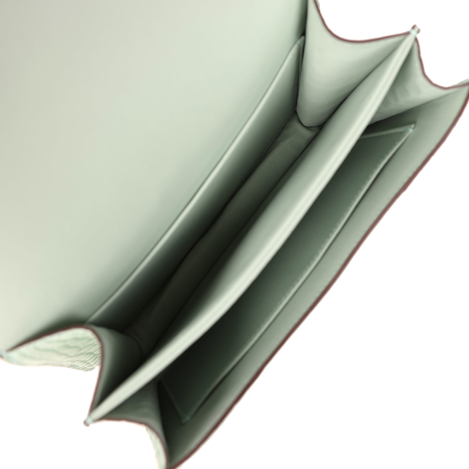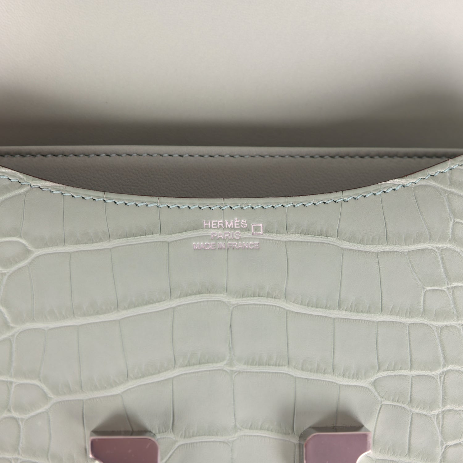 This Constance is in Vert D'Eau and Trench Matte Alligator Mississippiensis leather with palladium hardware. featuring tonal stitching. metal "H" snap closure. and an adjustable shoulder strap.