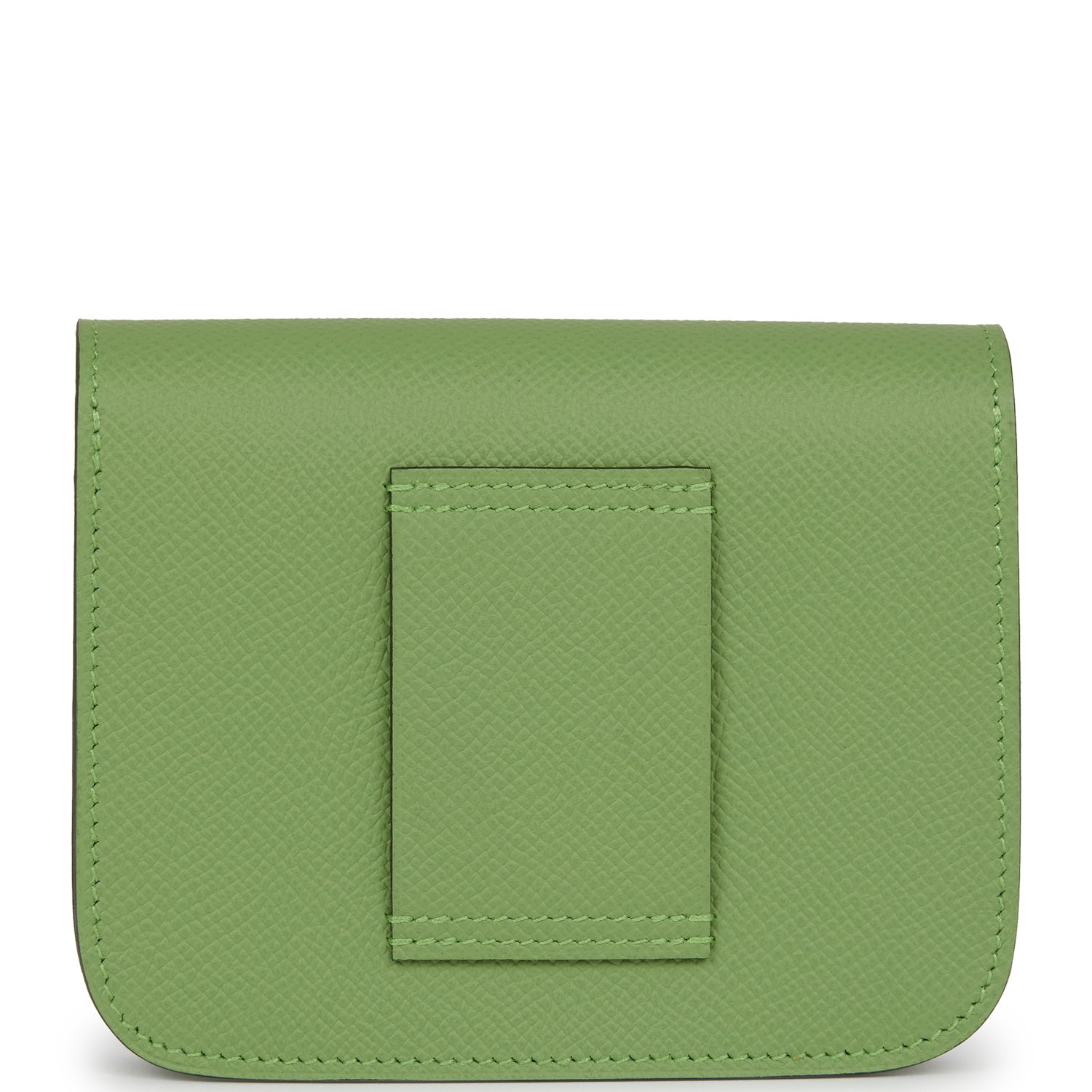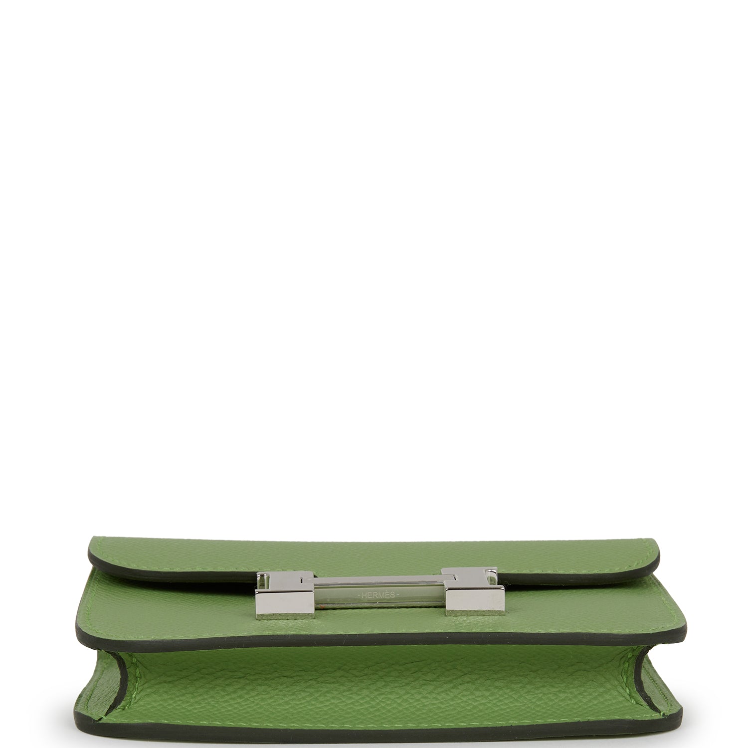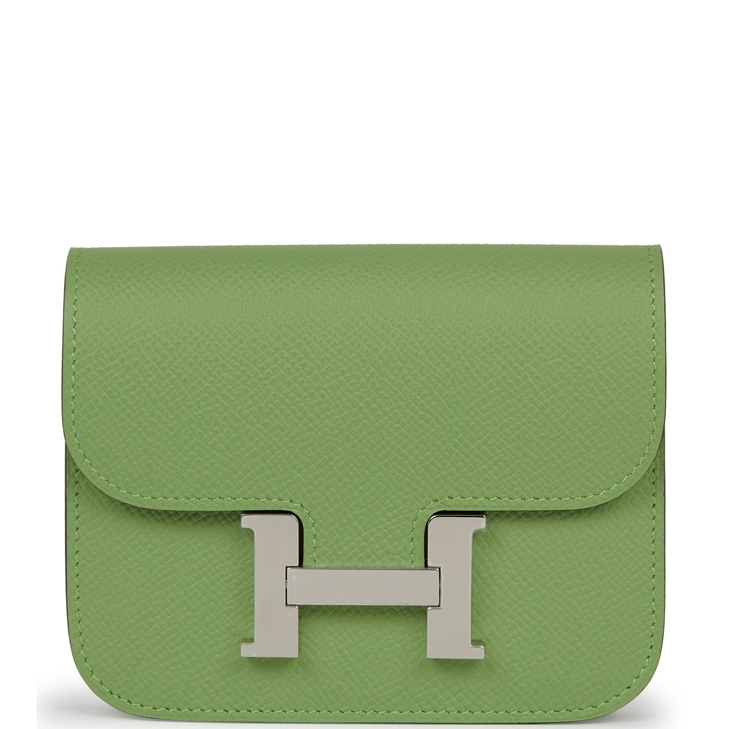 This Constance Slim Wallet is in Vert Criquet epsom leather with palladium hardware and has tonal stitching. rear belt loop. front flap and removable coin pouch.