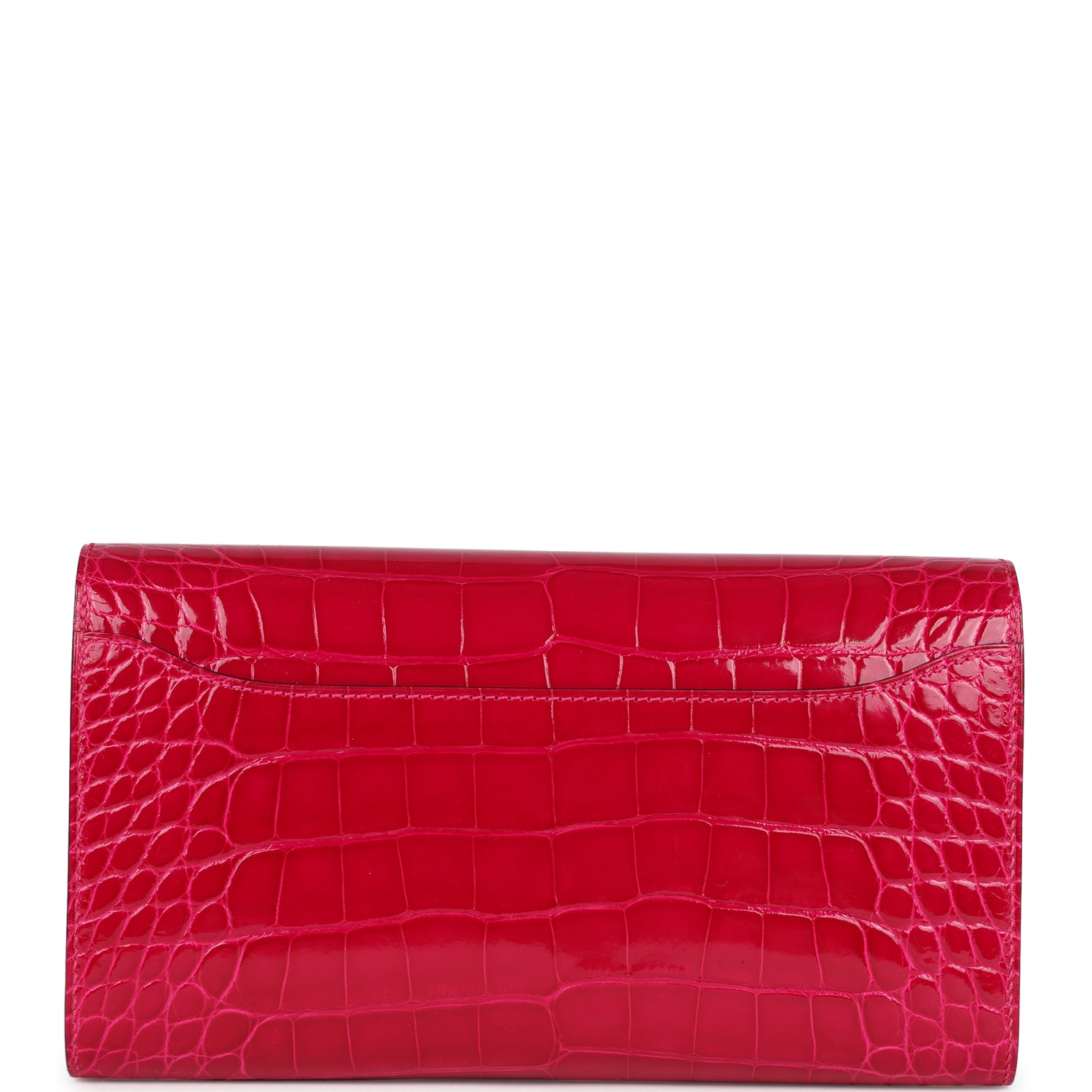 This Constance Wallet To Go is in Rose Mexico Shiny Alligator Mississippiensis with palladium hardware and has tonal stitching. metal "H" snap lock closure. open front compartment and removable crossbody strap.