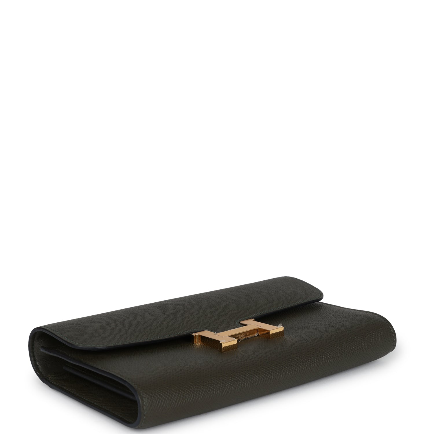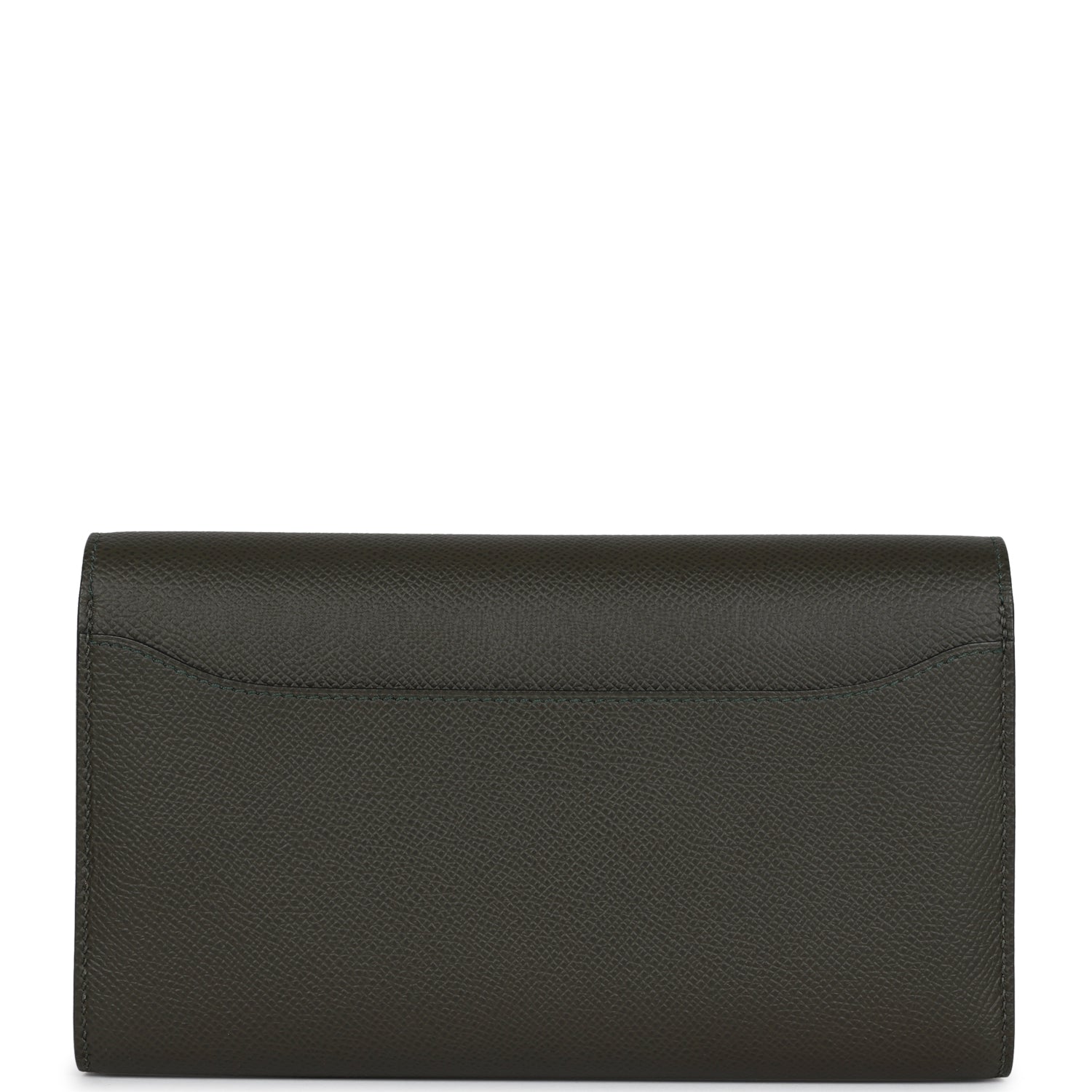 This Constance Wallet To Go is in Vert De Gris epsom leather with gold hardware and has tonal stitching. metal "H" snap lock closure. open front compartment and removable crossbody strap.