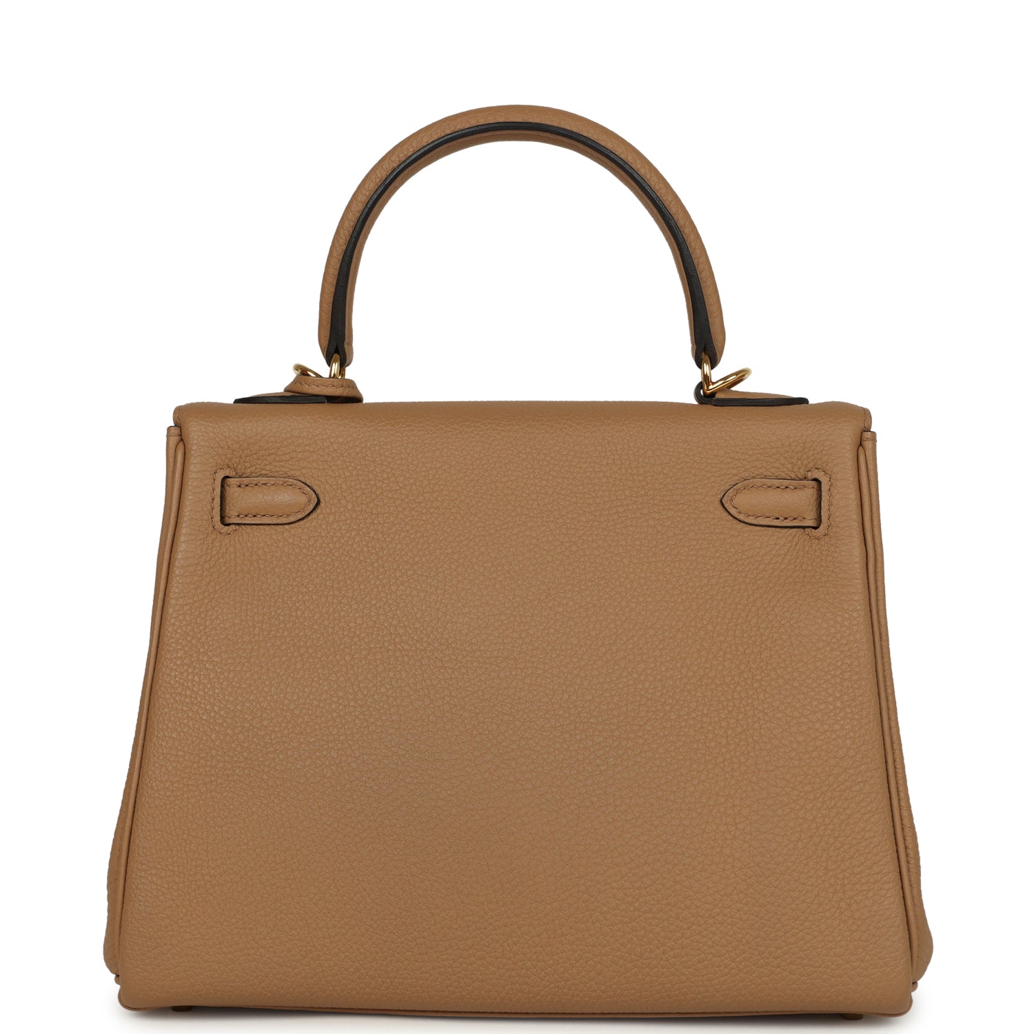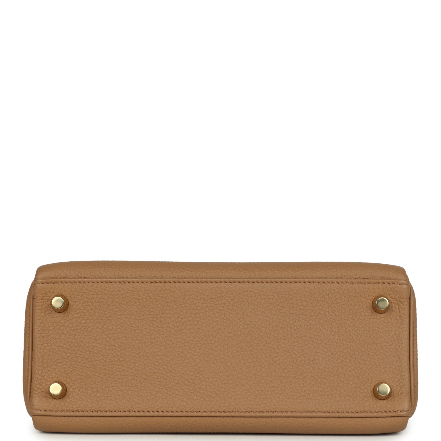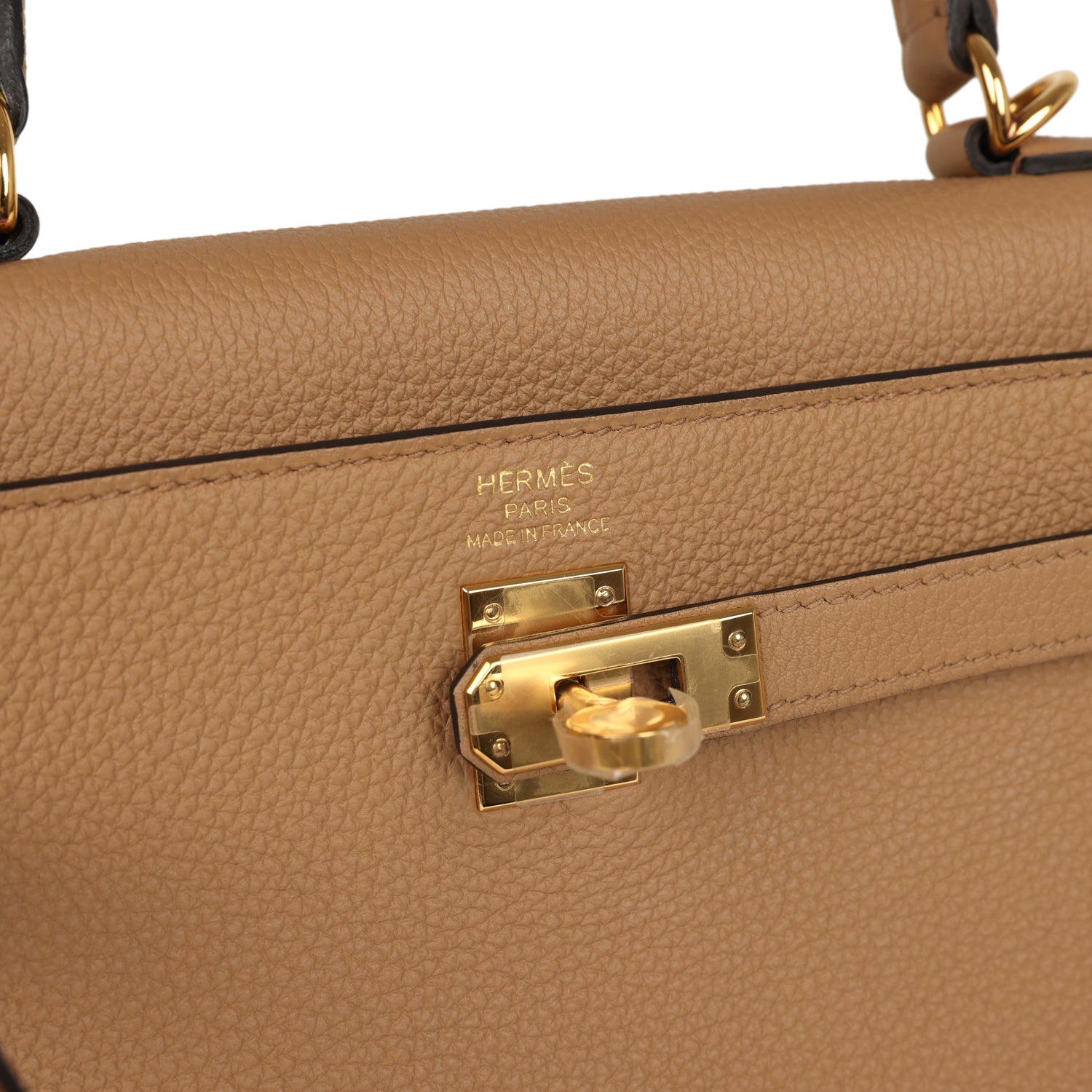 This Kelly. in the Retourne style. is in Chai togo leather with gold hardware has tonal stitching. front flap. two straps with center toggle closure. clochette with lock and two keys. single rolled handle and a removable shoulder strap.