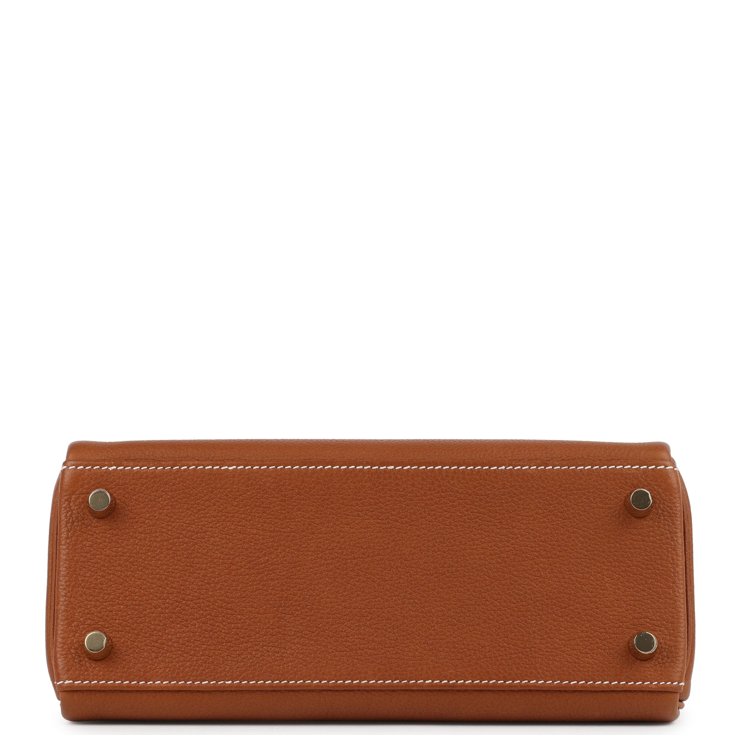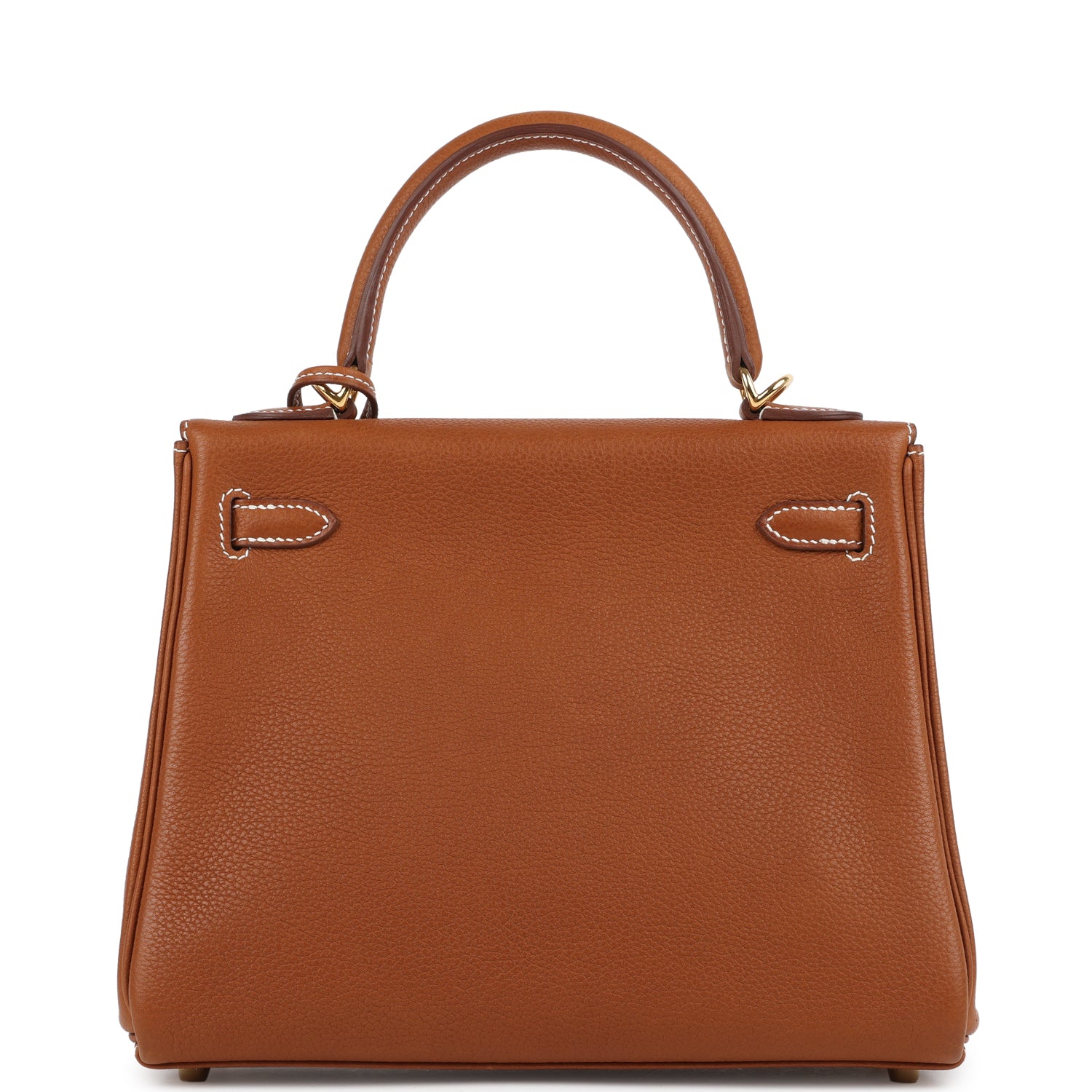 This Kelly. in the Retourne style. is in Fauve Barenia Faubourg leather with gold hardware. featuring has contrast stitching. front flap. two straps with center toggle closure. clochette with lock and two keys. single rolled handle and two removable shoulder straps; one leather and one Ficelle canvas shoulder strap.