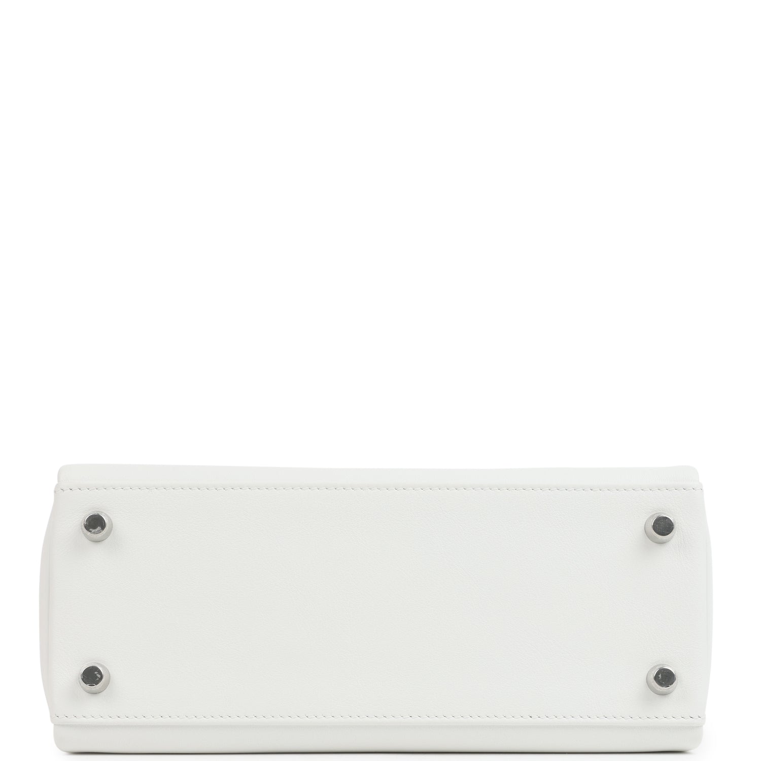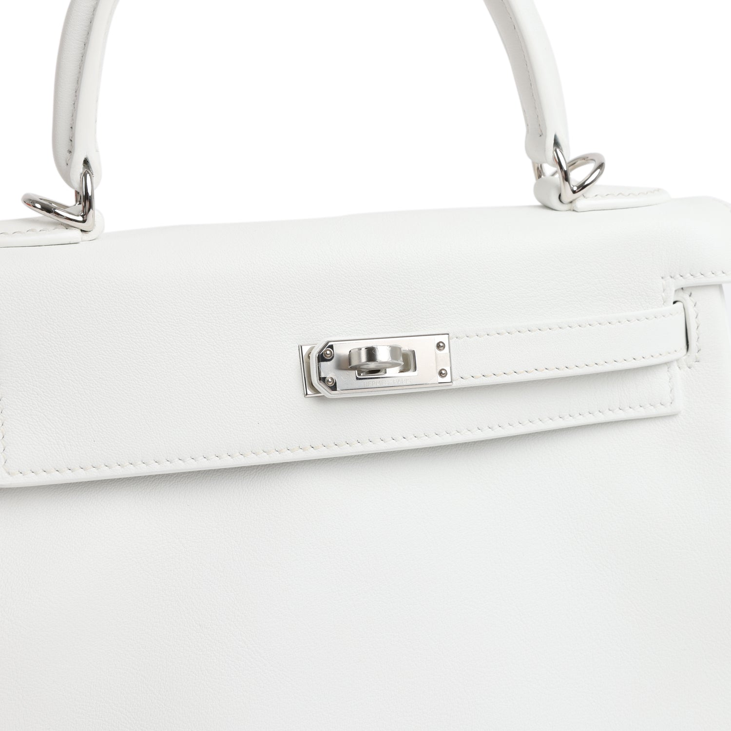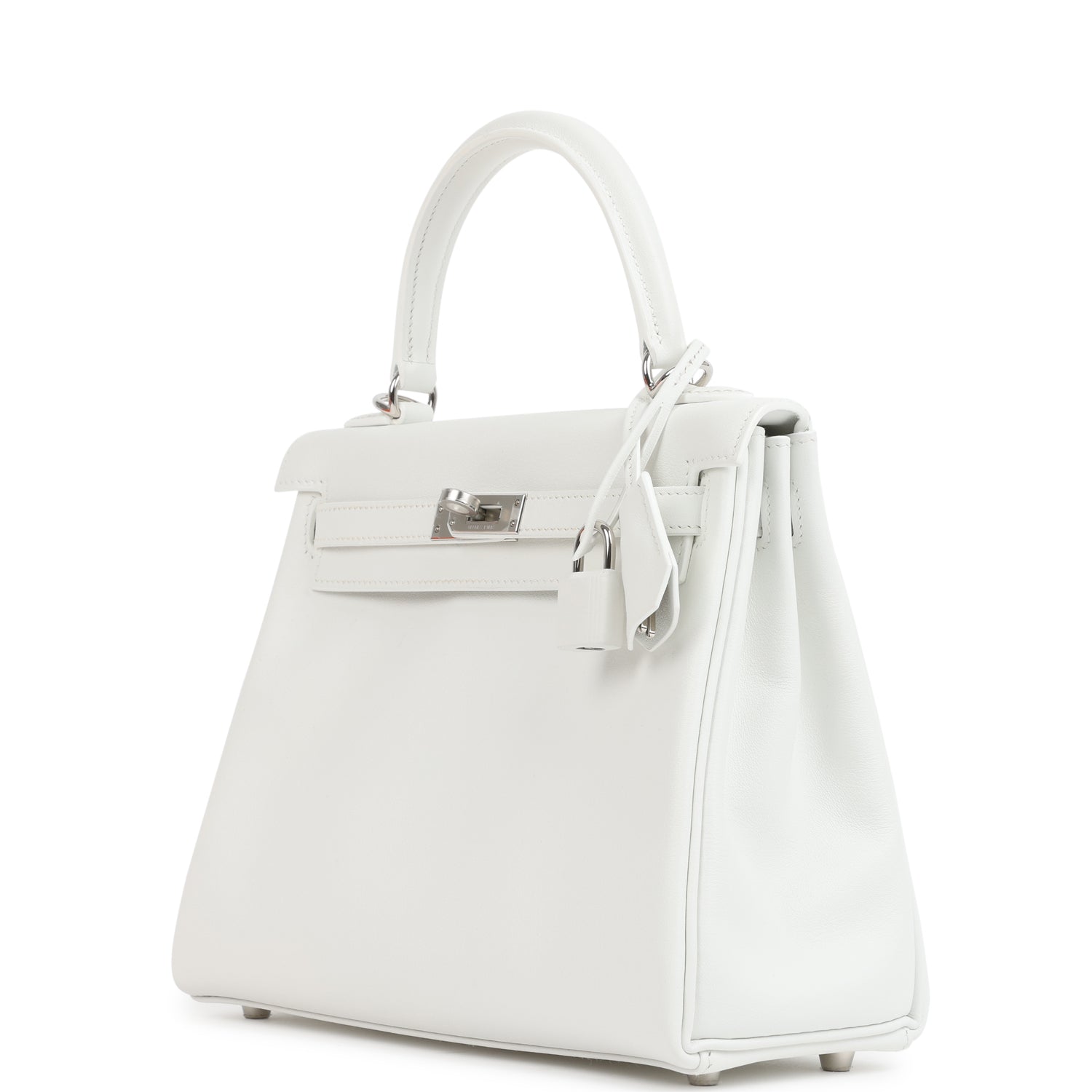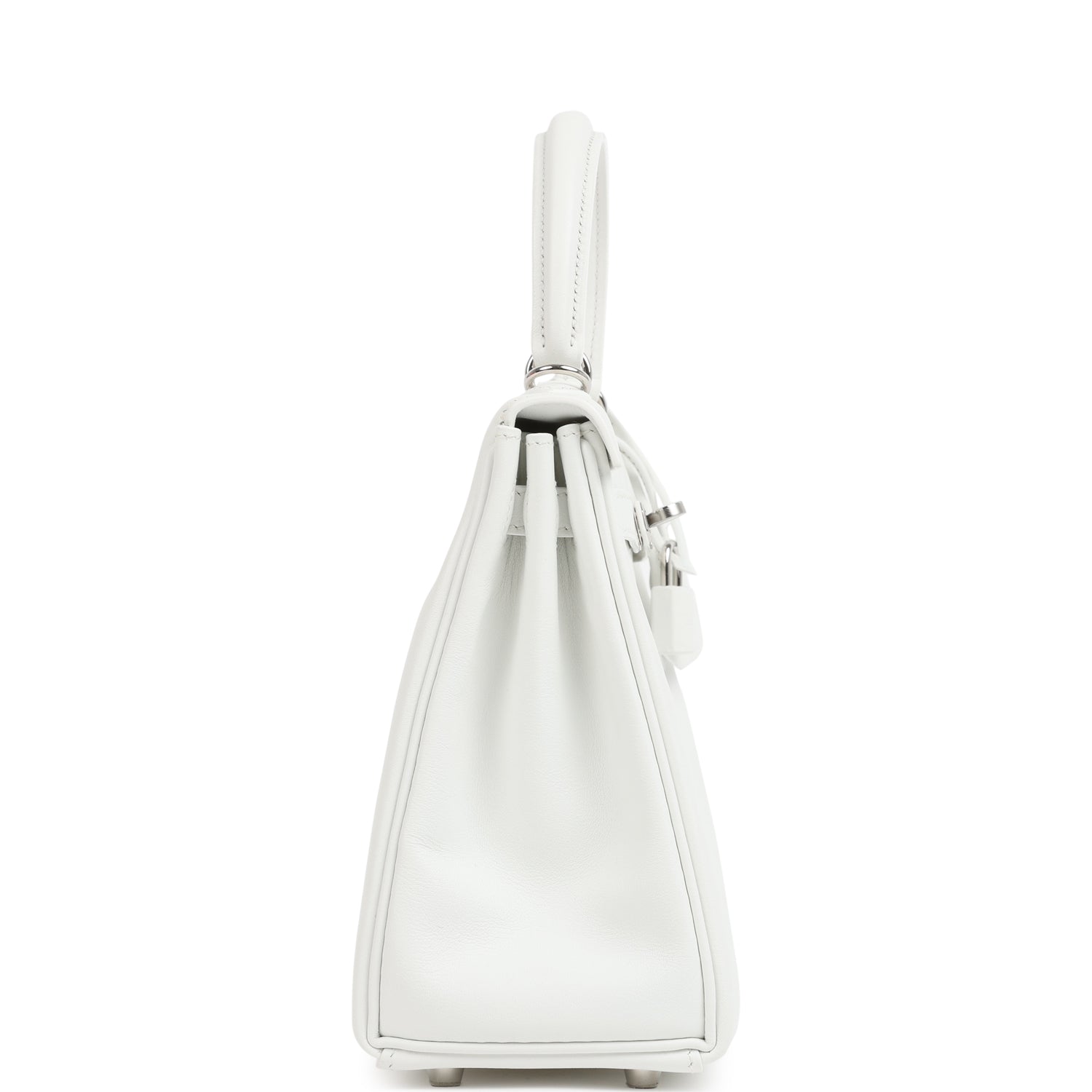 This Kelly. in the Retourne style. is in New White swift leather with palladium hardware and has tonal stitching. front flap. two straps with center toggle closure. clochette with lock and two keys. single rolled handle and an optional shoulder strap.