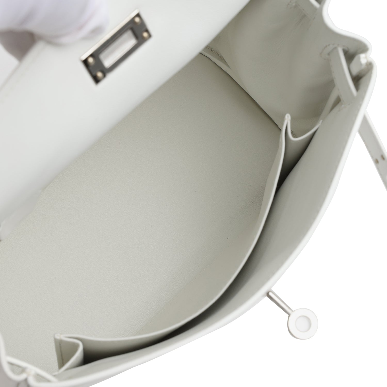 The interior is lined with New White Swift leather and has one zip pocket with an Hermes engraved pull and one open pocket on the opposite side.