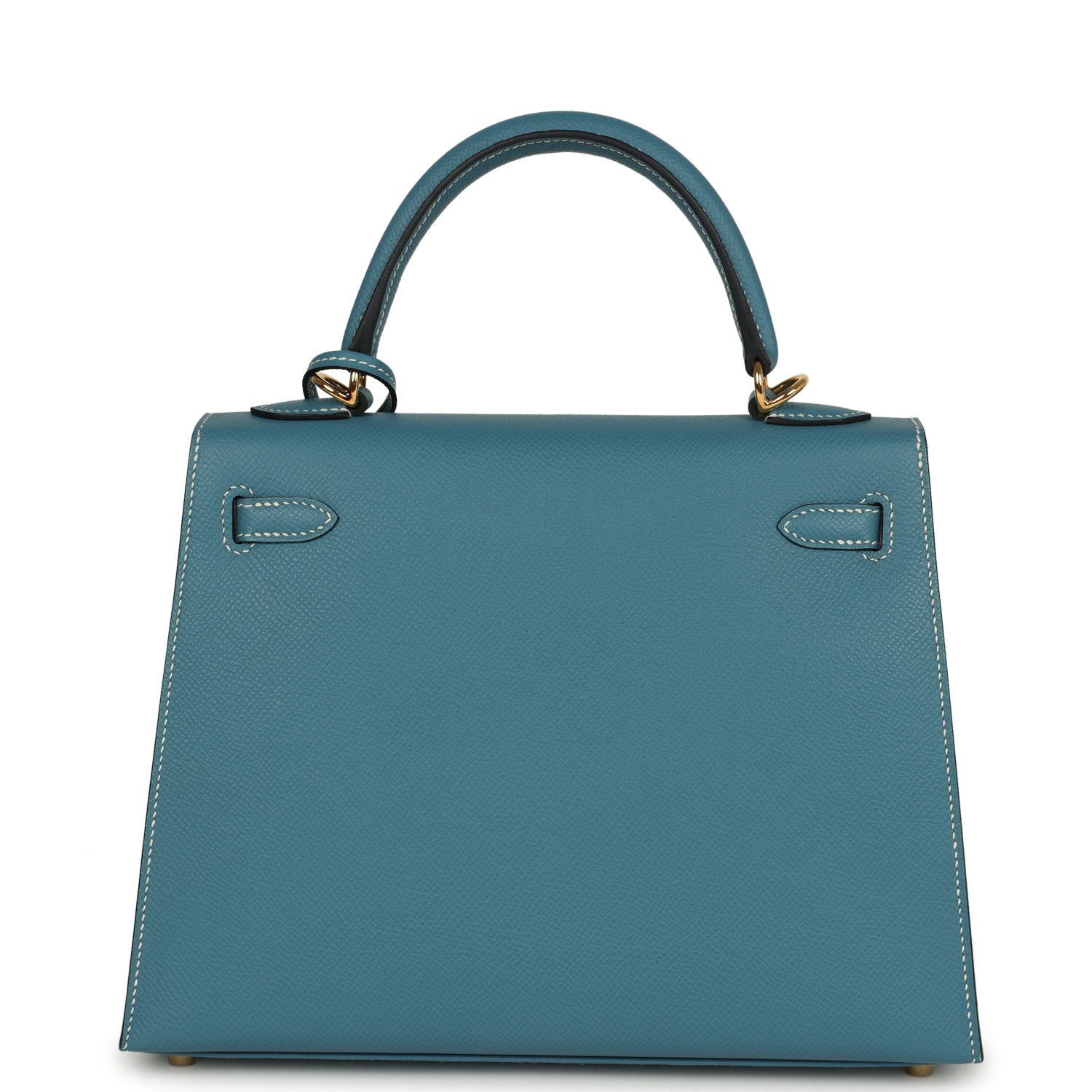 This Kelly. in the Sellier style. is in New Blue Jean epsom leather with gold hardware and has contrast stitching. front flap. two straps with center toggle closure. clochette with lock and two keys a single rolled handle and removable shoulder strap.