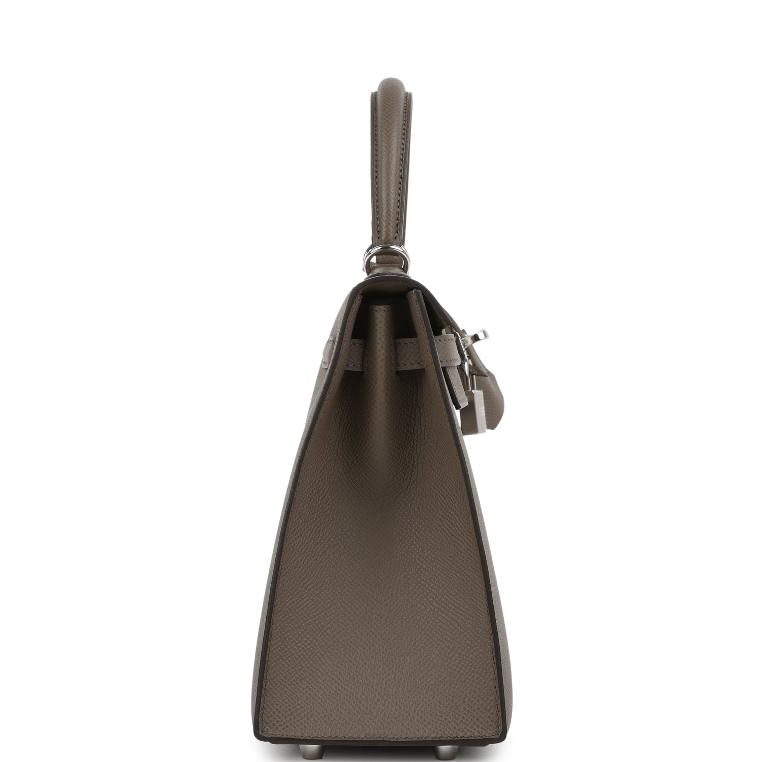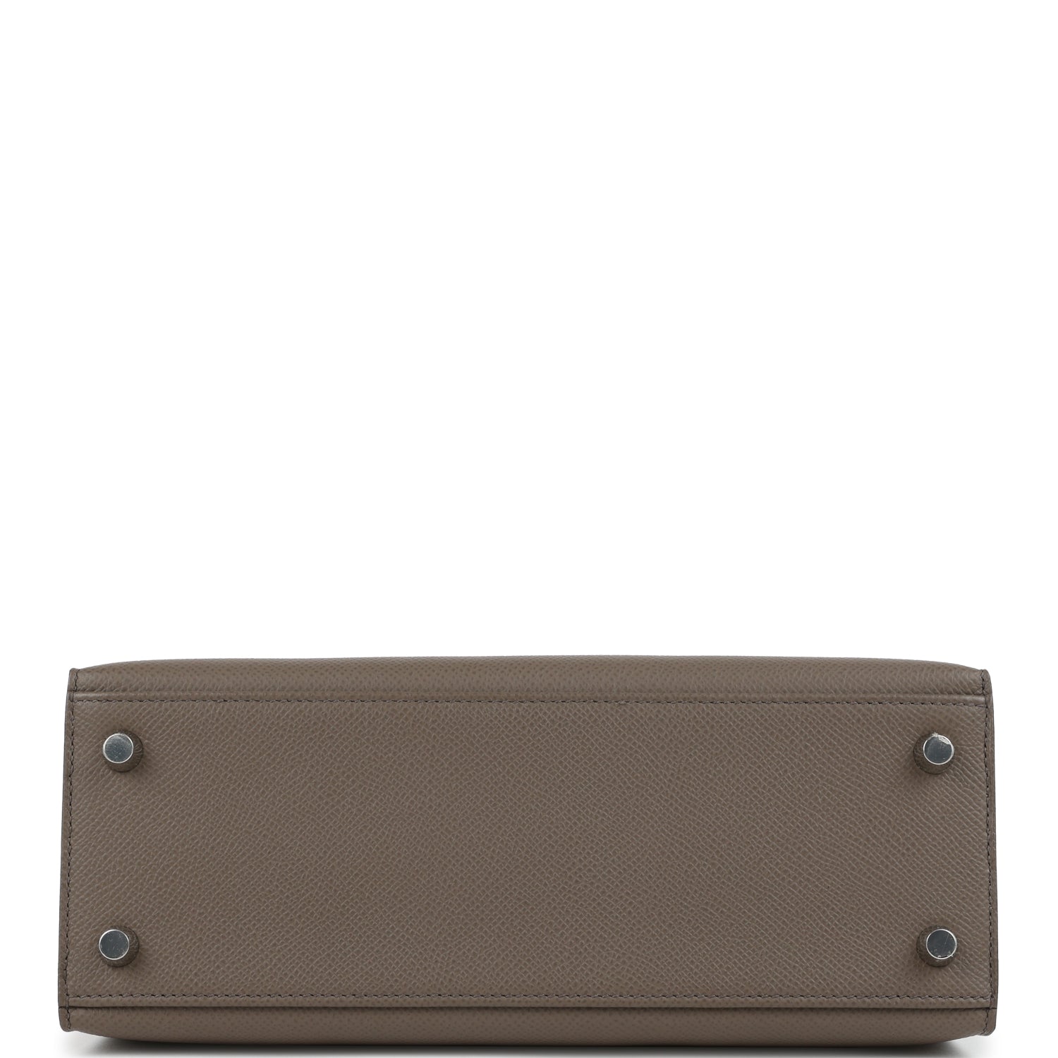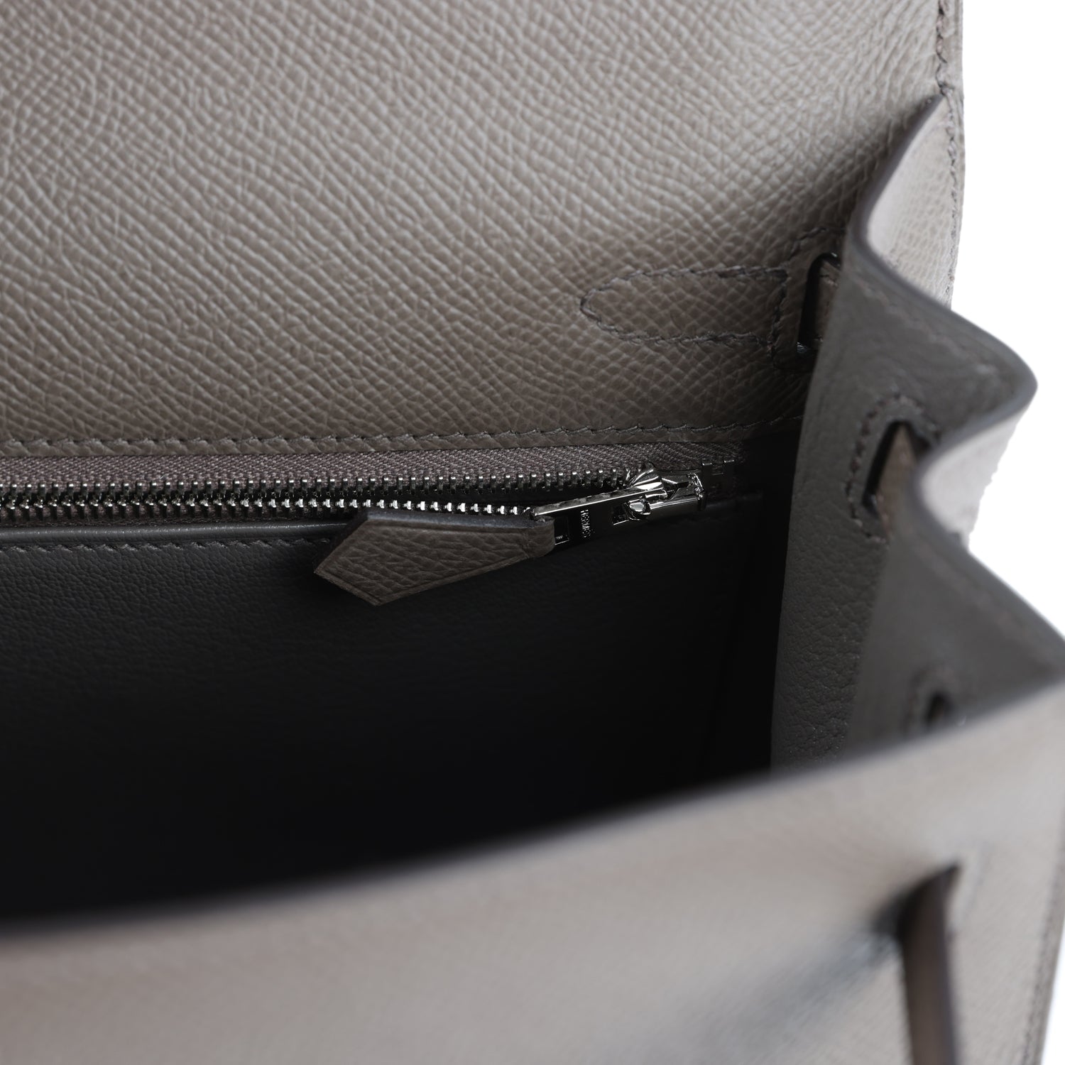 This Kelly. in the Sellier style. is in Gris Etain epsom leather with palladium hardware featuring tonal stitching. front flap with two straps. front toggle closure. clochette. lock. two keys. a removable shoulder strap and single rolled handle.